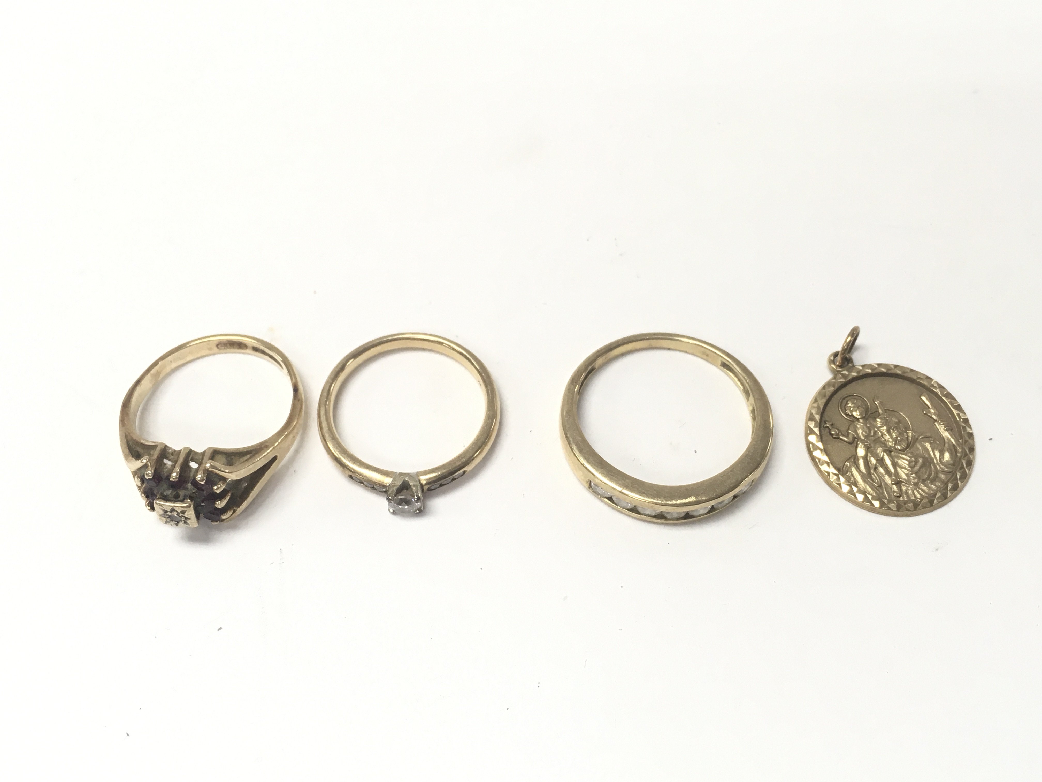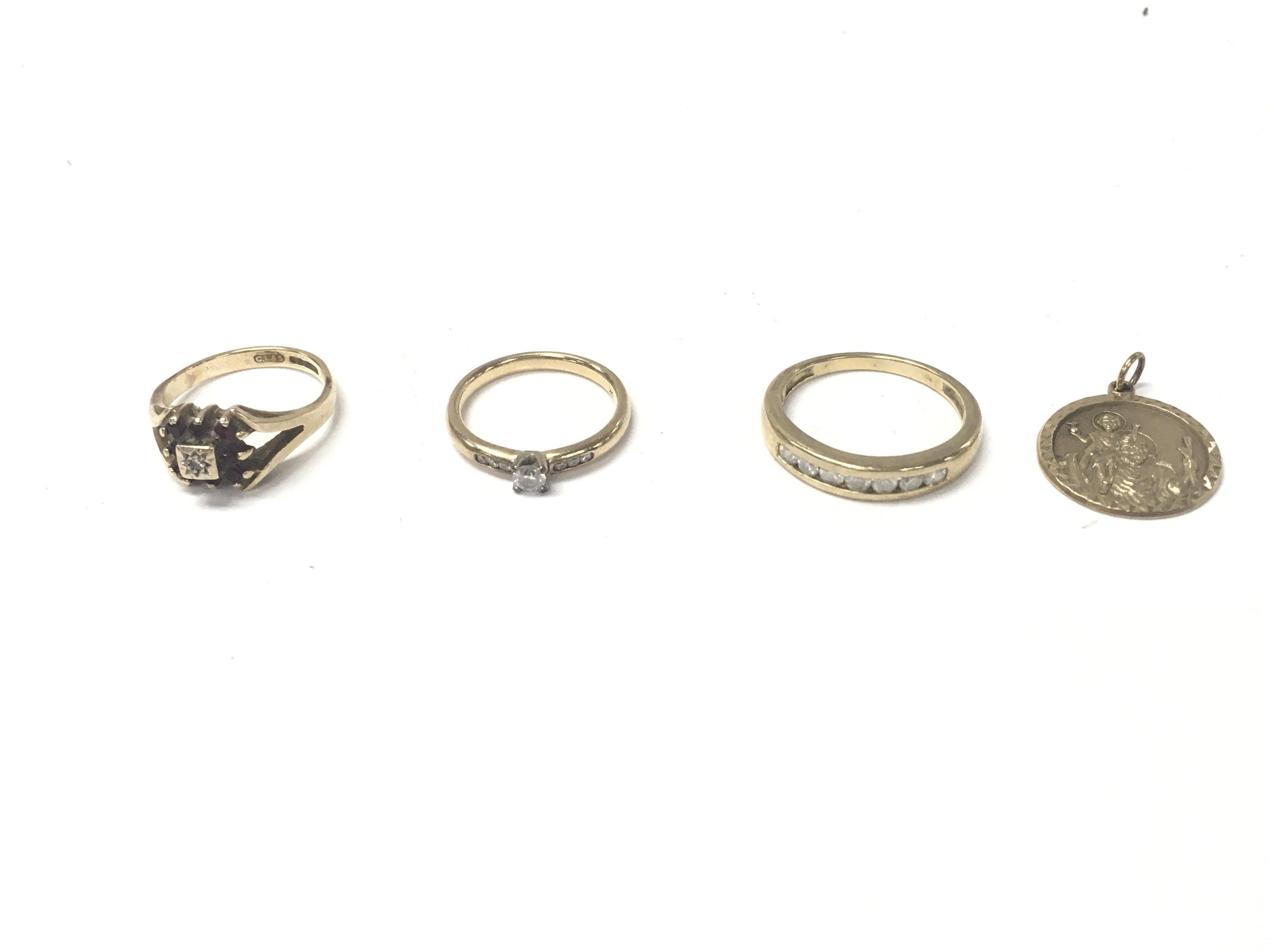 Three 9ct gold rings set with assorted stones and a 9ct st Christopher. Total weight 10.7g. Two rings size L and one S