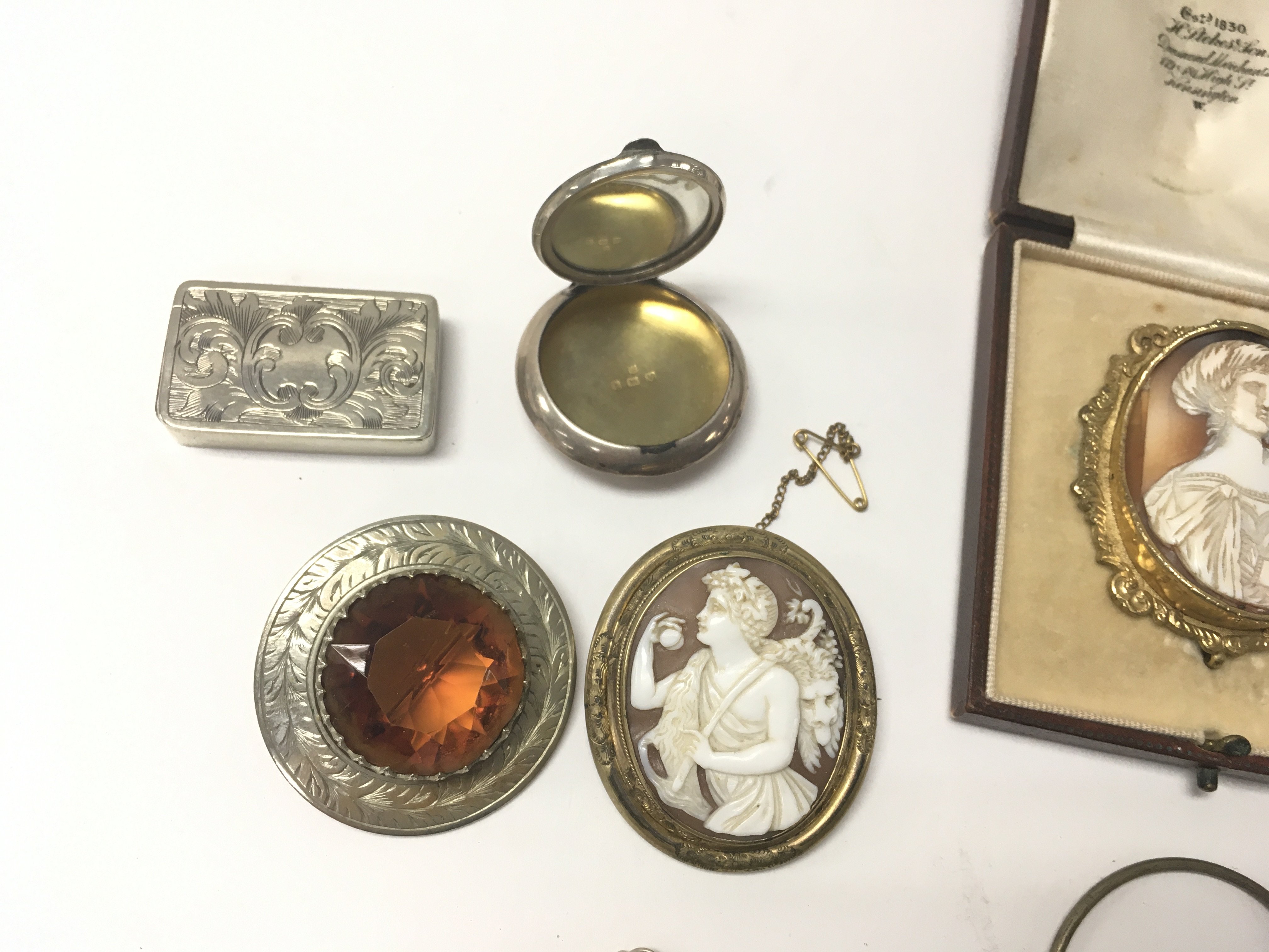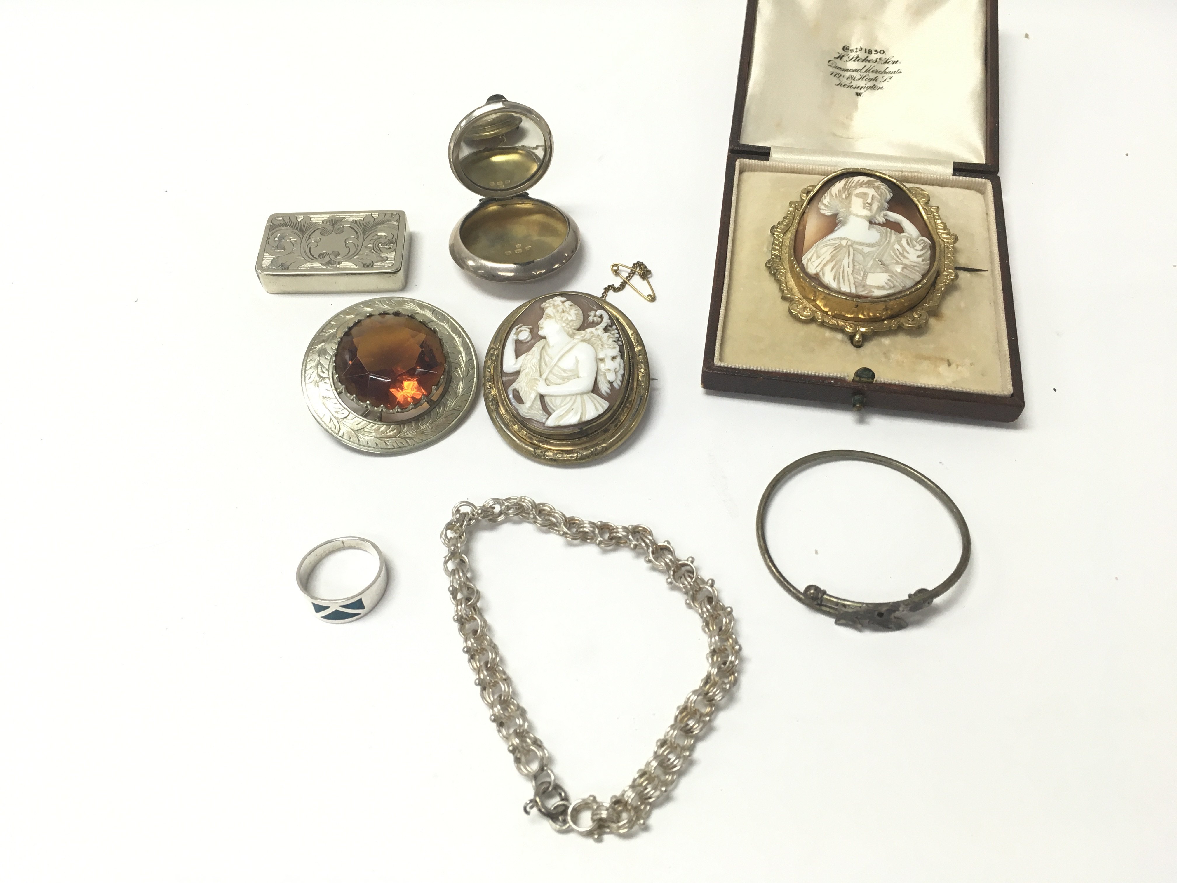 A collection of costume jewellery including vintage cameos and silver items. Postage B