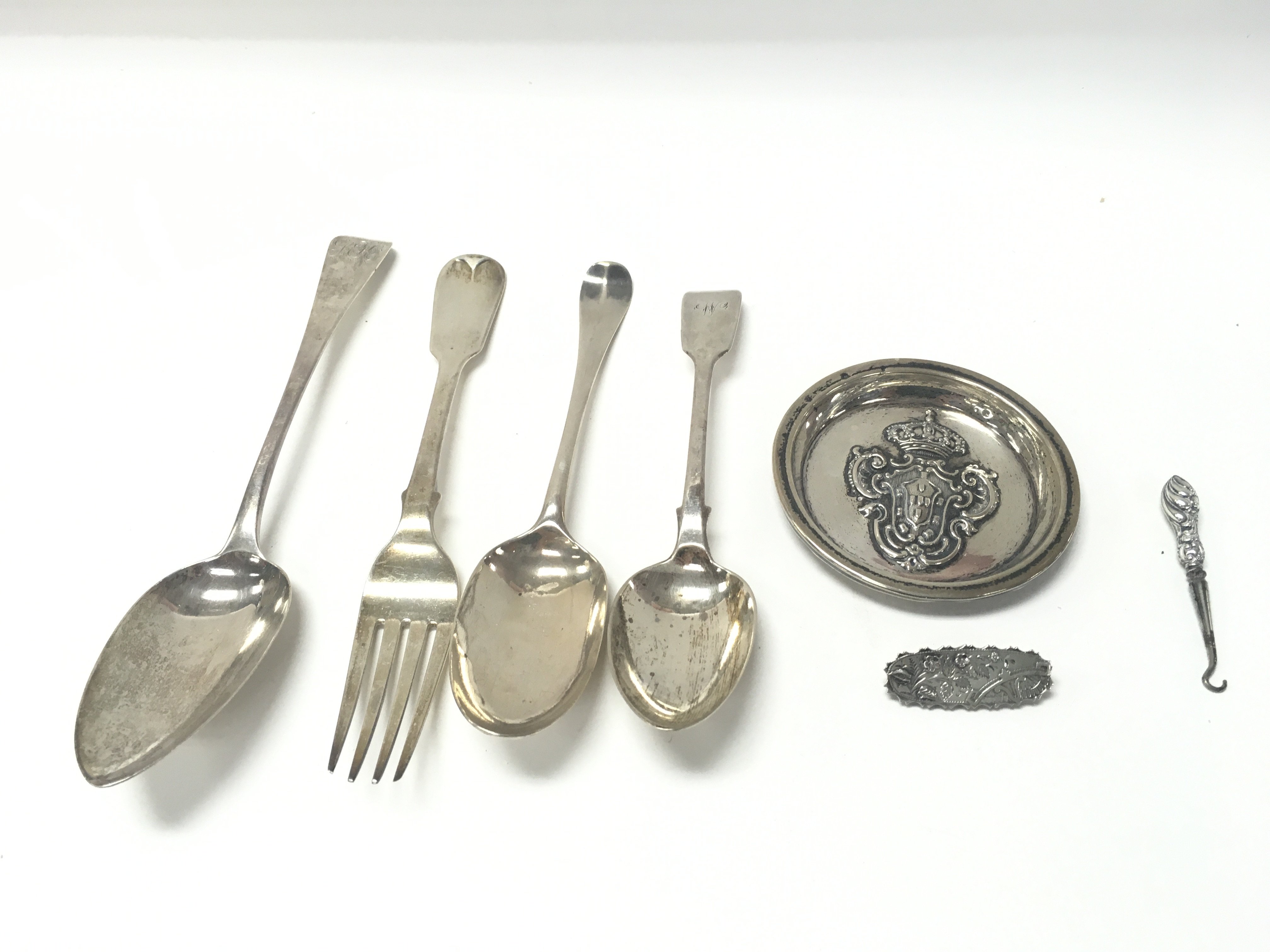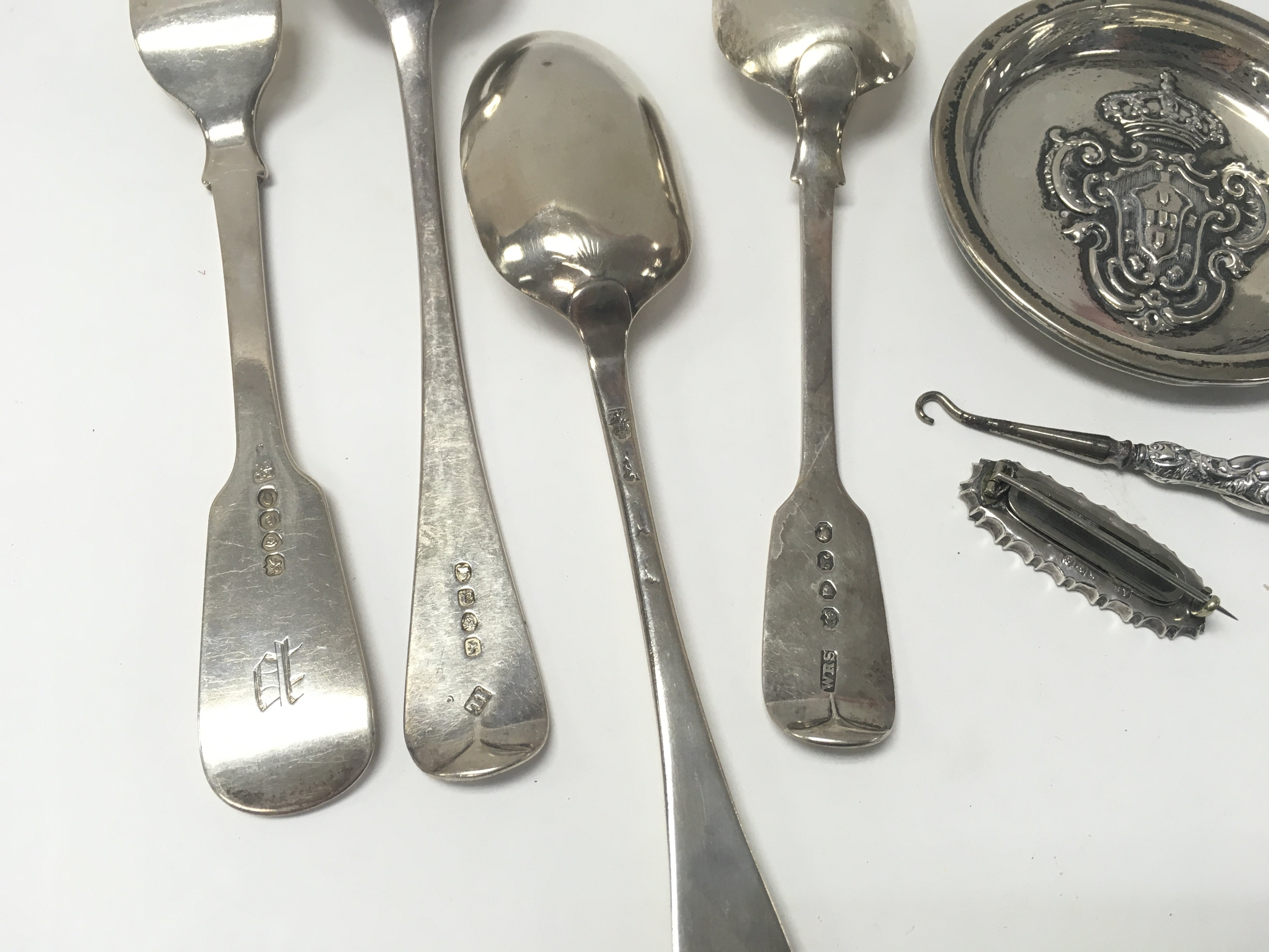 A collection of assorted silver items including cutlery button hook etc. approx 250g