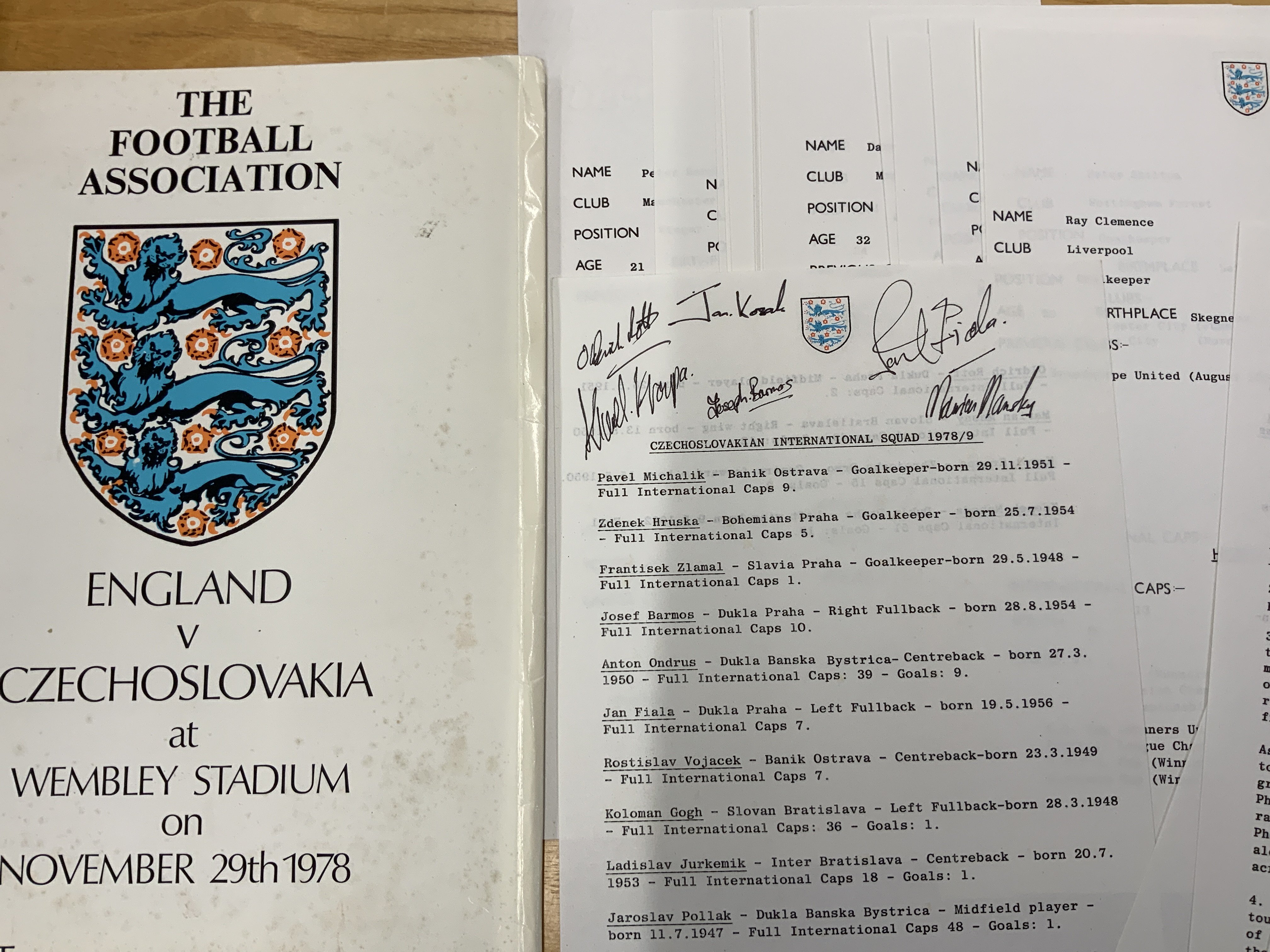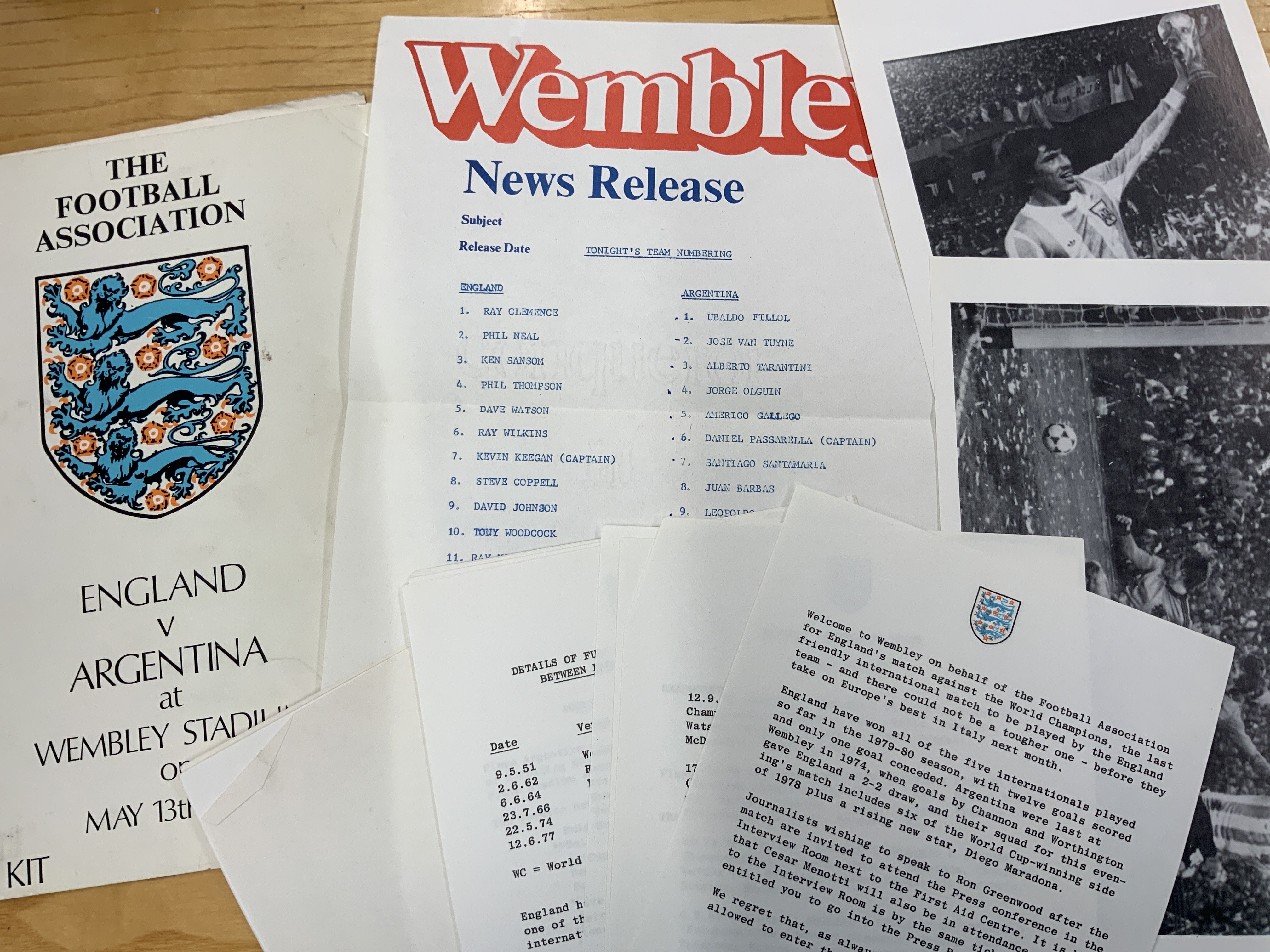 England Football Press Kits 1978 - 1980: For matches v 1978 Czechoslovakia and 1980 Argentina. Argentina pack has lots of information regarding the hotels they are staying at and the times of training sessions, colour team sheet few pictures etc. Czechoslovakia has information and autographs of 6 players from Czechoslovakia. (2)