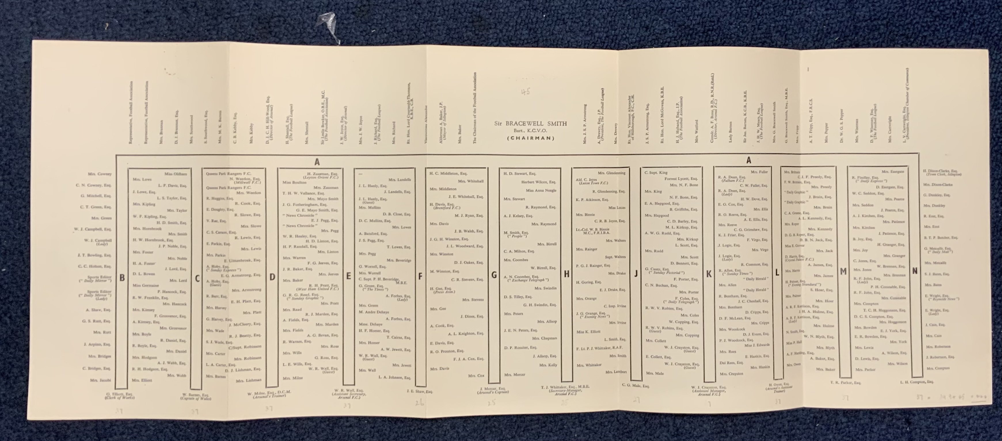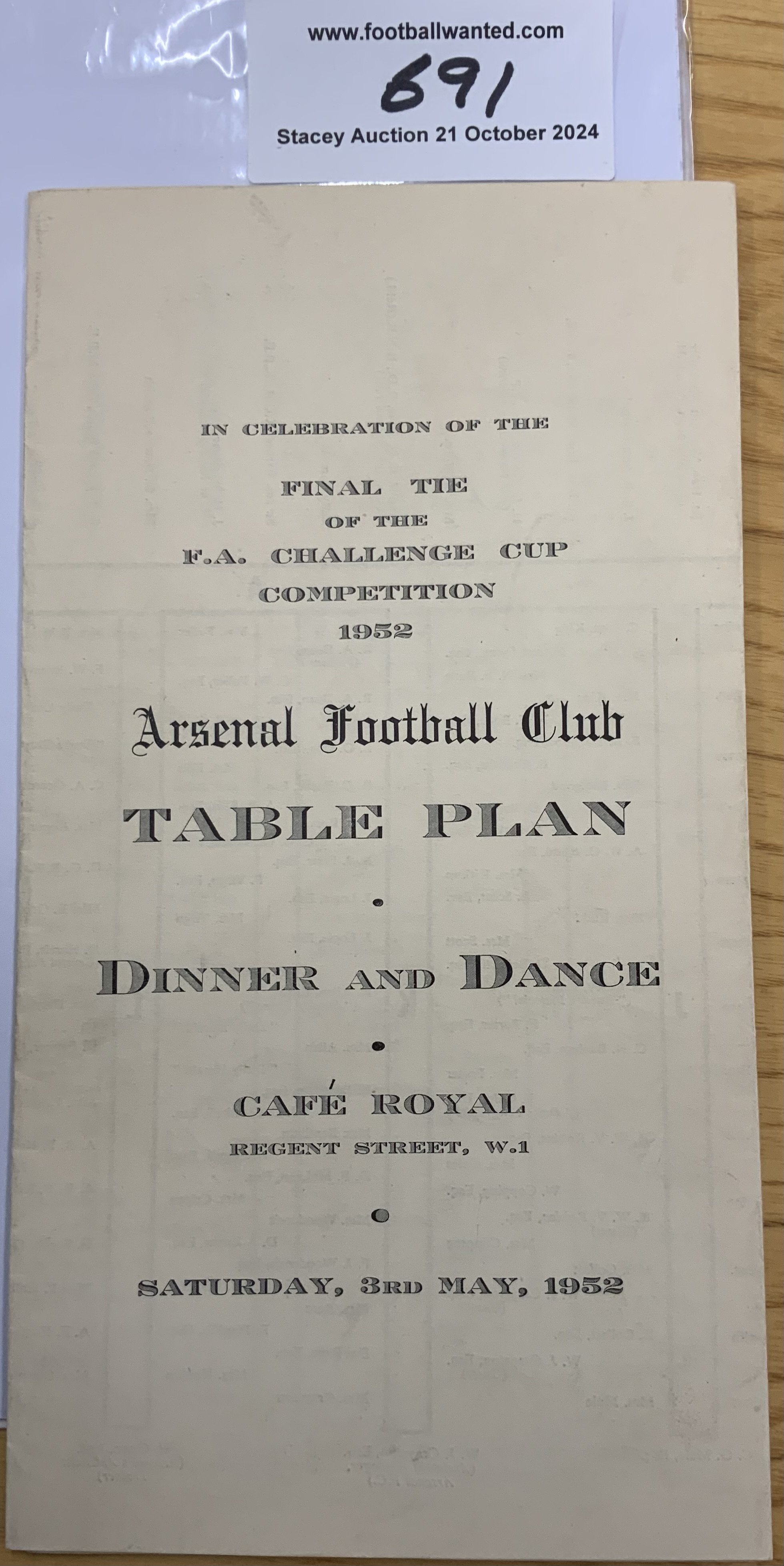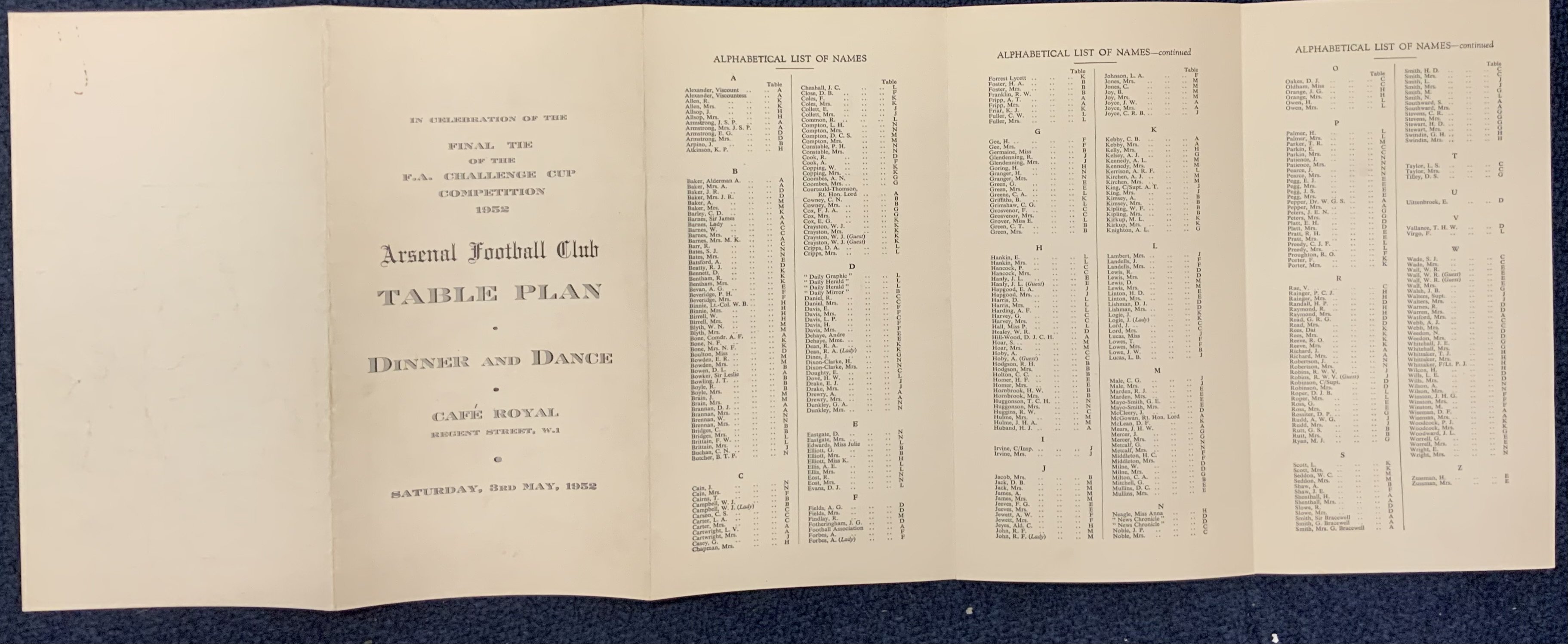1952 Arsenal FA Cup Final Table Plan: List of guests and table plan the evening of the FA Cup final at the Cafe Royal. Good condition with one small tear.