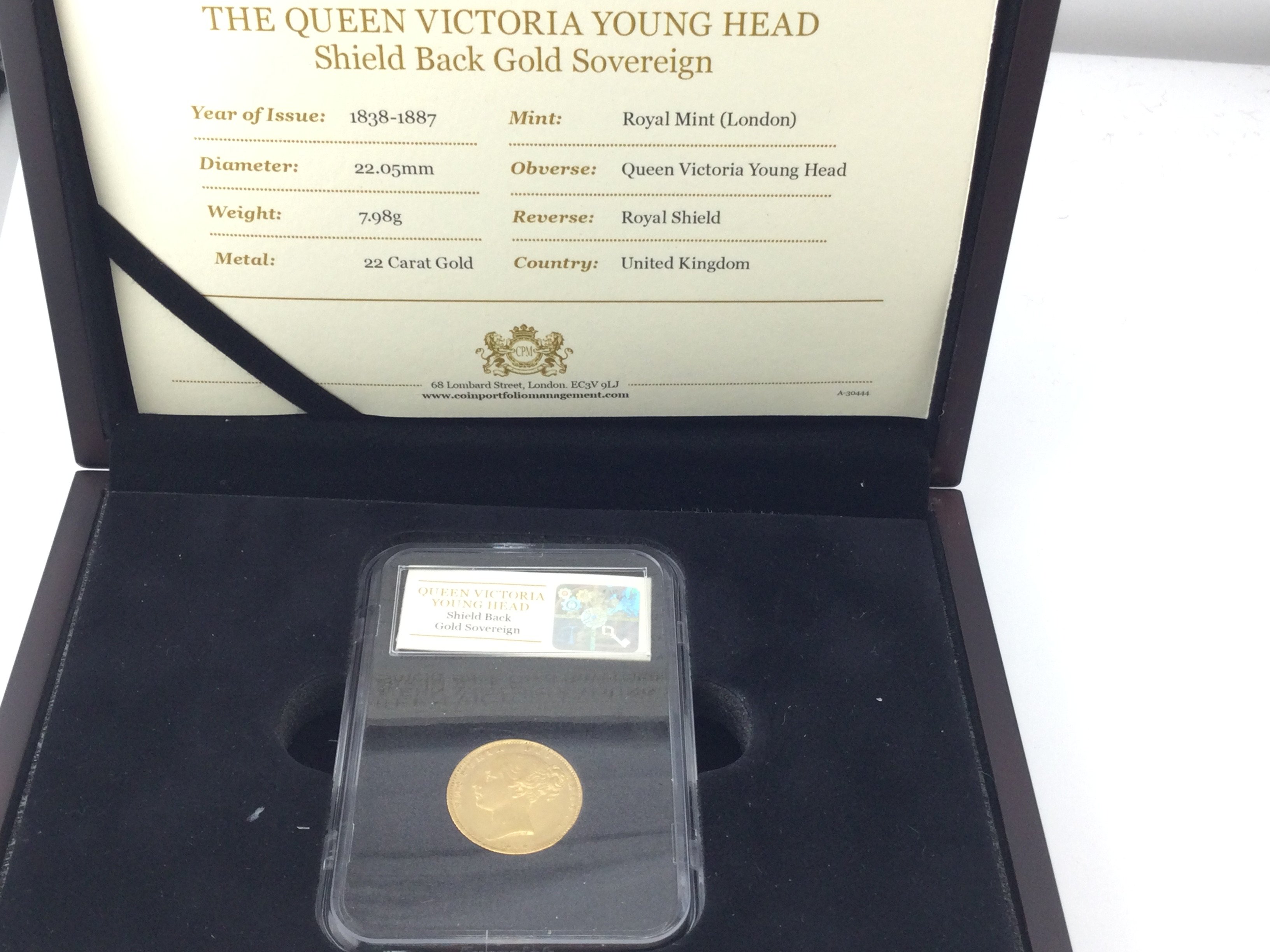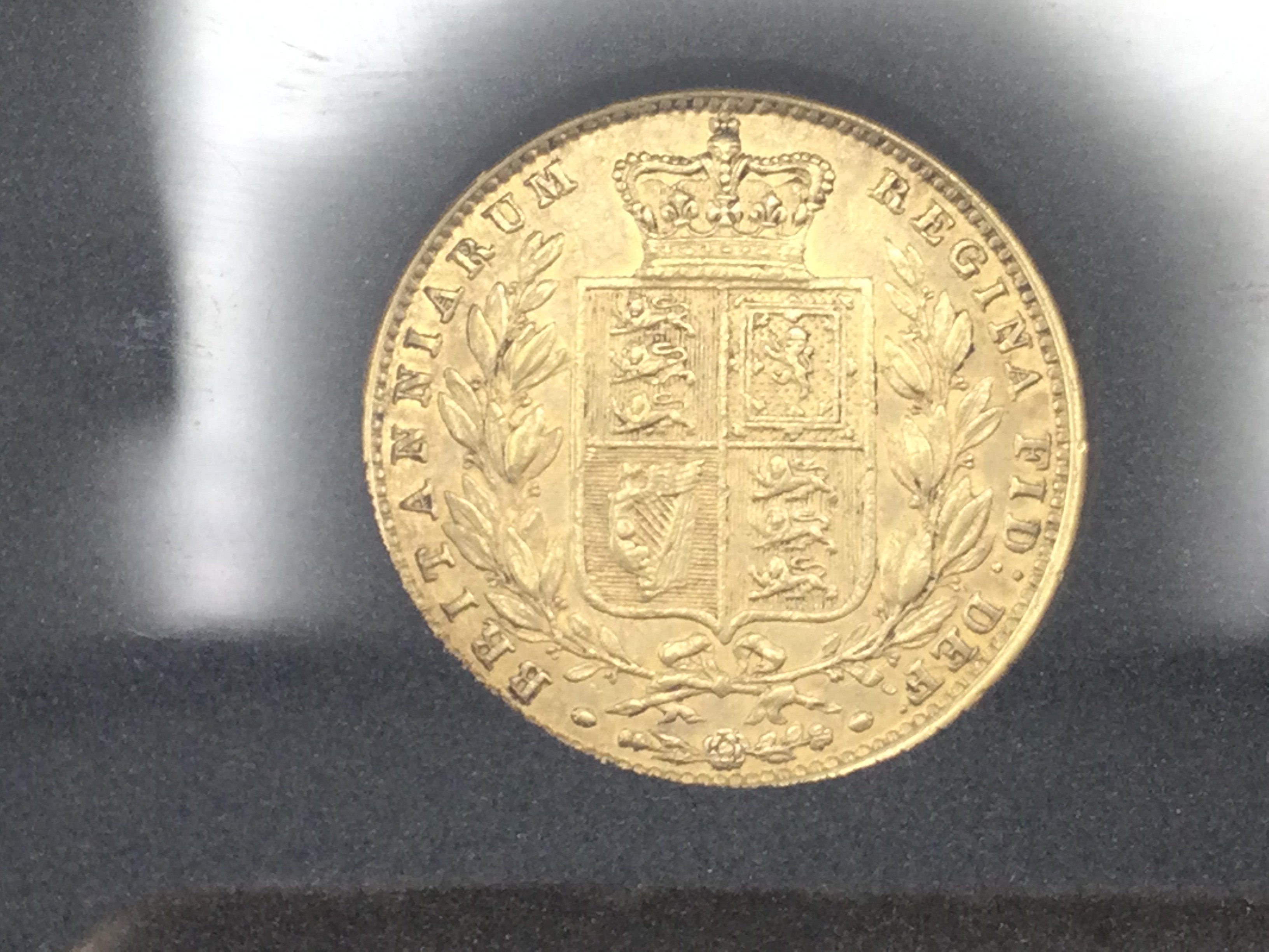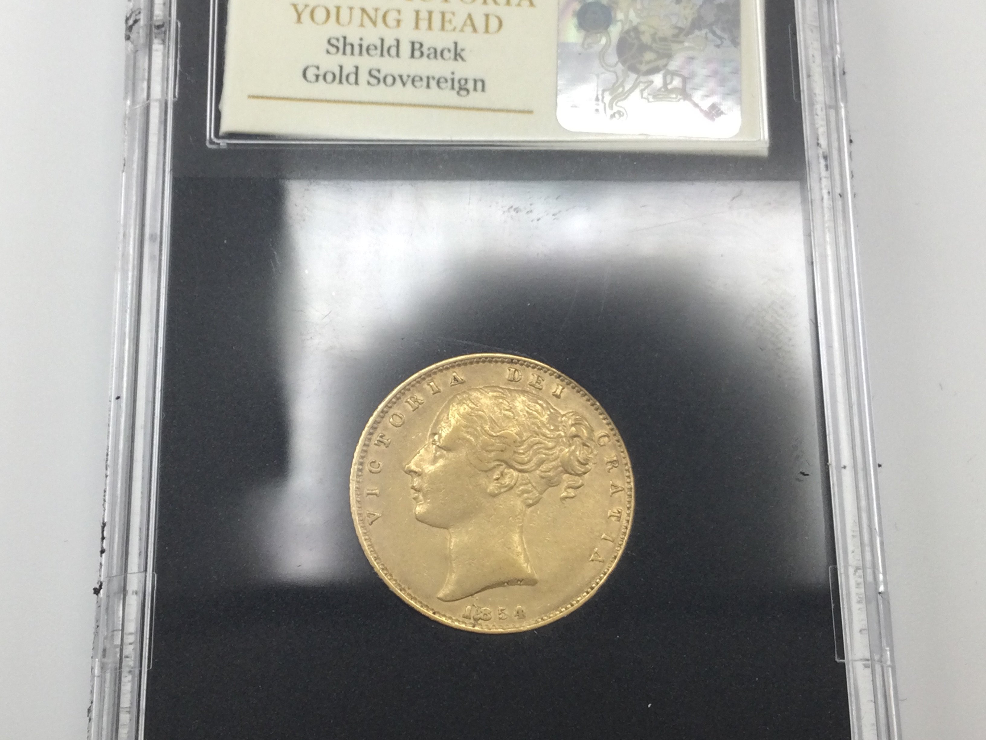 A 1854 young head Victoria shield back full sovereign with box and COA.