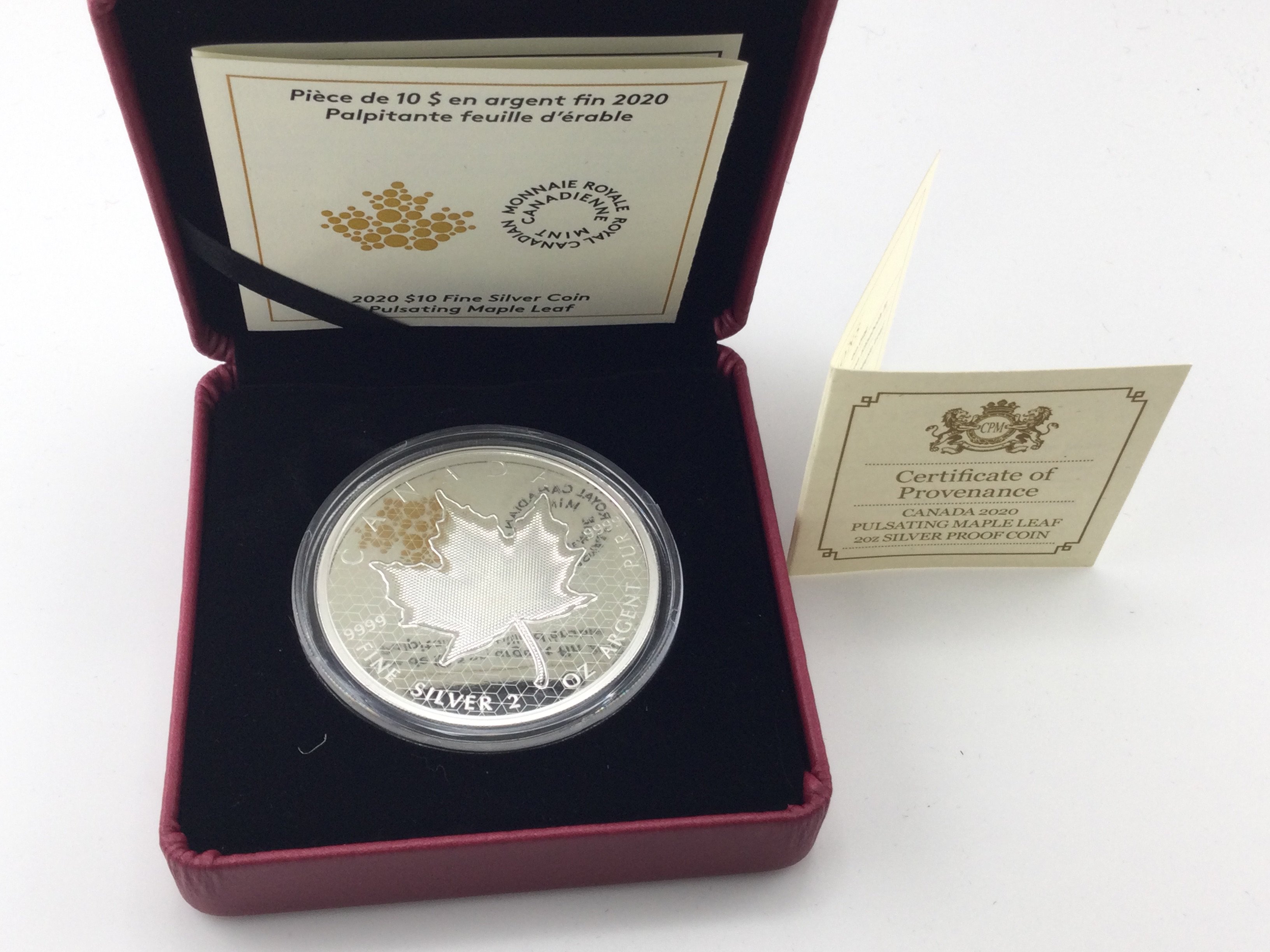A Canada 2020 Pulsating maple leaf 2oz silver proof coin with case and COA. Postage A