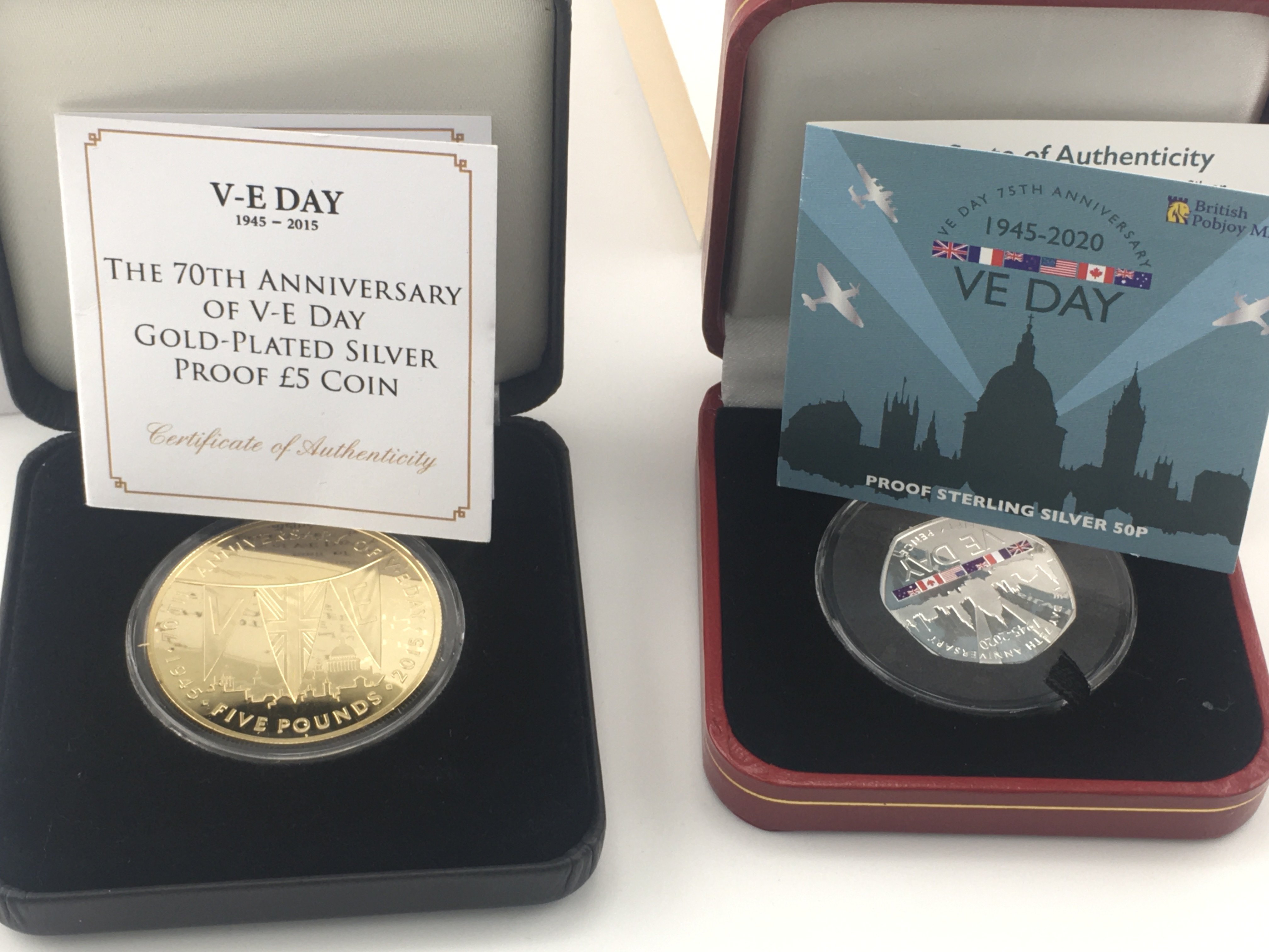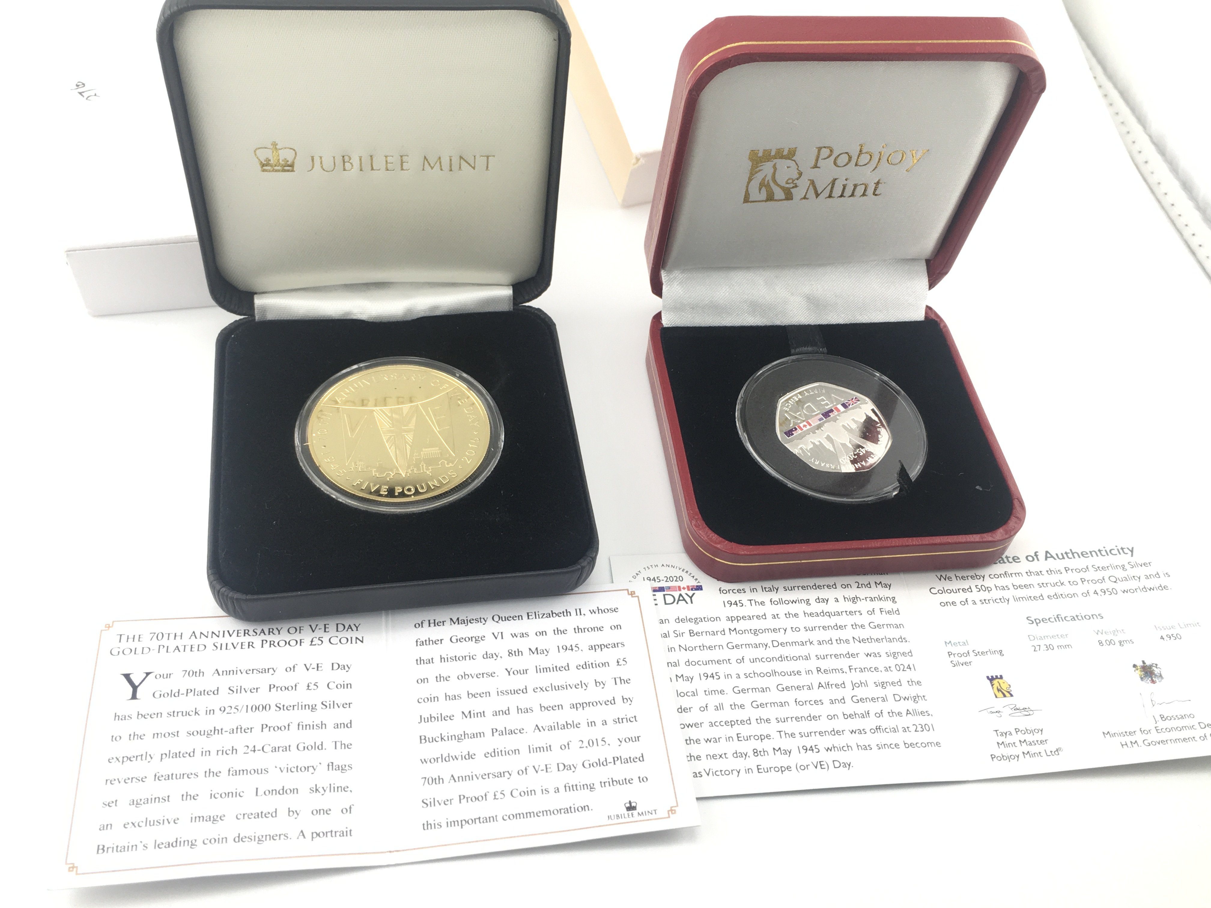 Gold plated silver proof £5 coin and a proof sterling silver 50p coin. Postage B