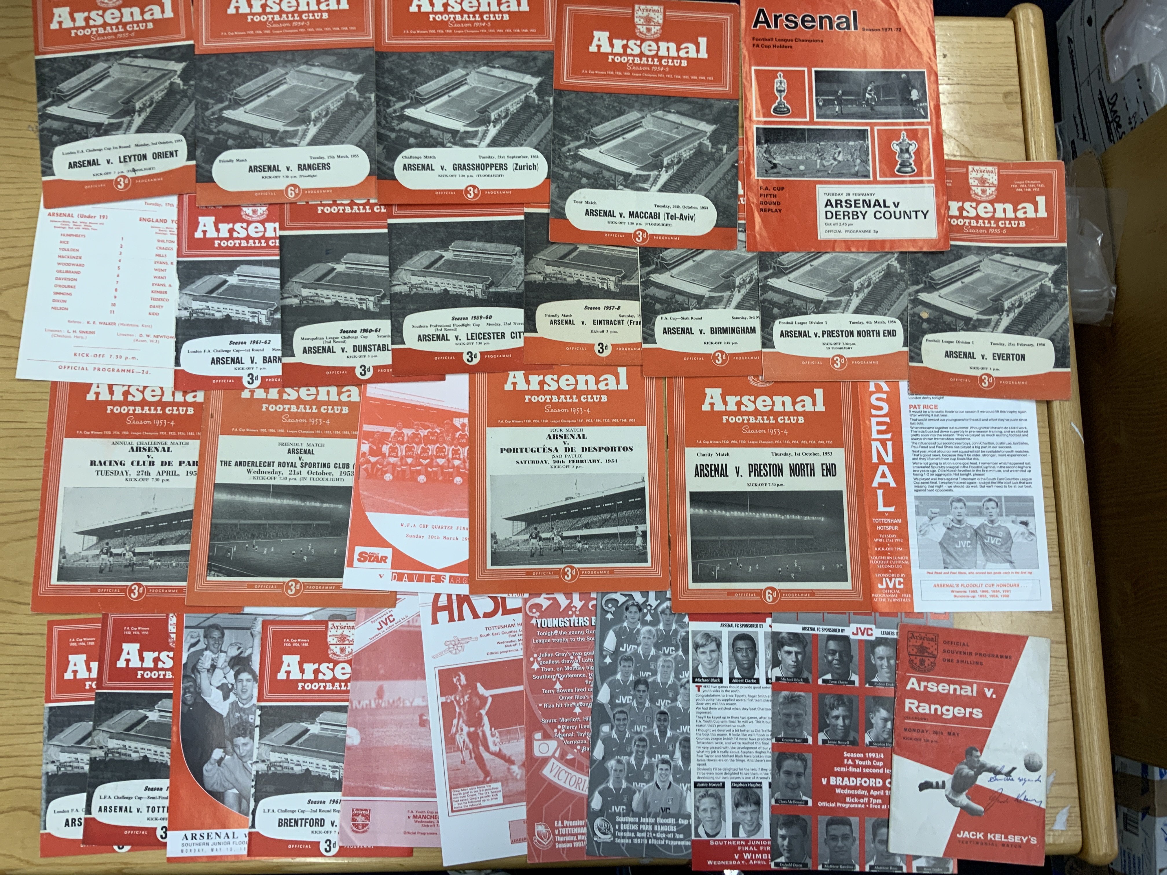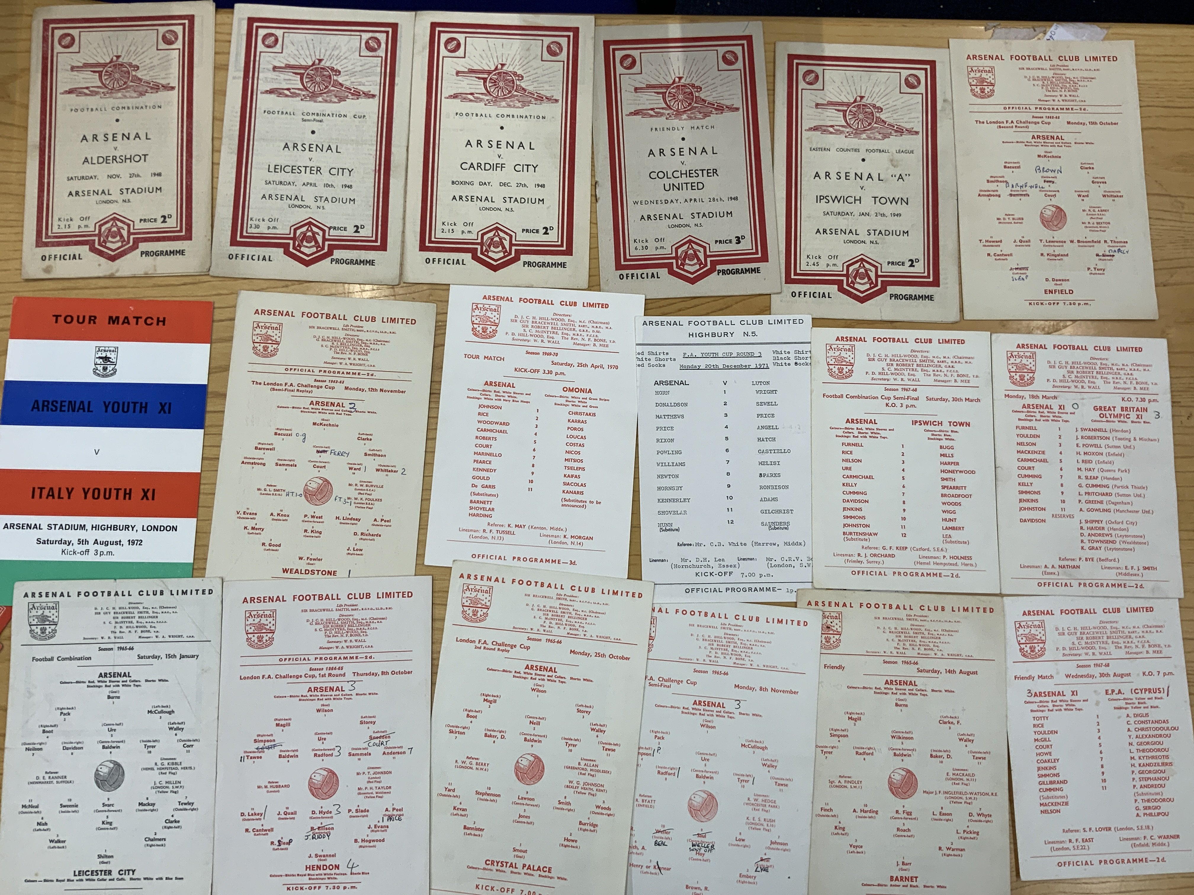 Arsenal Home Reserve + Youth Football Programmes: Must view wide variety to include 48/49 A Team v Ipswich, 66/67 U19 v England Youth. There are 5 single sheet 1960s London FA Cup matches, Kelsey testimonial signed by him, south East Counties, Youth Cup, SJFC. Some harder to obtain friendlies include 65/66 Barnet, 67/68 Cyprus team, 69/70 Omonia, 47/48 Colchester, 53/54 Portuguesa, Anderlecht, 3 reserve matches in 1948 and much more. Good condition. (45+)