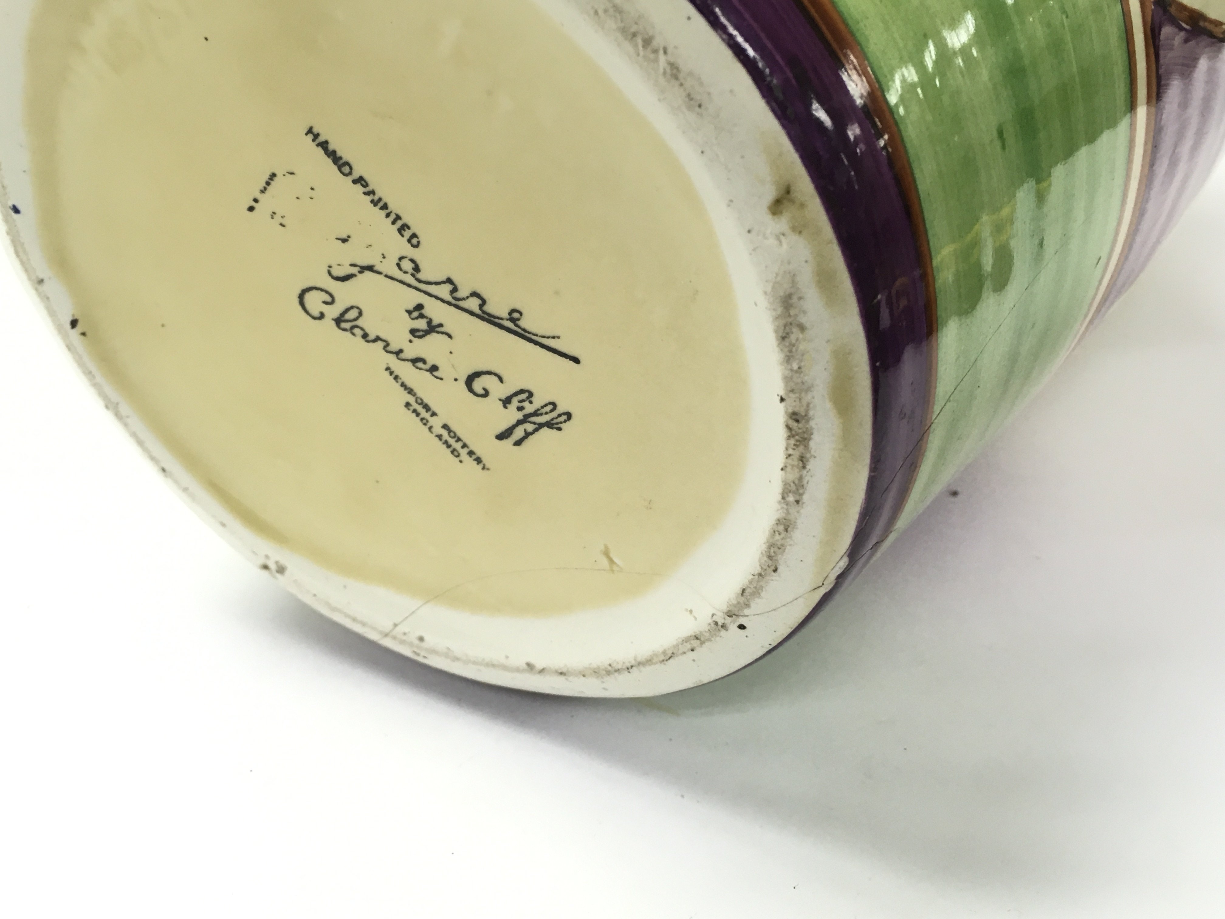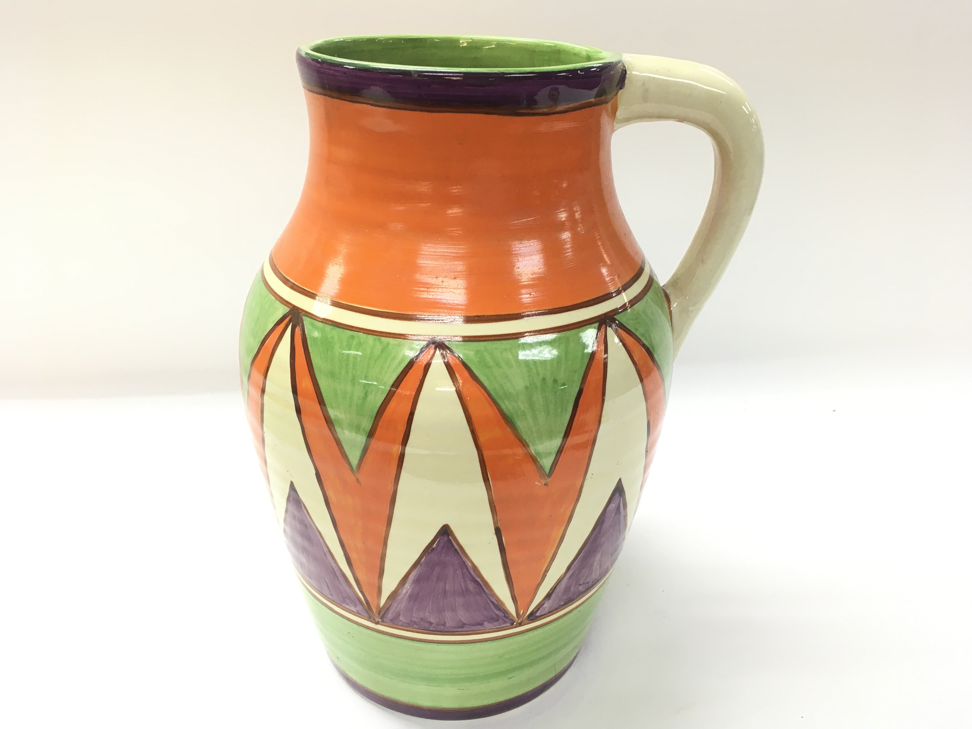 A large Clarice Cliff jug. Note damage shown in pictures. 30cm tall and 23cm wide approximately