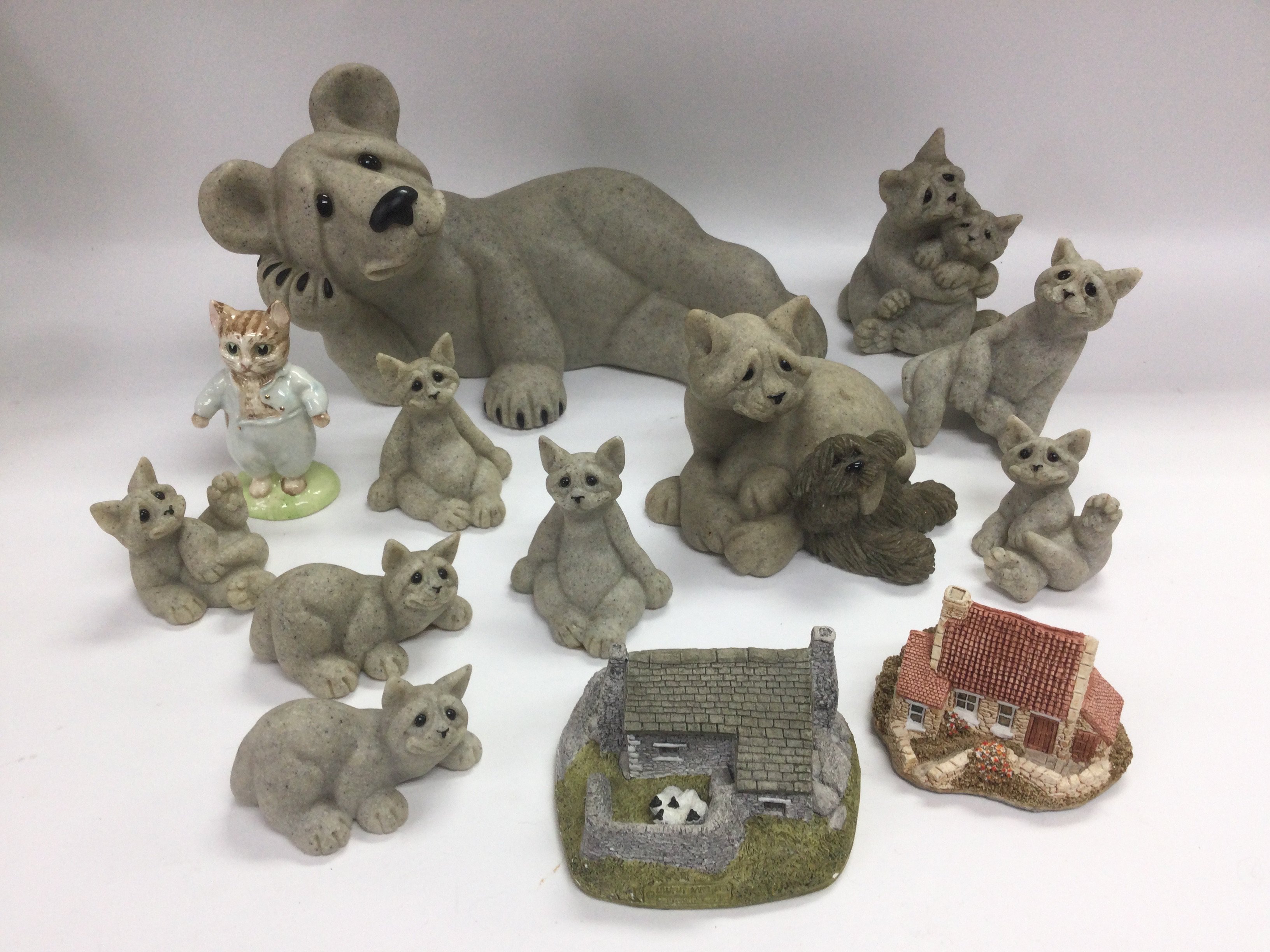 A collection of ceramics comprising a Royal Crown Derby paperweight in the form of a cat, various Quarry Critter figures etc. Shipping category D.
