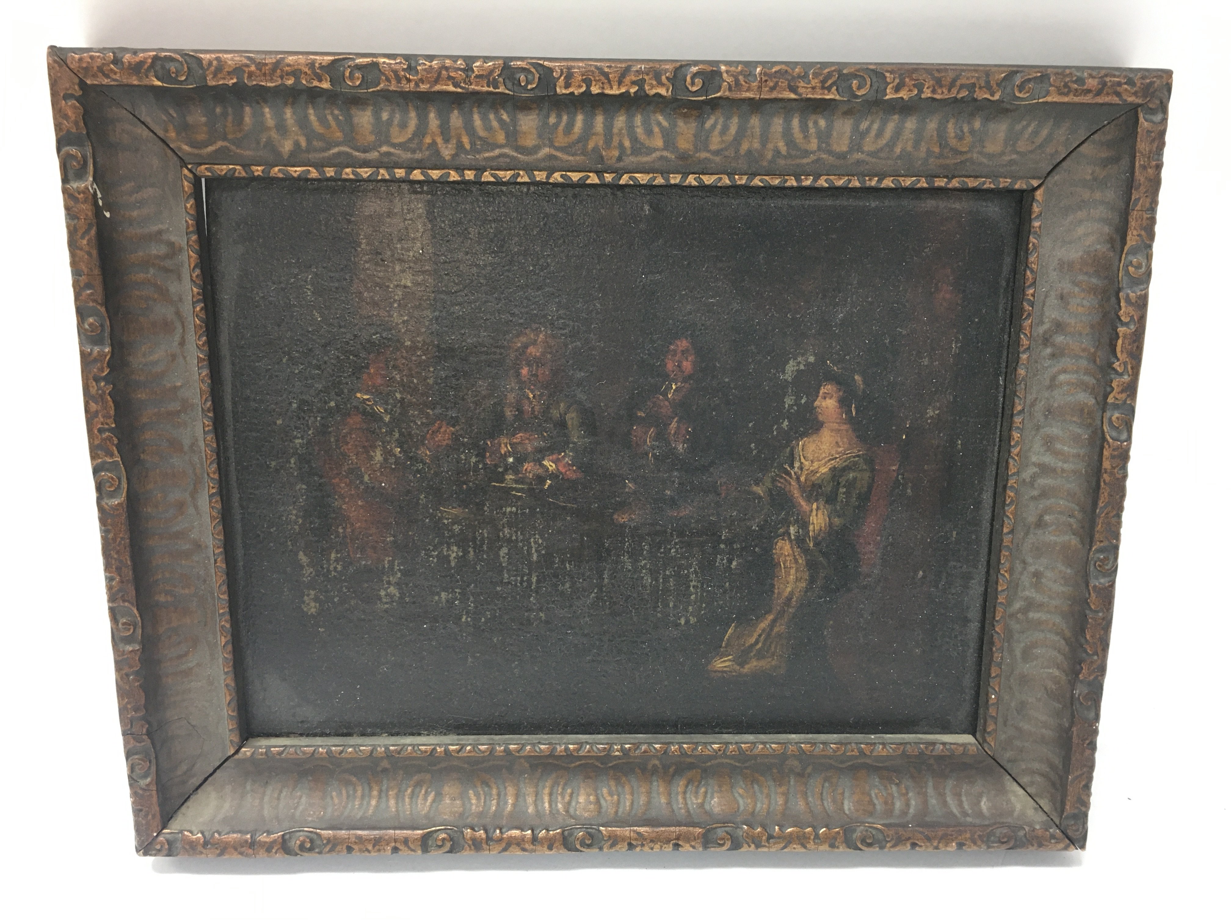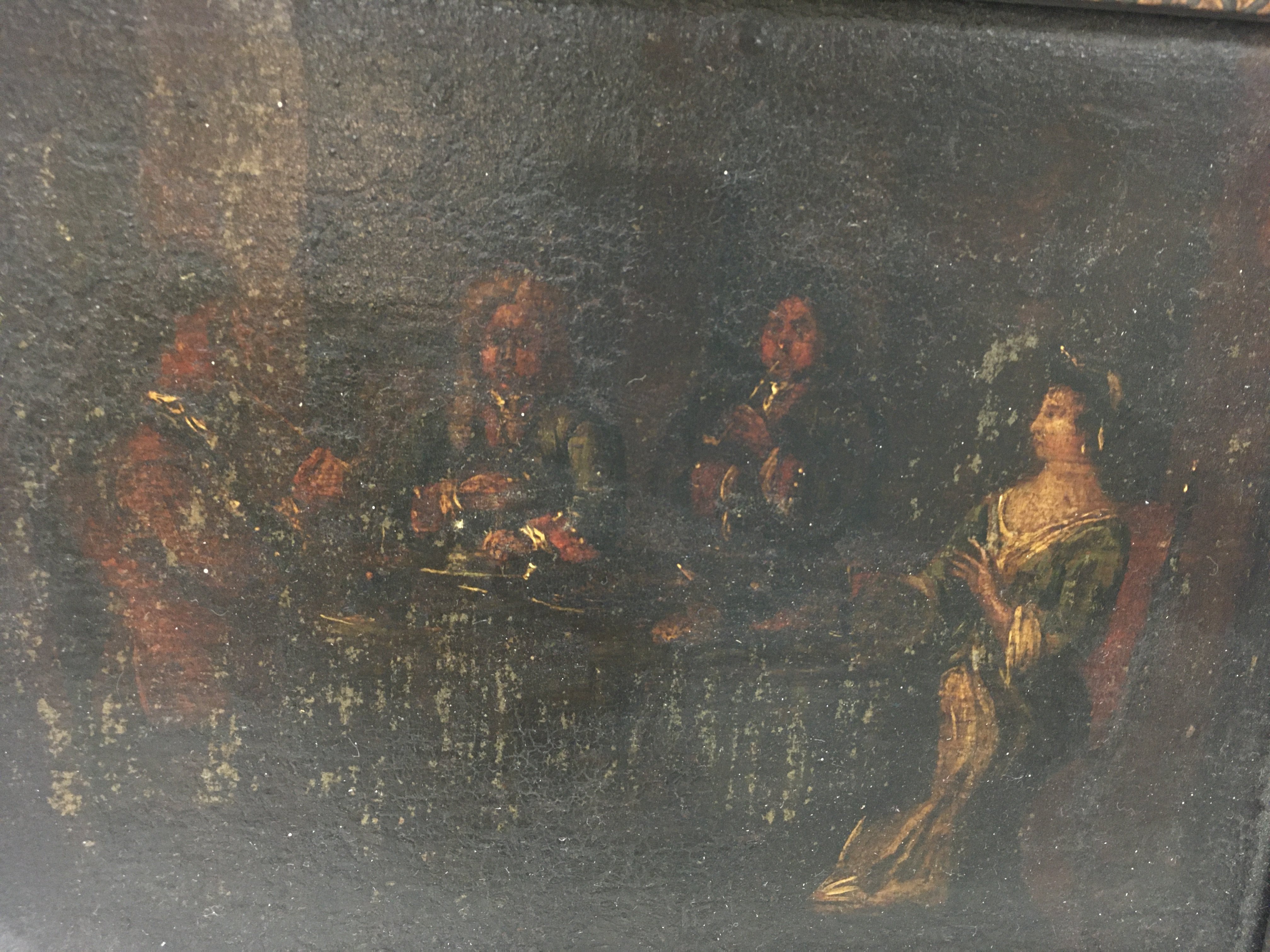 A small 18th century oil painting on panel of figures in an interior. 24x19cm approximately.