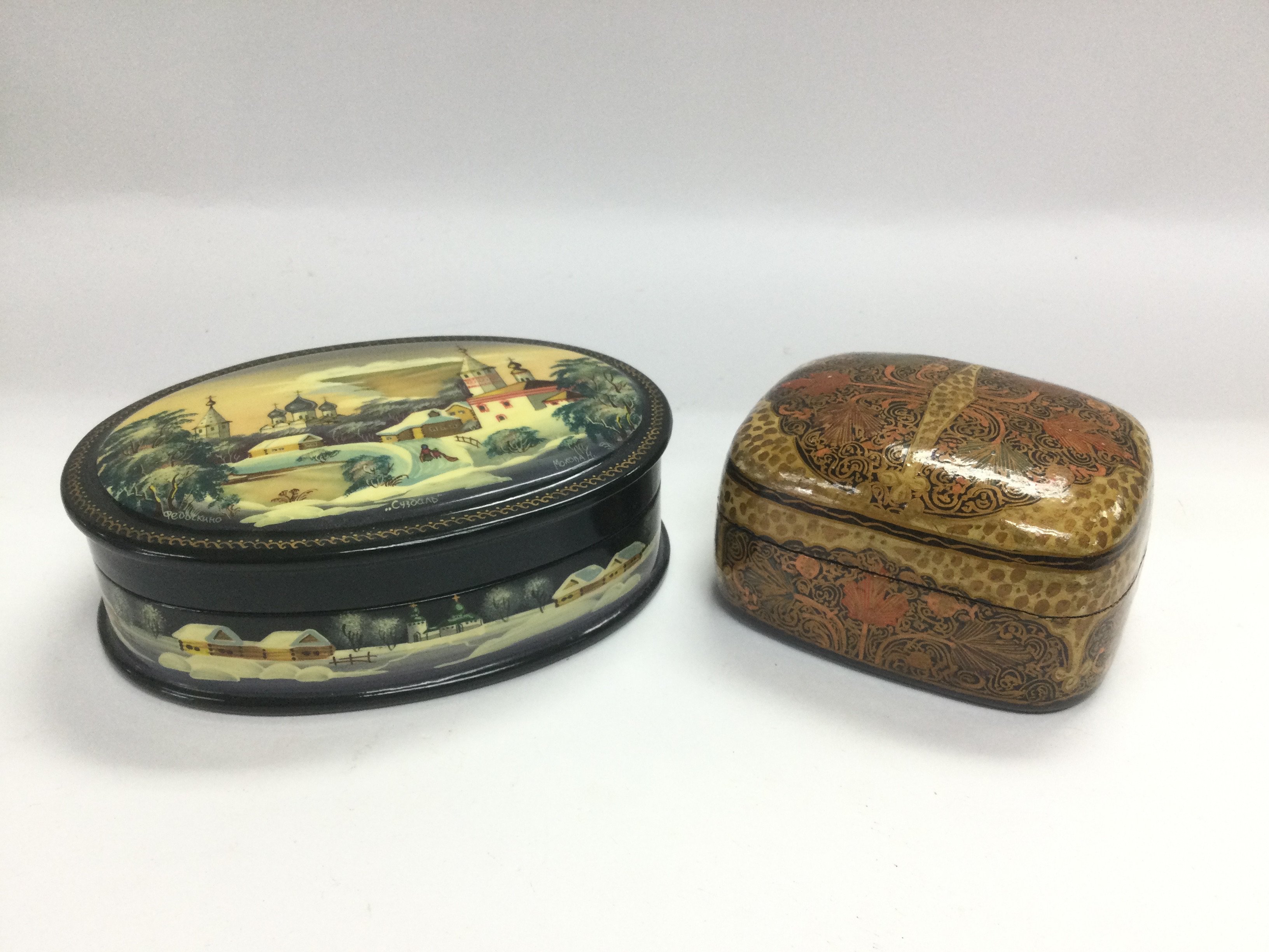 A Russian lacquered box and one other, largest length approx 13cm. Shipping category B.