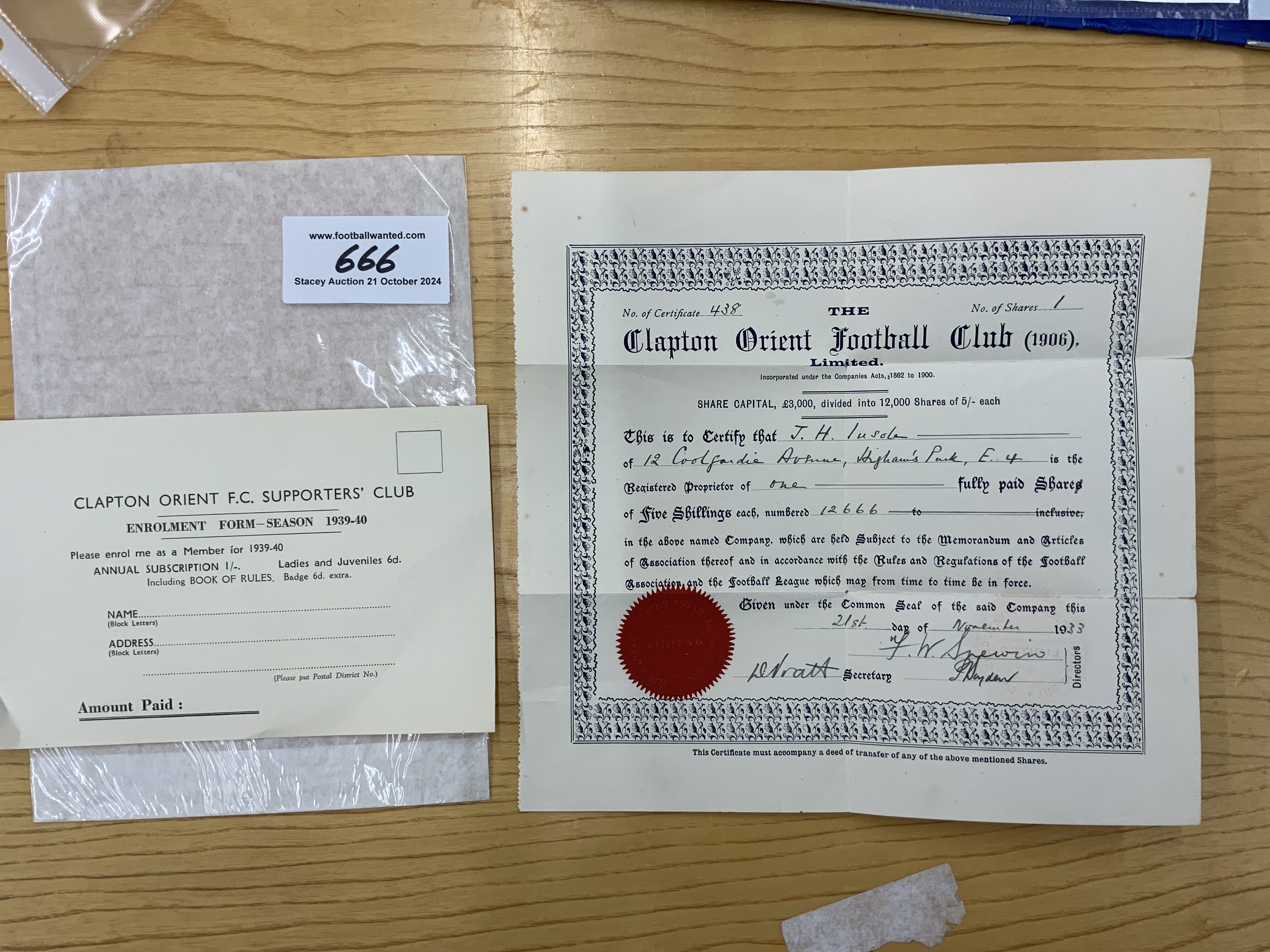 Clapton Orient 1933 Football Share Certificate: Attractive share certificate purchased by Doug Insoles father in good condition with small tear. C/W an unwritten supporters club enrolment receipt for this rare and disbanded season of 39/40. Would look great framed. (2)