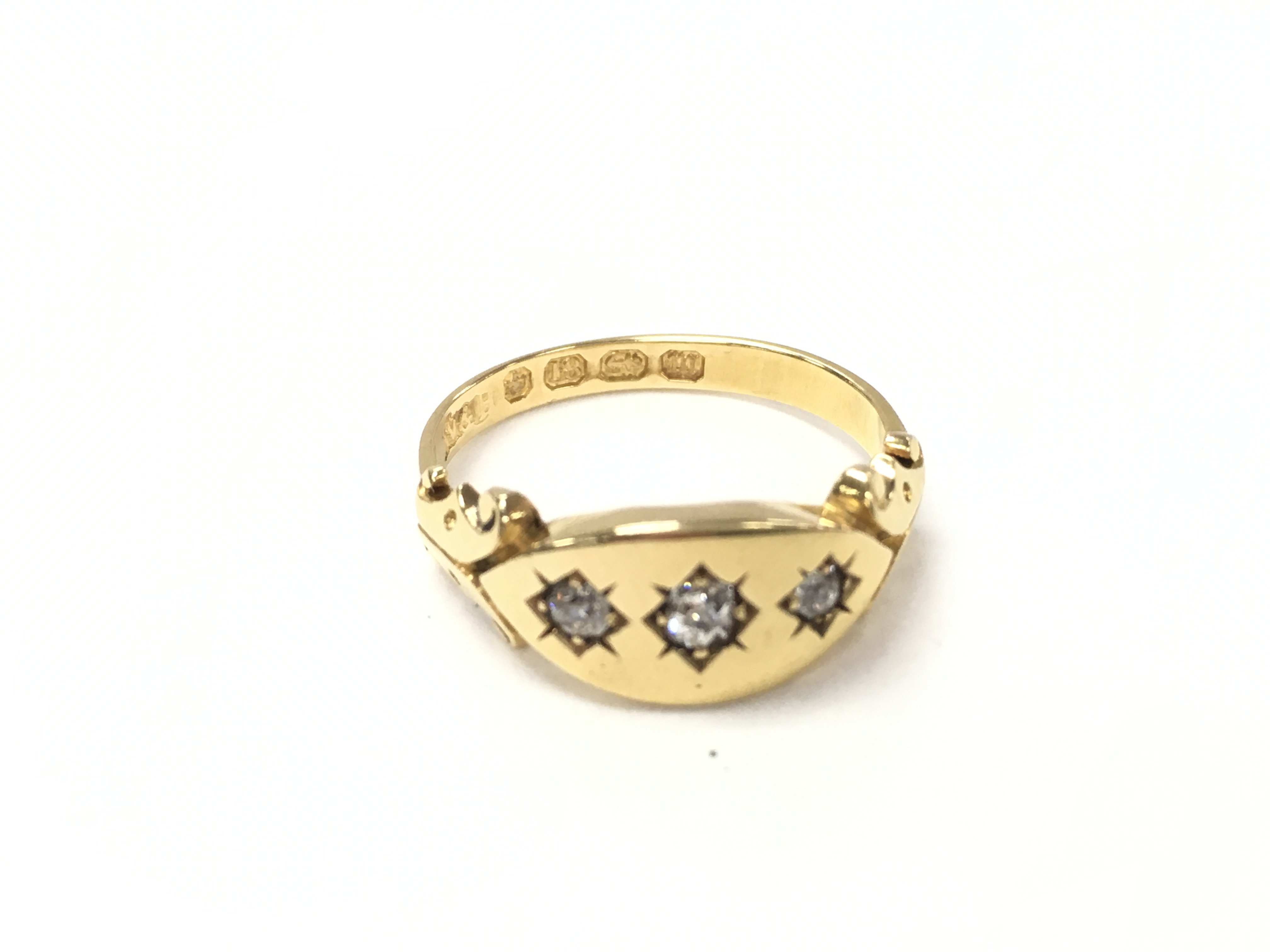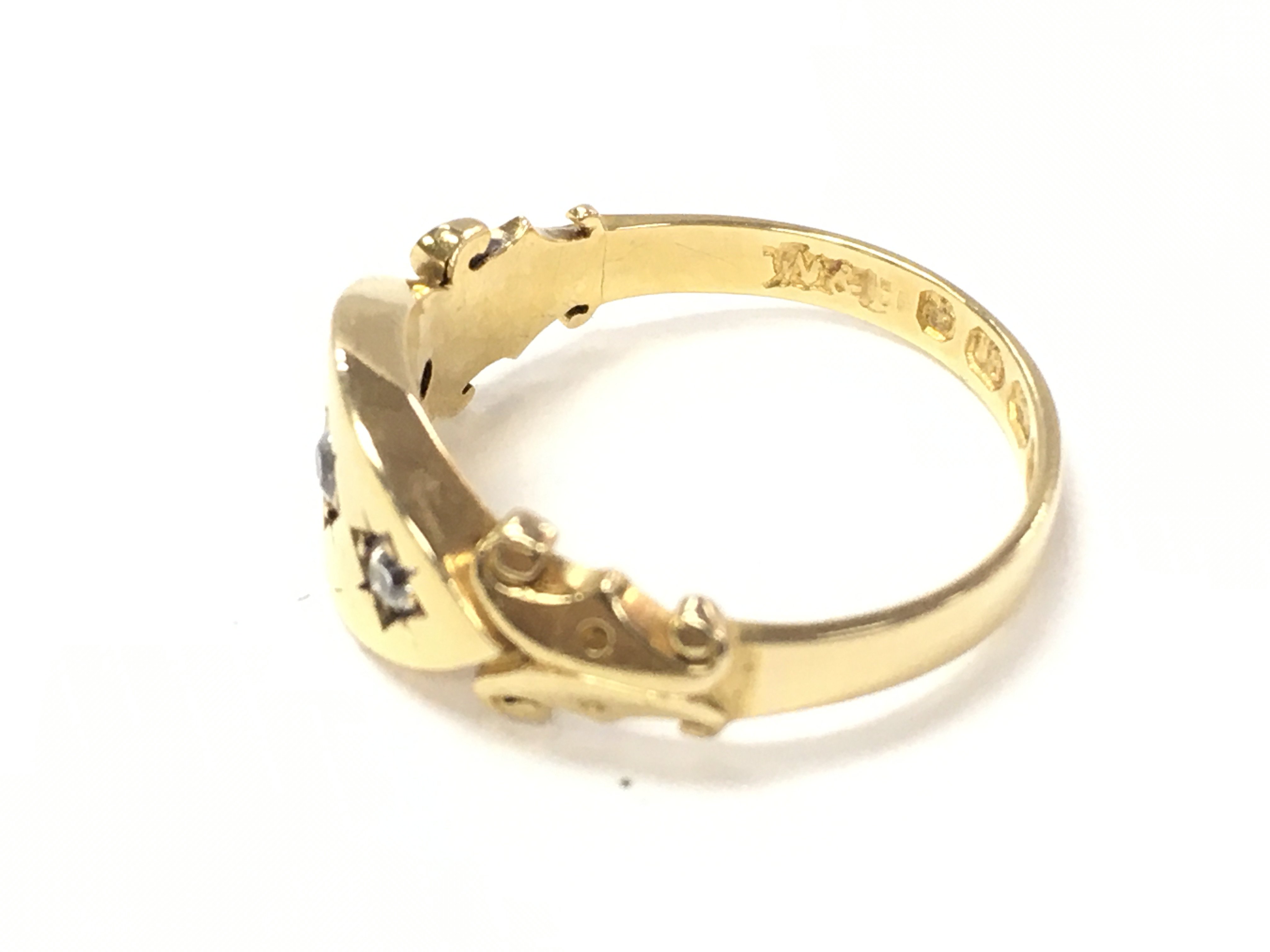 An 18ct gold gents ring set with three diamonds. Size K and 3.08g. Postage A