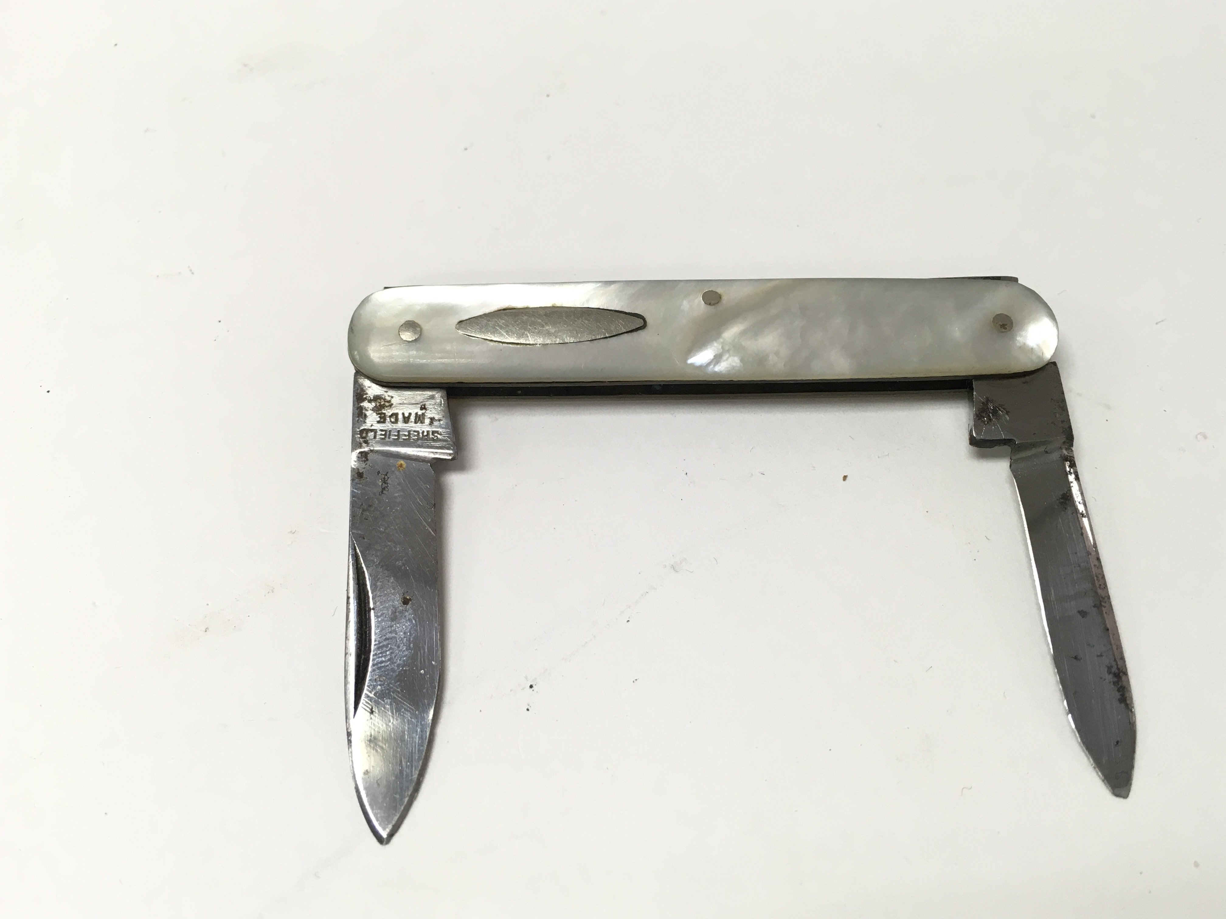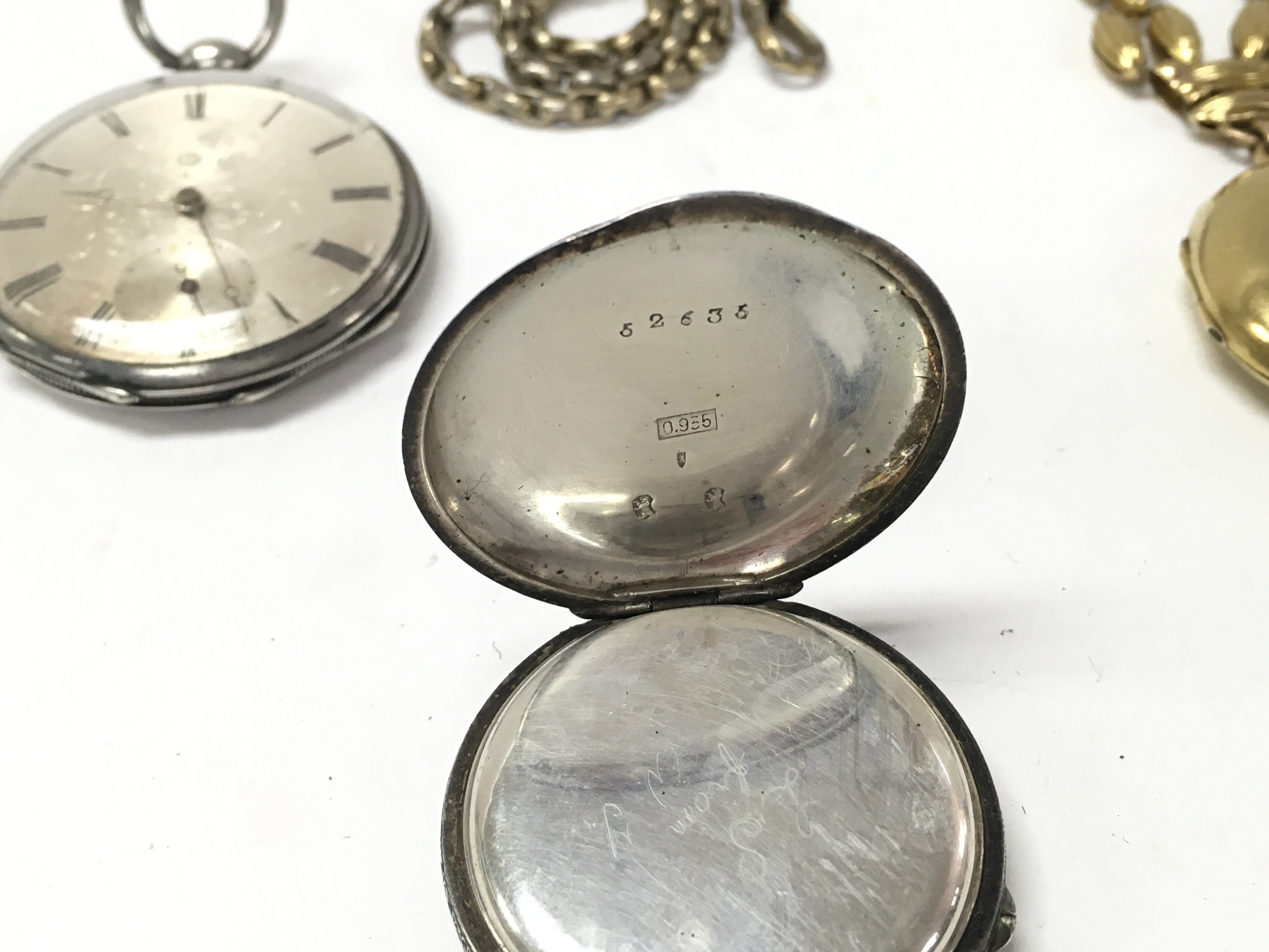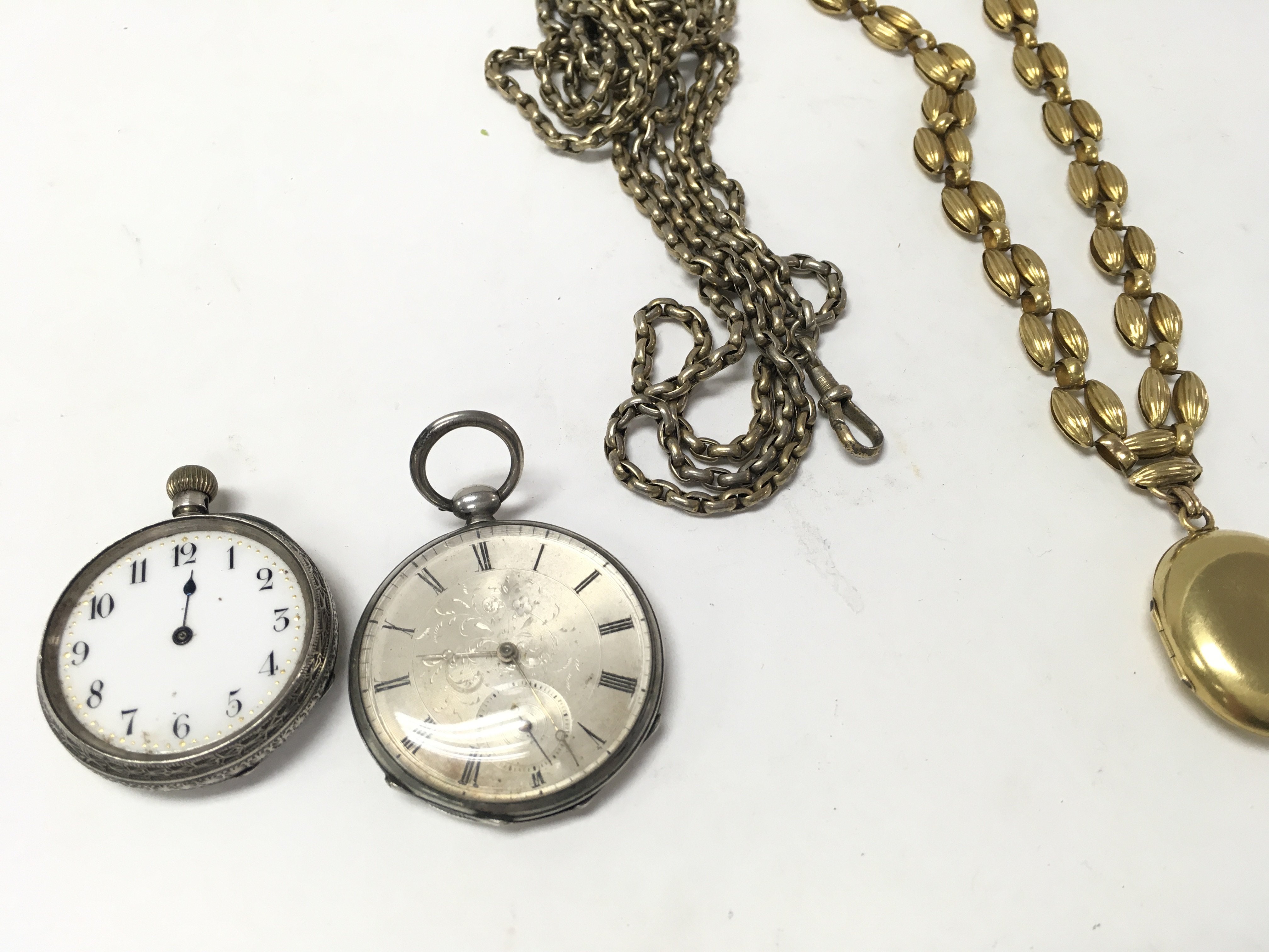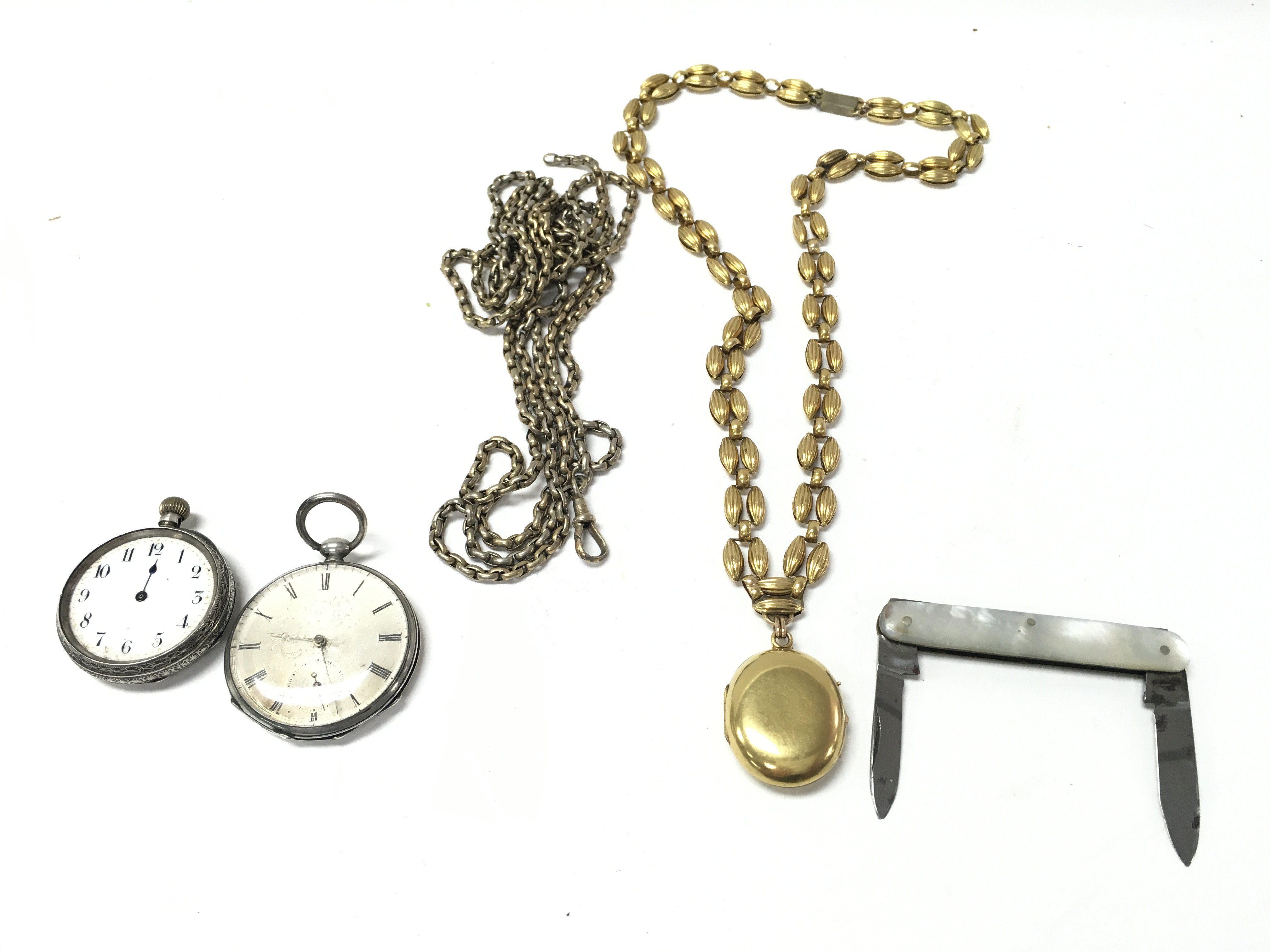 A gold plated locket and watch chain along with a silver cased pocket watch and one other and a mother of pearl effect pen knife.