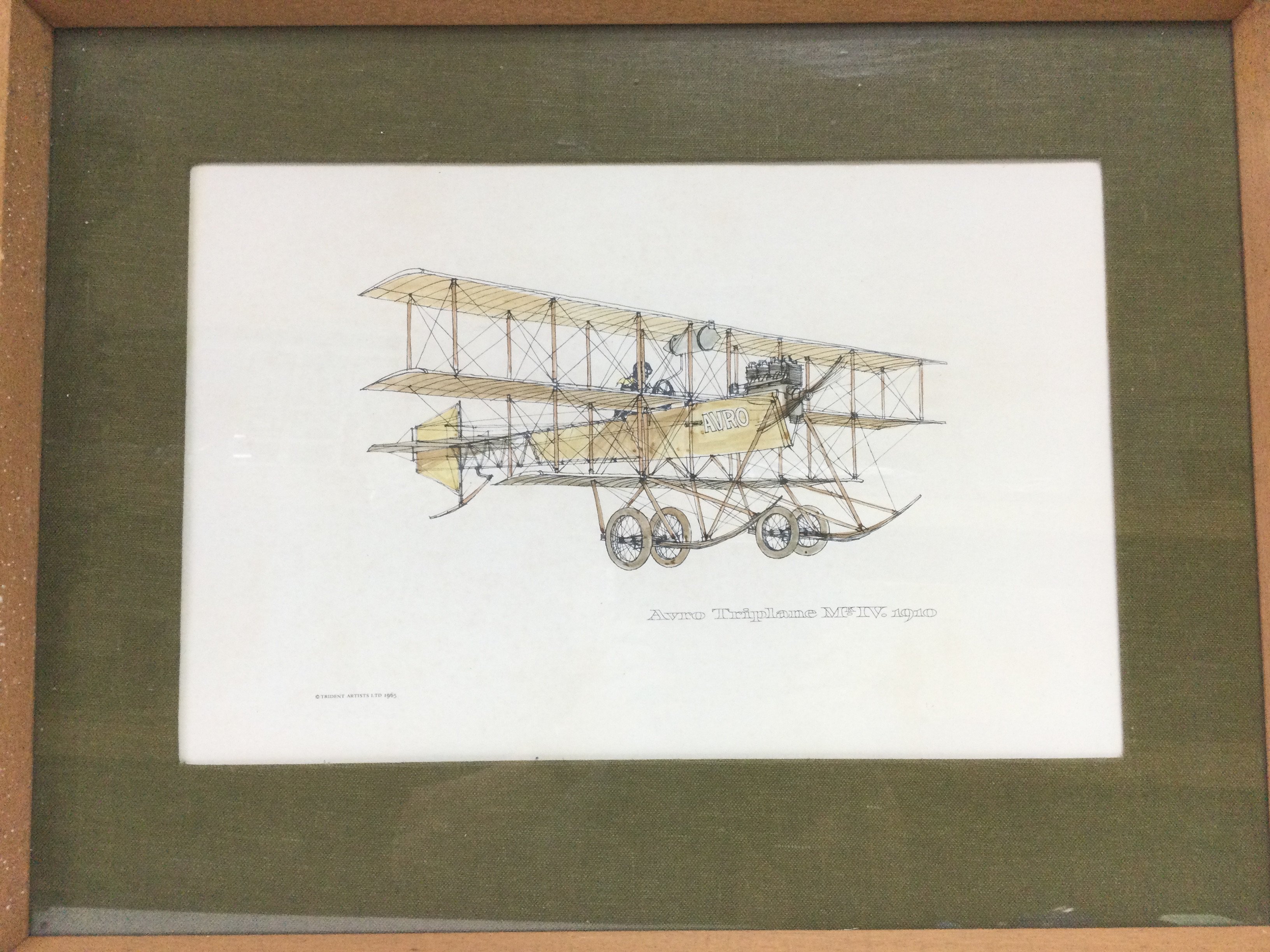 A framed and glazed watercolour, pen and ink drawing of an Avro Triplane MK IV, approx 70cm x 54cm. Shipping category D.