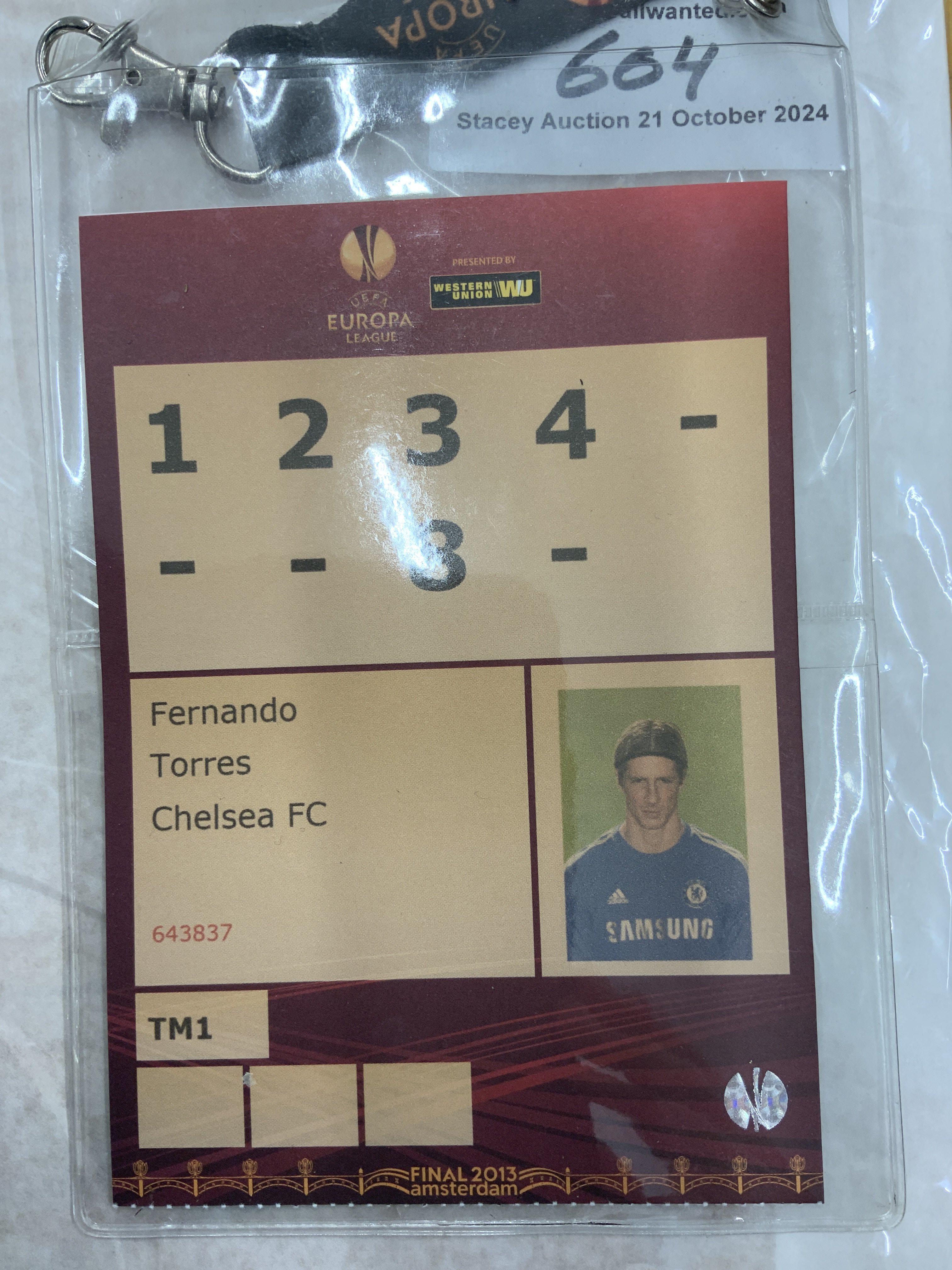 2013 Europa League Final Chelsea Players Lanyard: Original genuine photo identification for Fernando Torres. Neck has Europa League Final 2013 Amsterdam printed. Rare item worn by goalscorer Torres.
