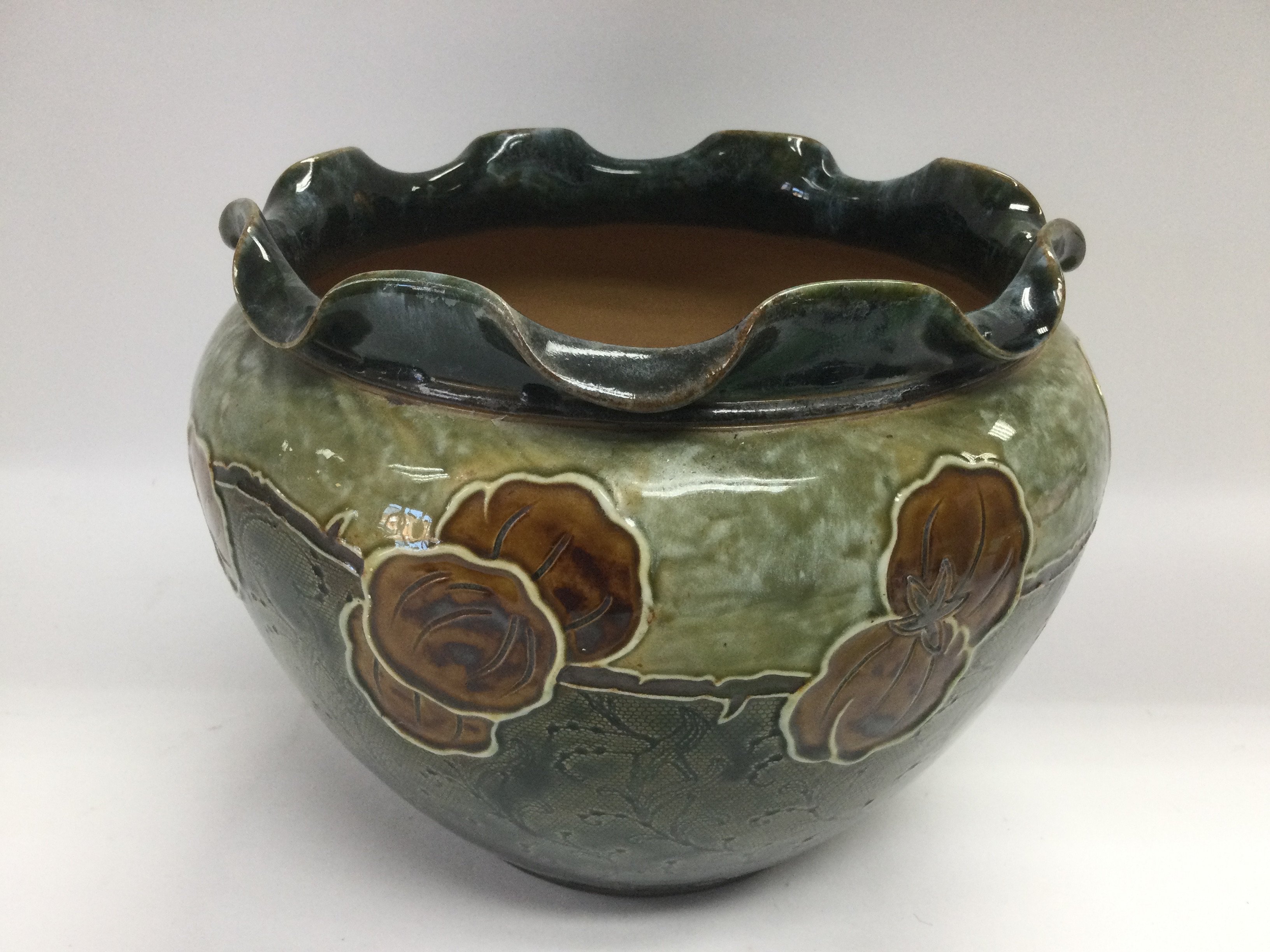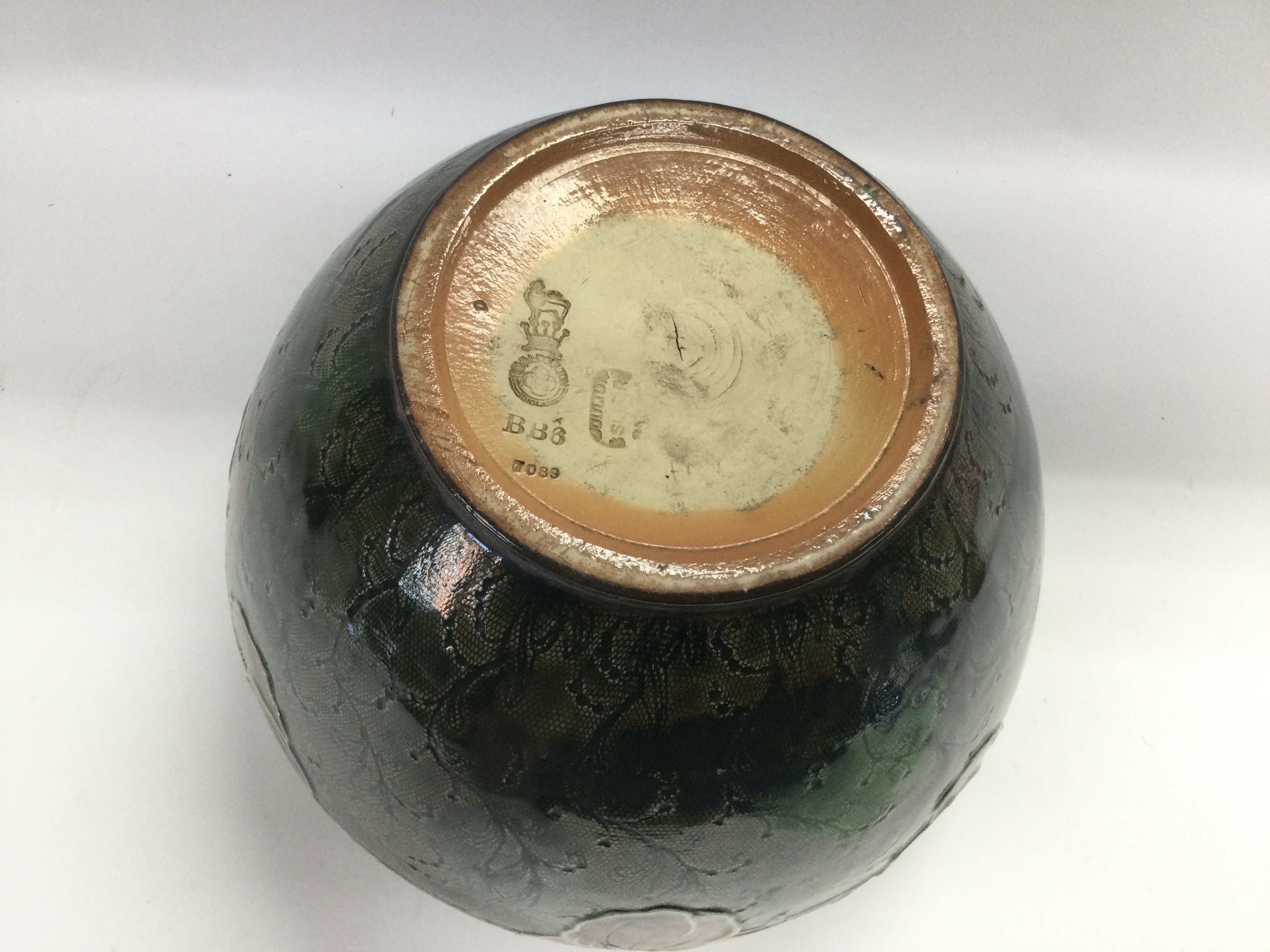 A Doulton Lambeth vase of ovoid form and decorated in browns and greens, approx height 17.5cm. Shipping category D.