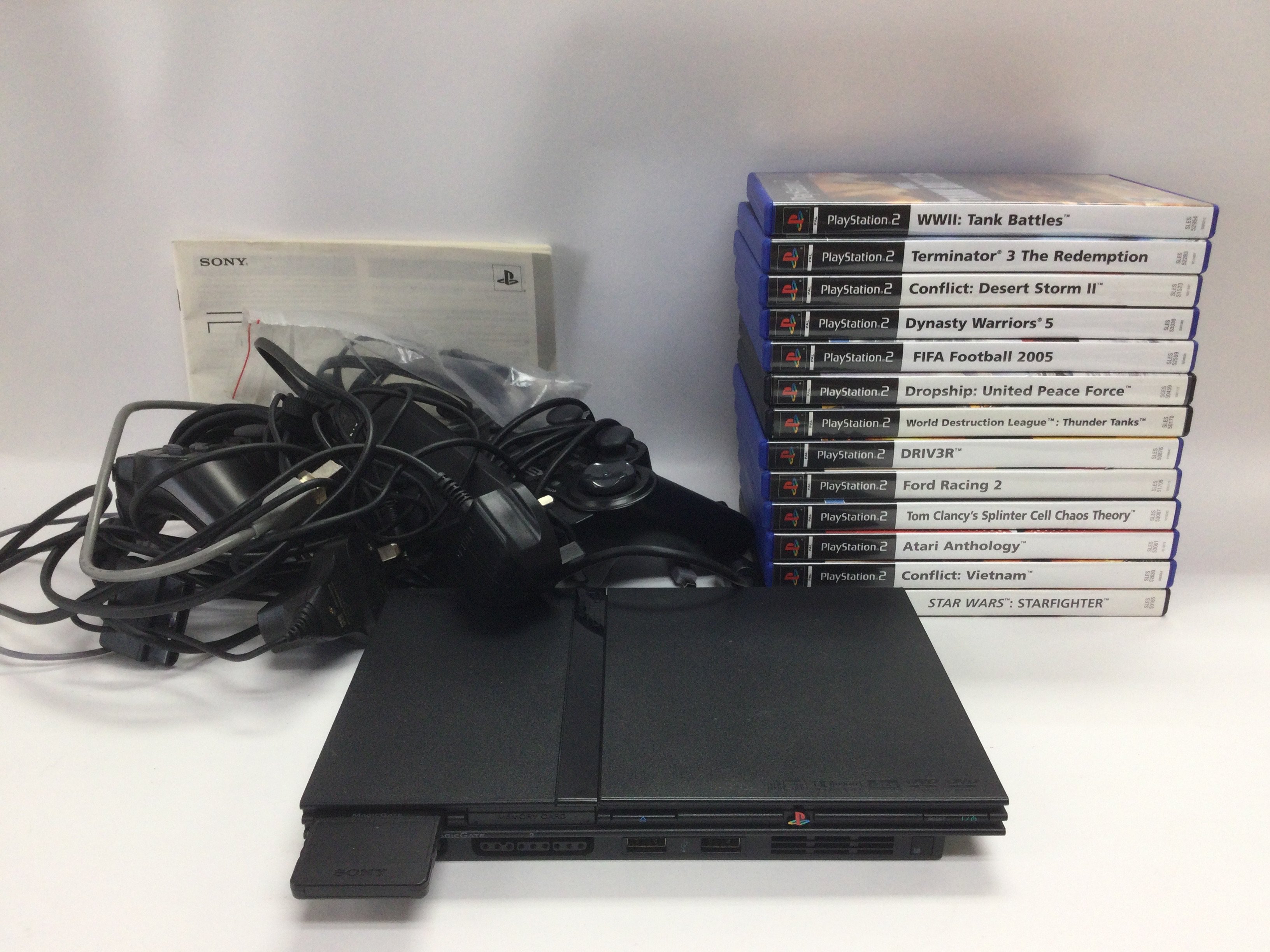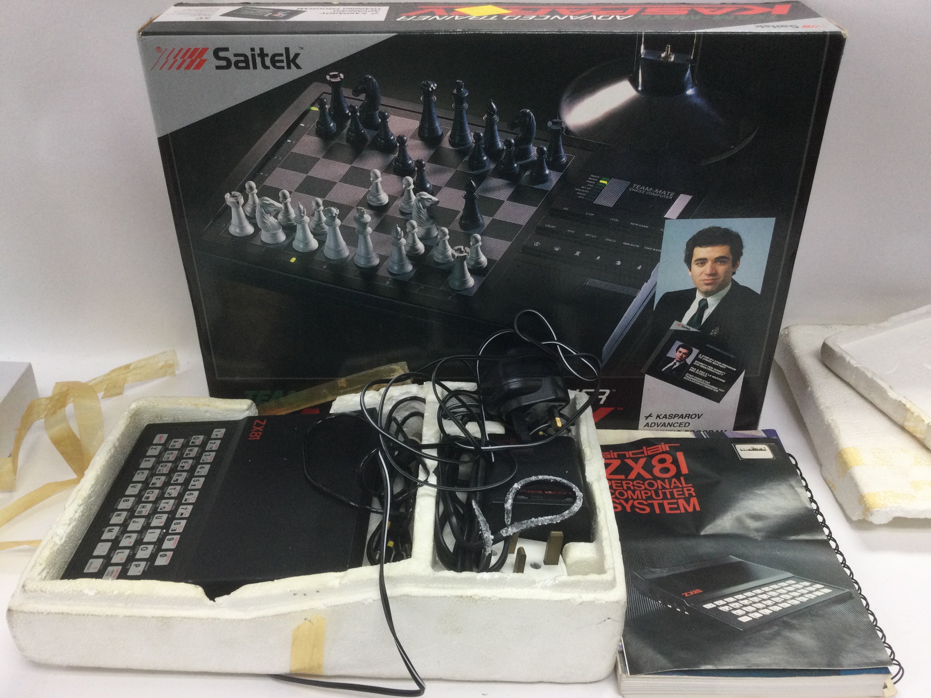 A Sony Playstation 2 and games, a boxed Saitek Kasparov chess trainer and a Sinclair ZX81 plus booklets. Shipping category D.