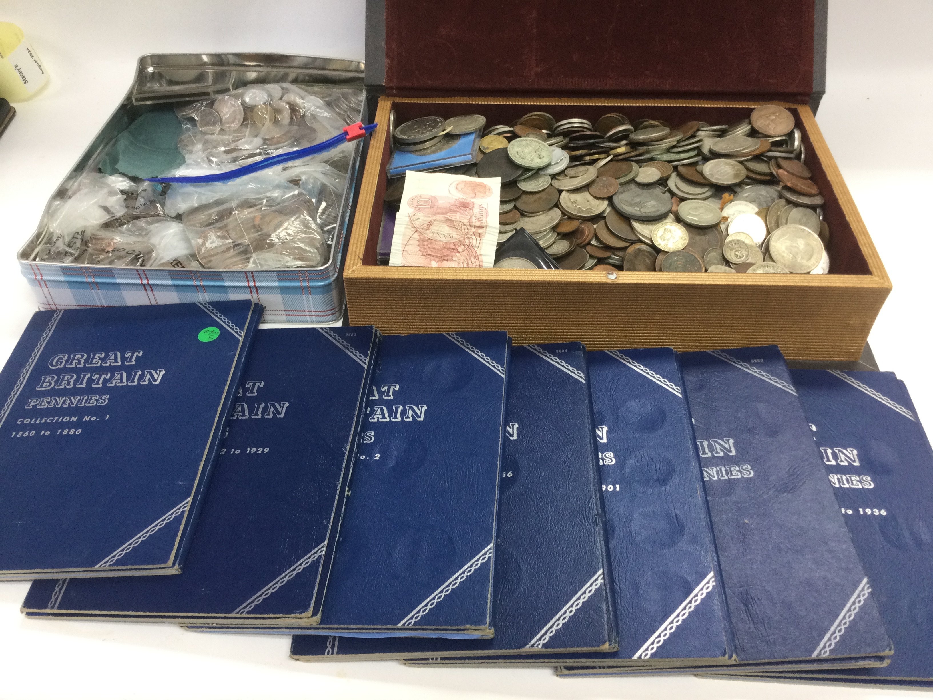 Two boxes of British and foreign currency including many silver coins. Shipping category D.