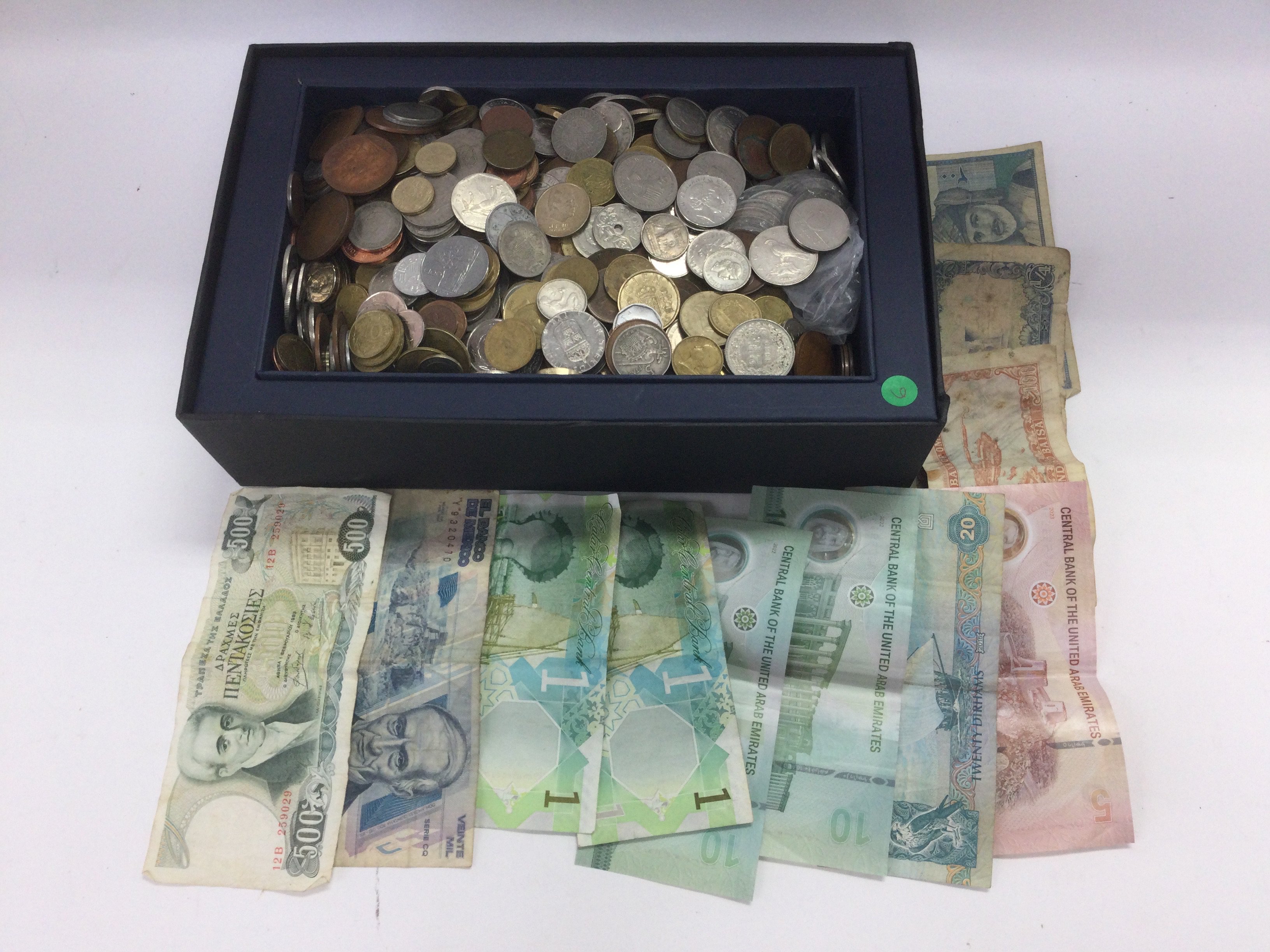 A box of foreign coins and banknotes. Shipping category D.