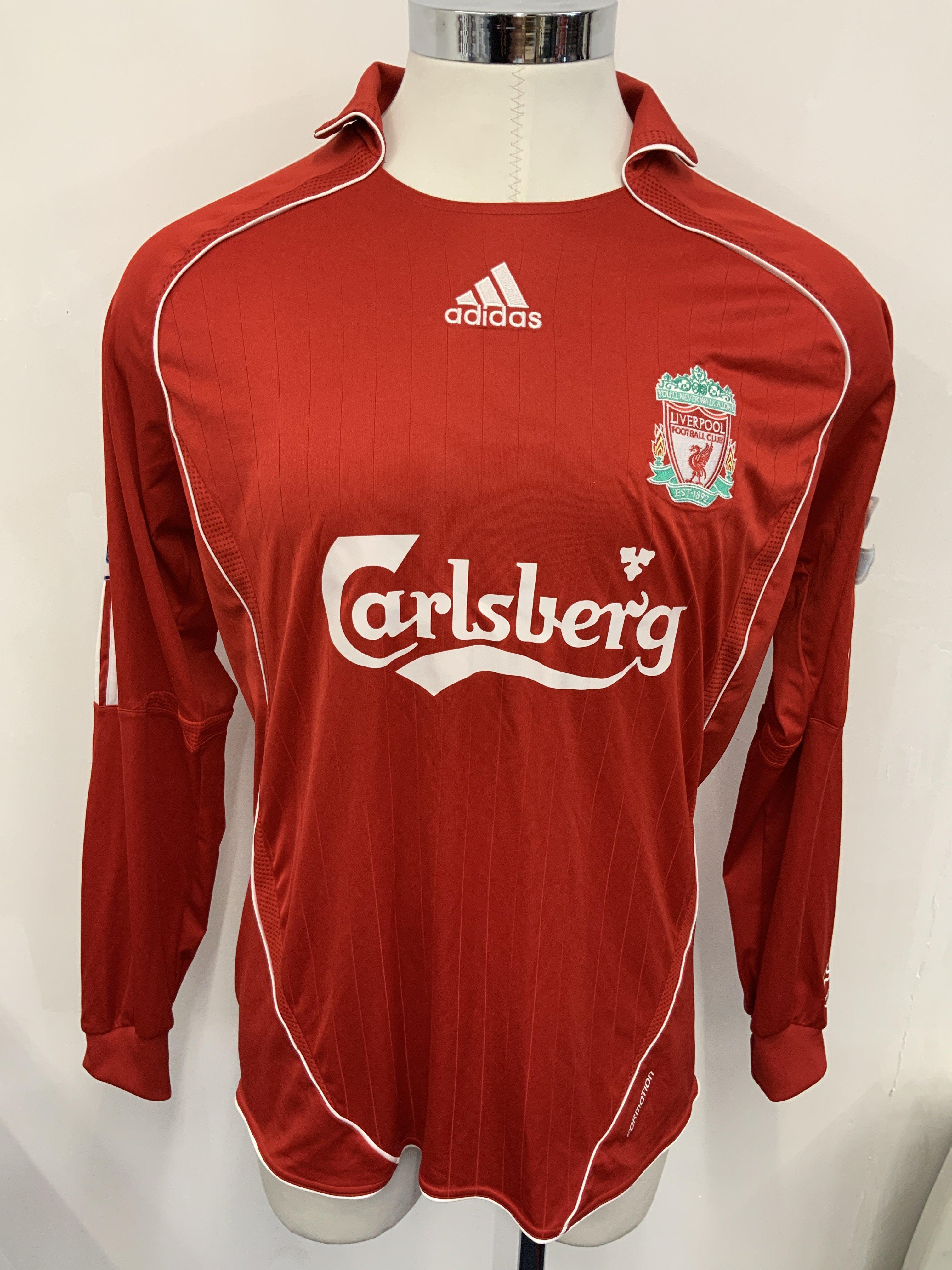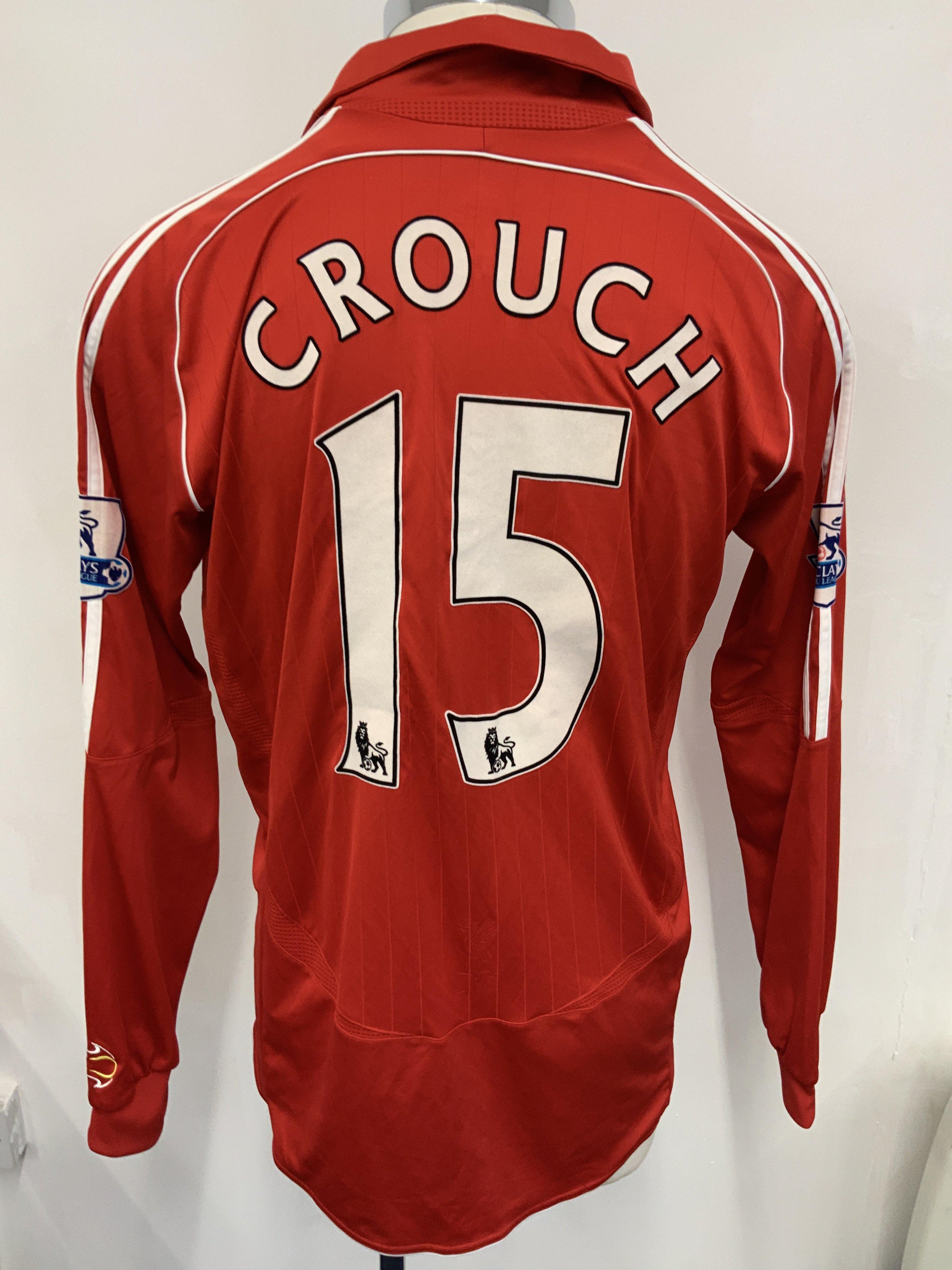 Peter Crouch Liverpool 2006 - 2008 Match Worn Football Shirt: Red long sleeve home shirt worn v Arsenal. Premier League sleeve patches to arms of which one is peeling slightly. Number 15 Crouch to rear. Swapped with Kolo Toure.