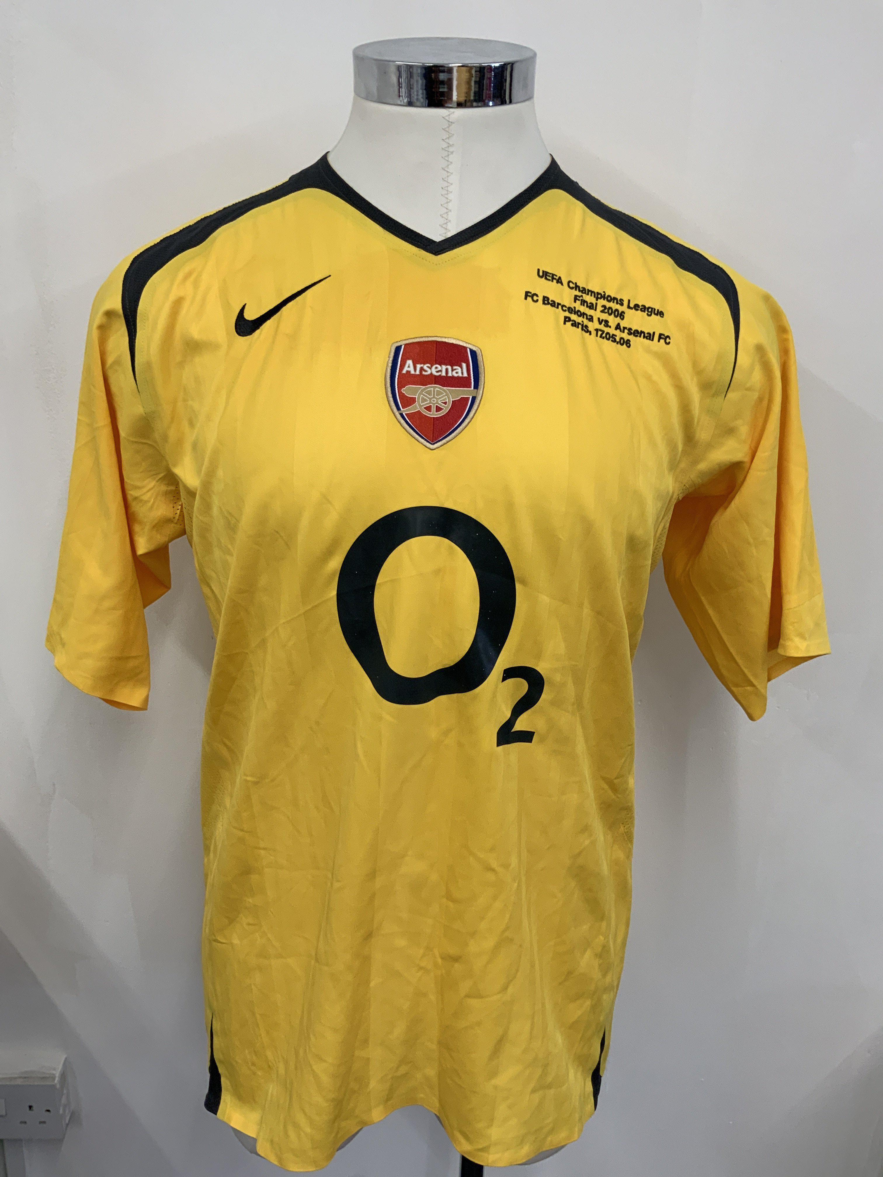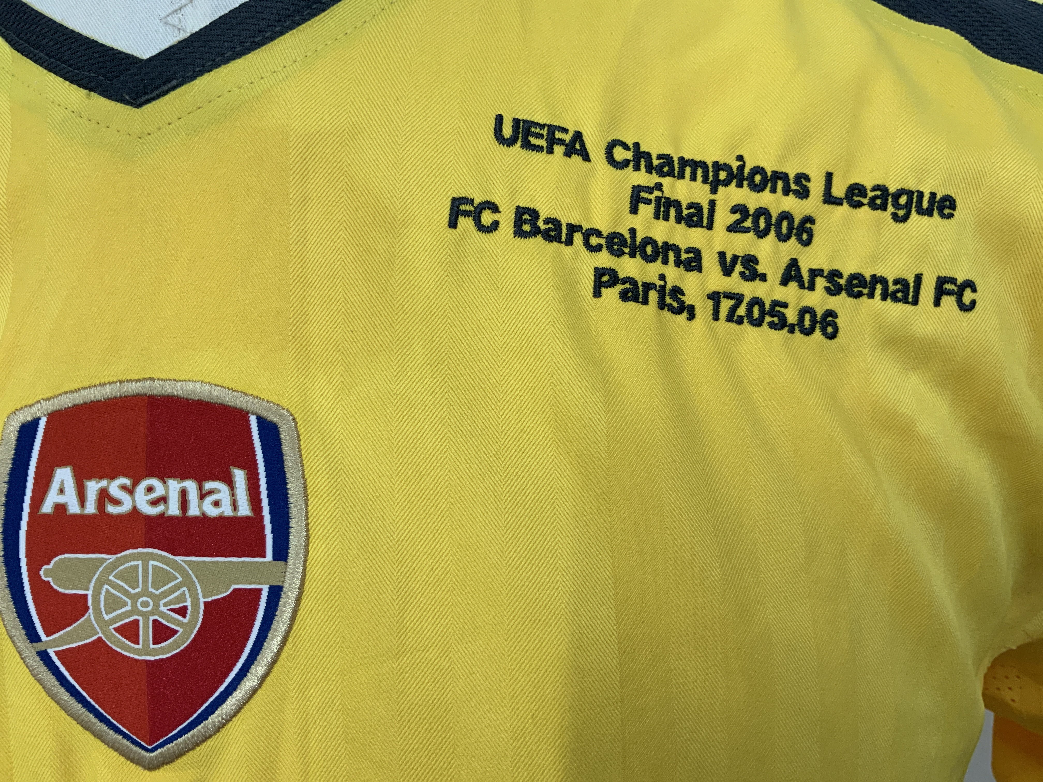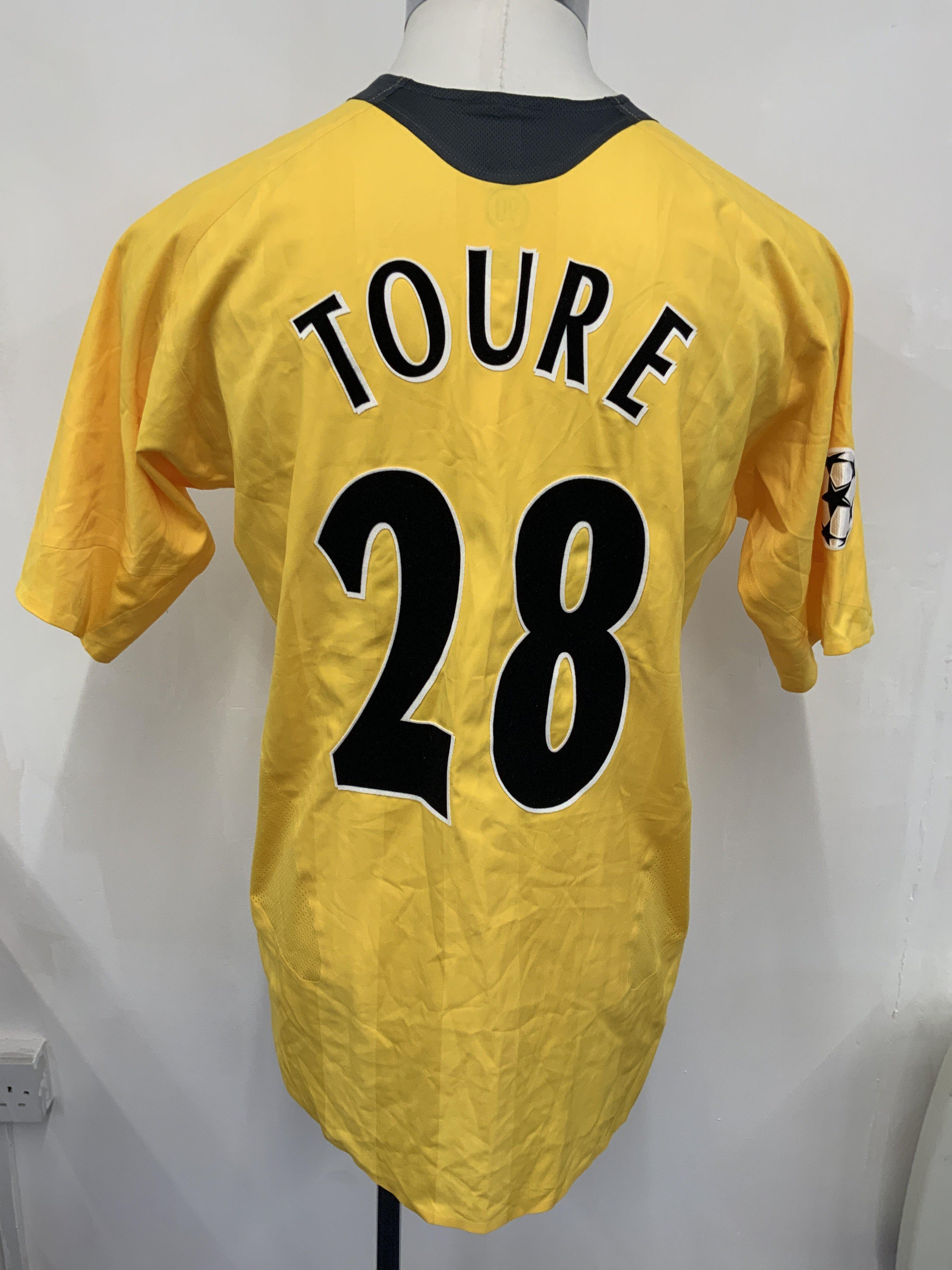 Kolo Toure Arsenal 2006 Champions League Final Match Worn Football Shirt: Yellow short sleeve 02 shirt worn in the Chanpions League final v Barcelona in Paris. Champions League ball sleeve patches. Number 28 Toure to rear.