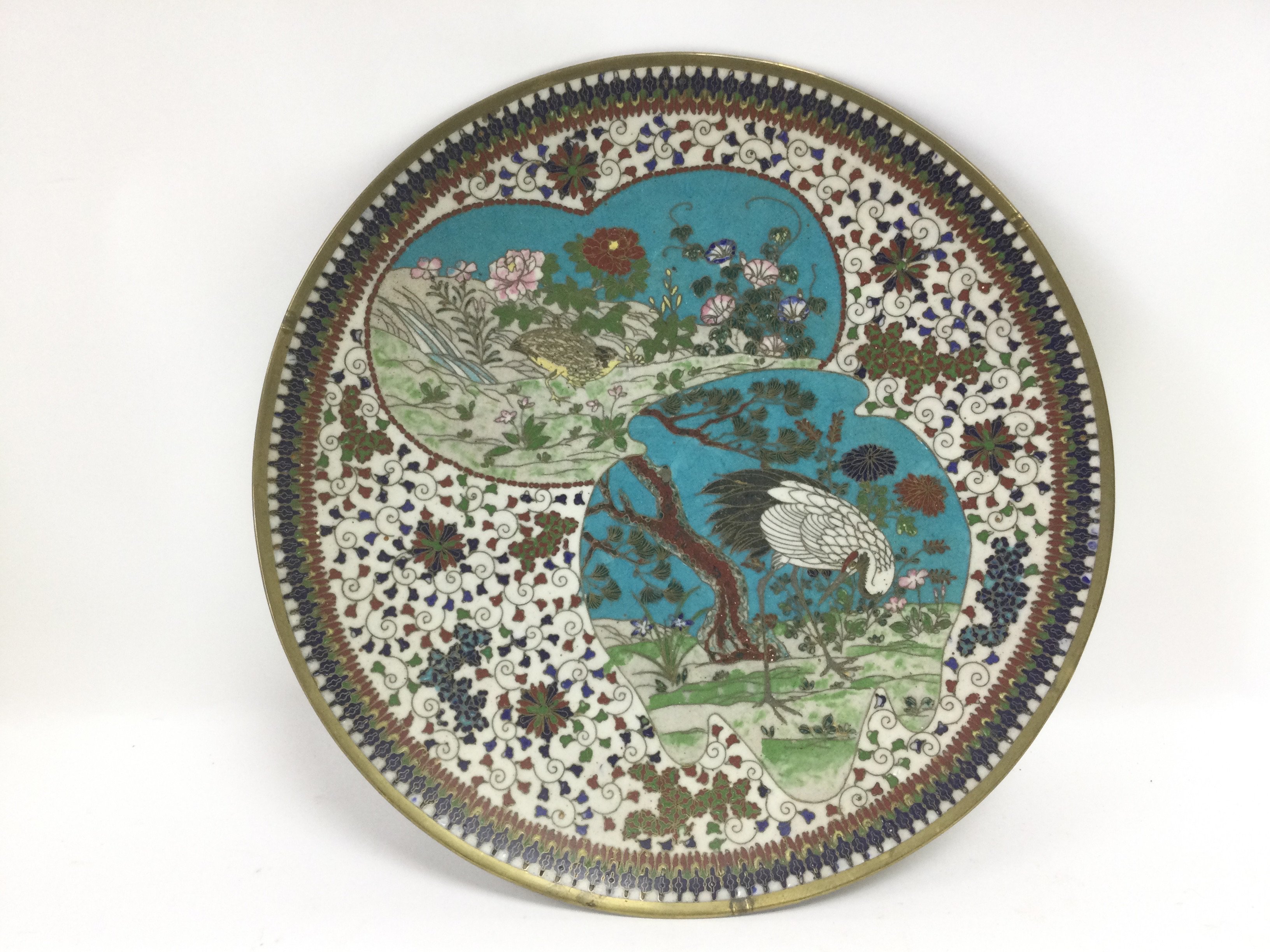A cloisonne dish depicting a stork and a bird, approx diameter 30cm. Shipping category D.