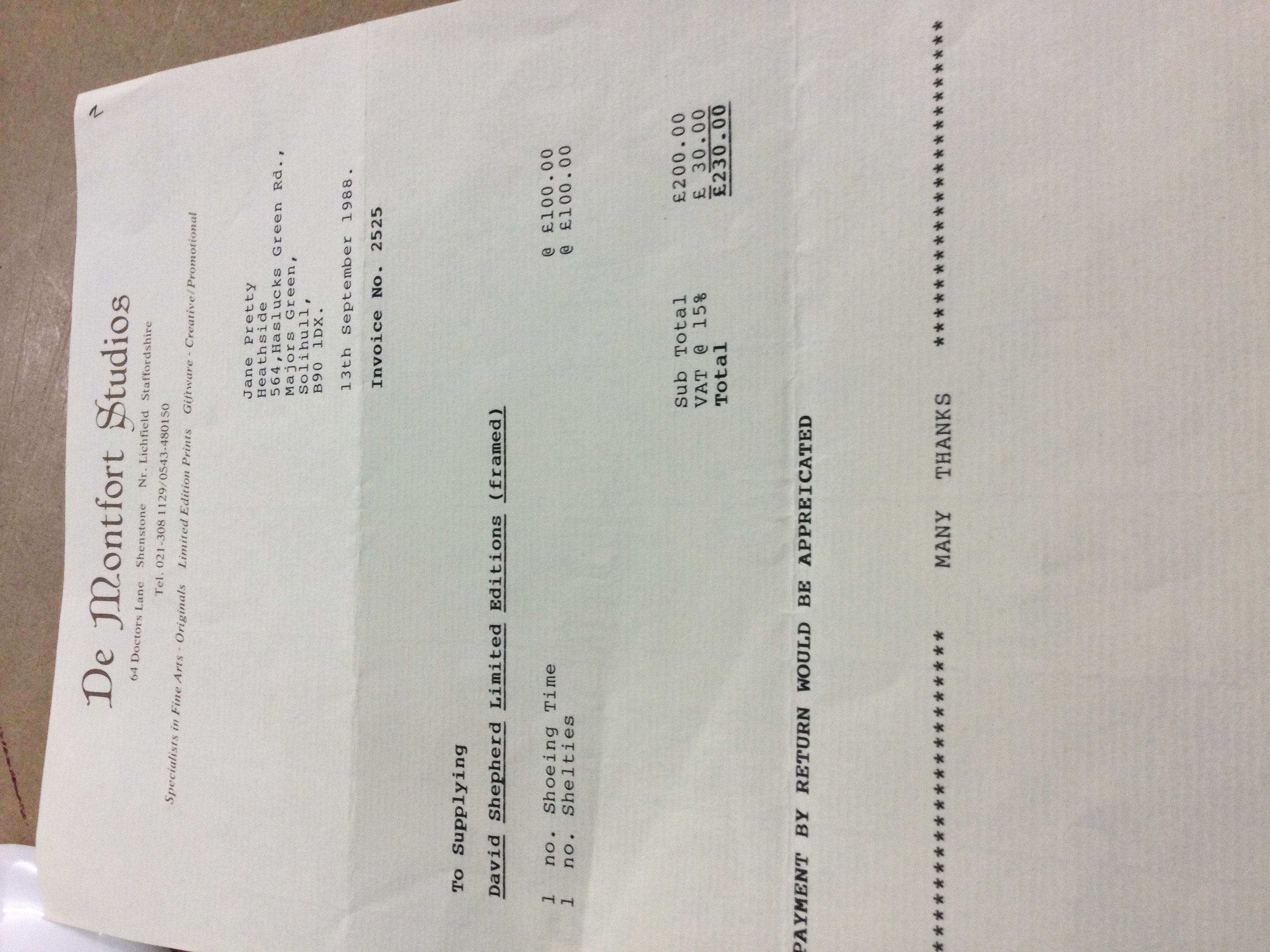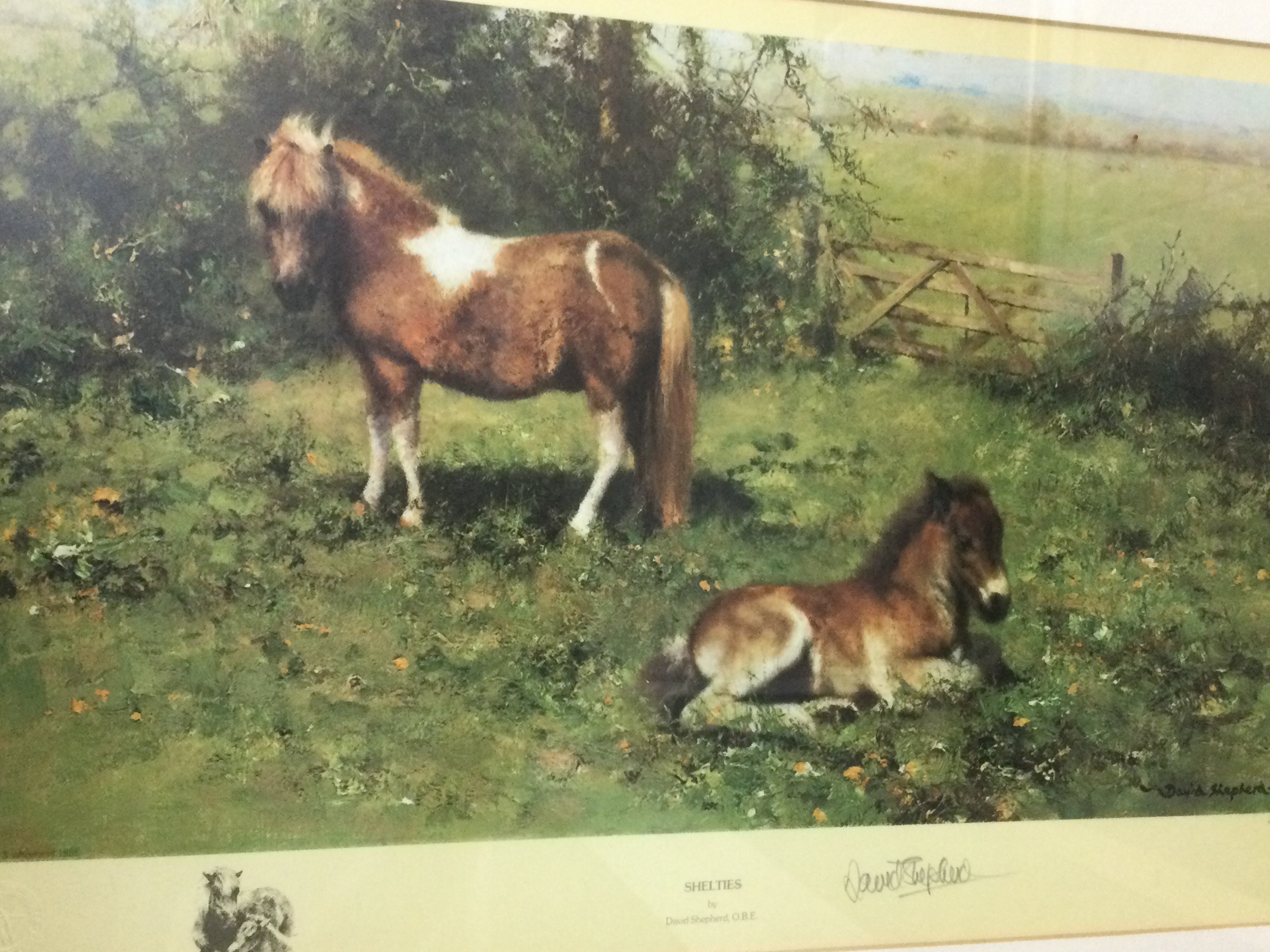 Two framed David Shepard prints titled Shoeing Time & Shelties. Dimensions 59x45cm. This lot cannot be posted