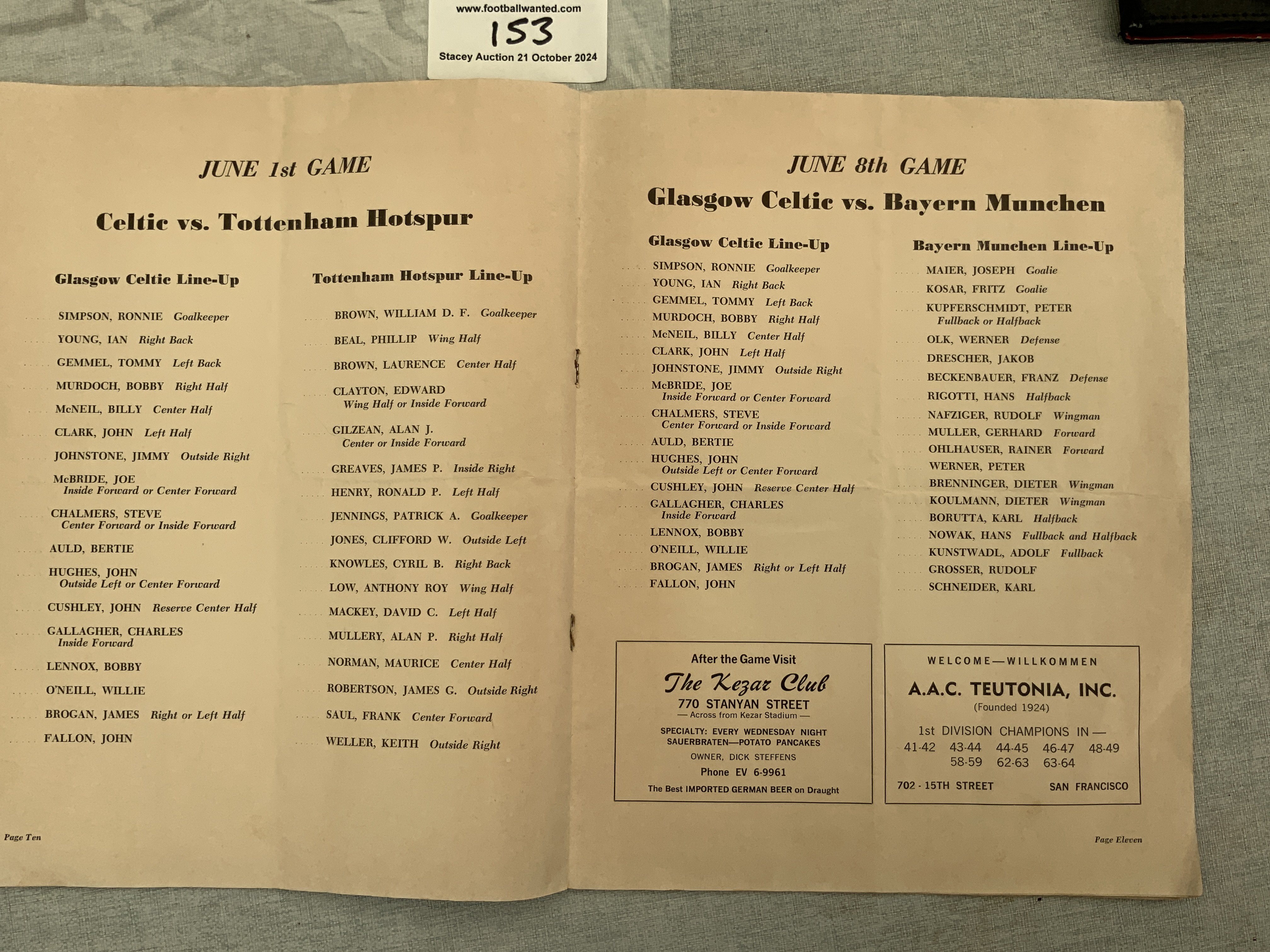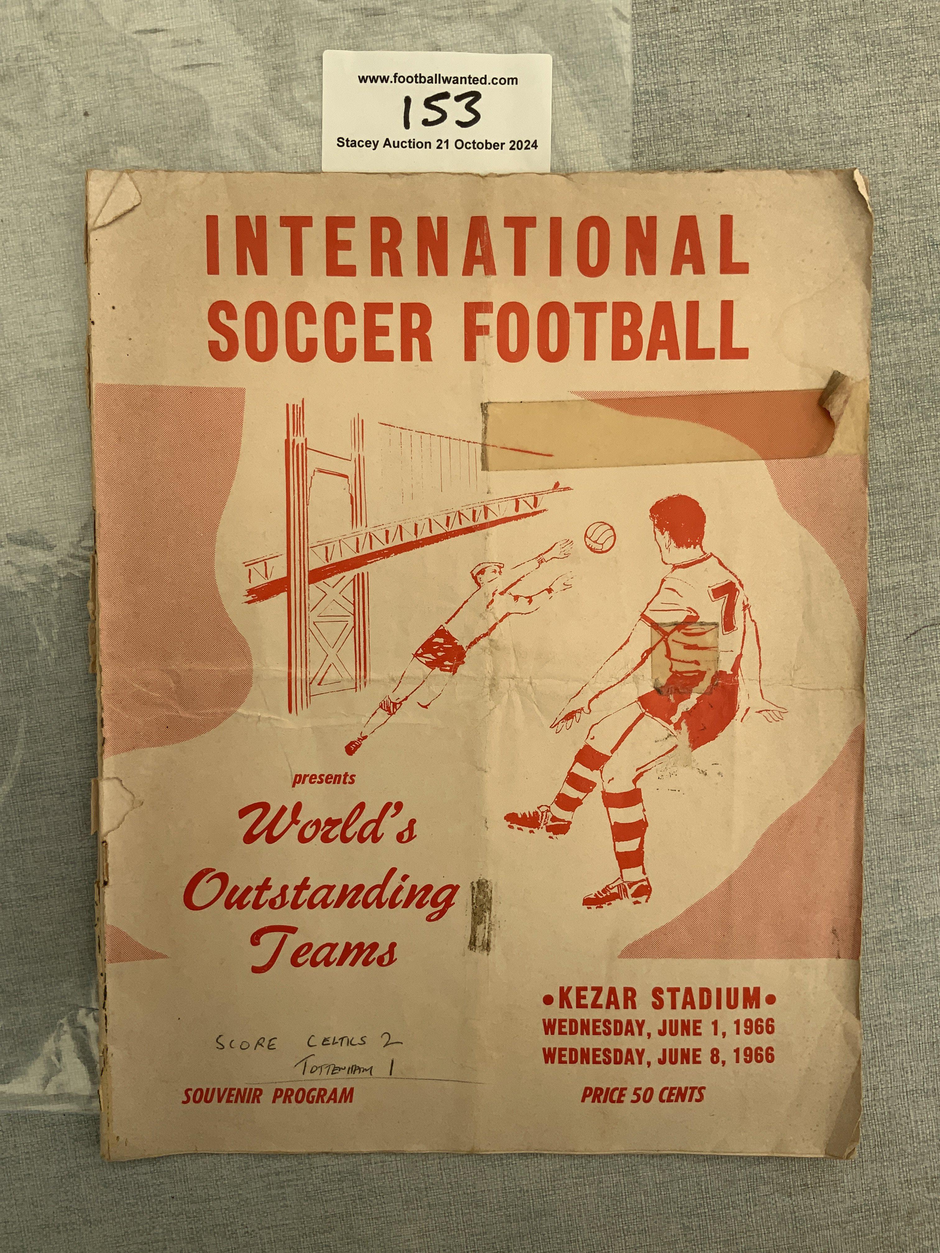 1966 Celtic v Tottenham In USA Football Programme: Played in San Francisco. 20 page programme has pieces missing from covers, team names on cover, split spine and tape but is good inside. Doubles up as Bayern Munich v Celtic