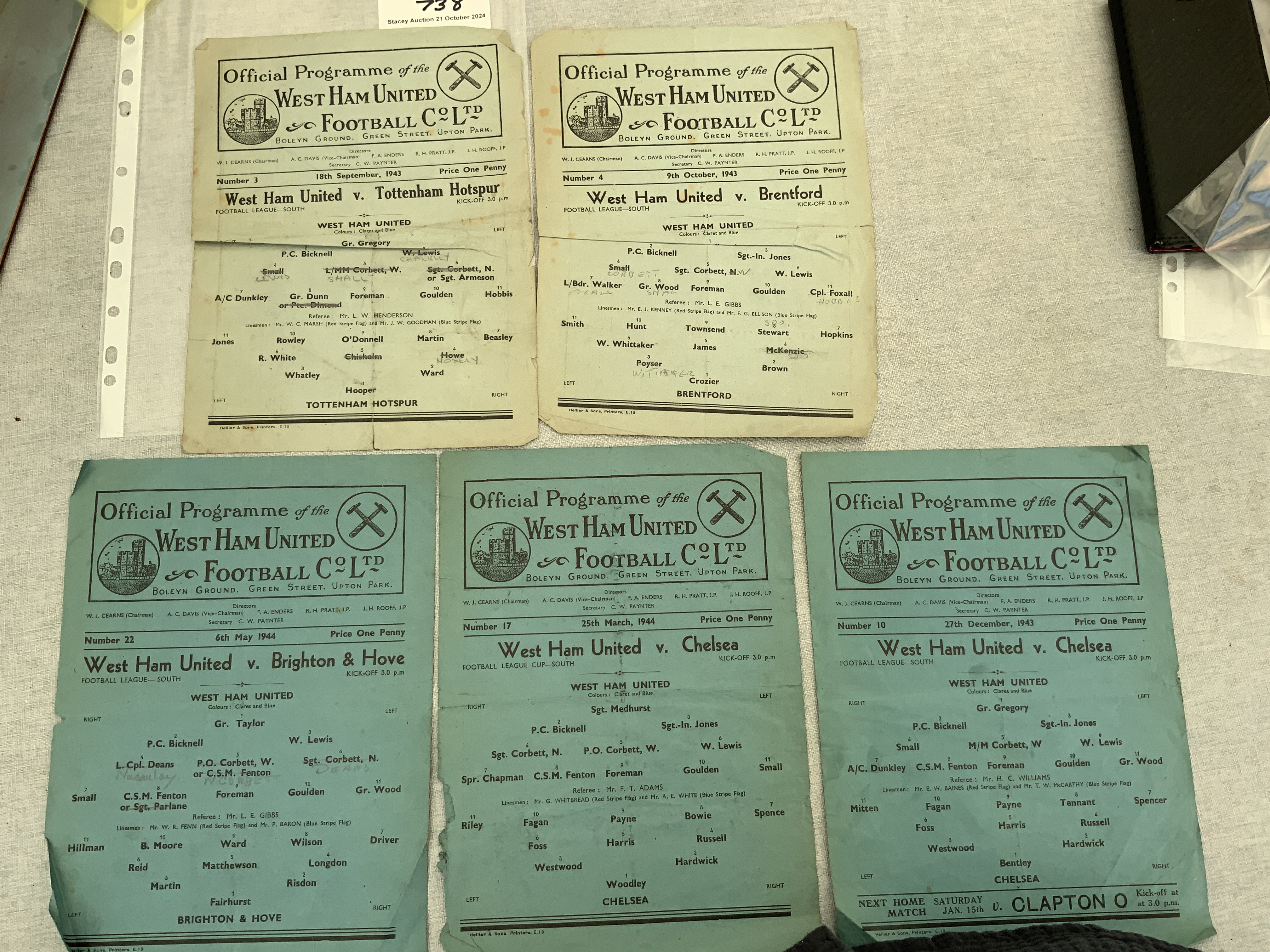 43/44 West Ham Home Football Programmes: League matches v Chelsea Brighton Brentford Tottenham and Chelsea cup. Fair. (5)