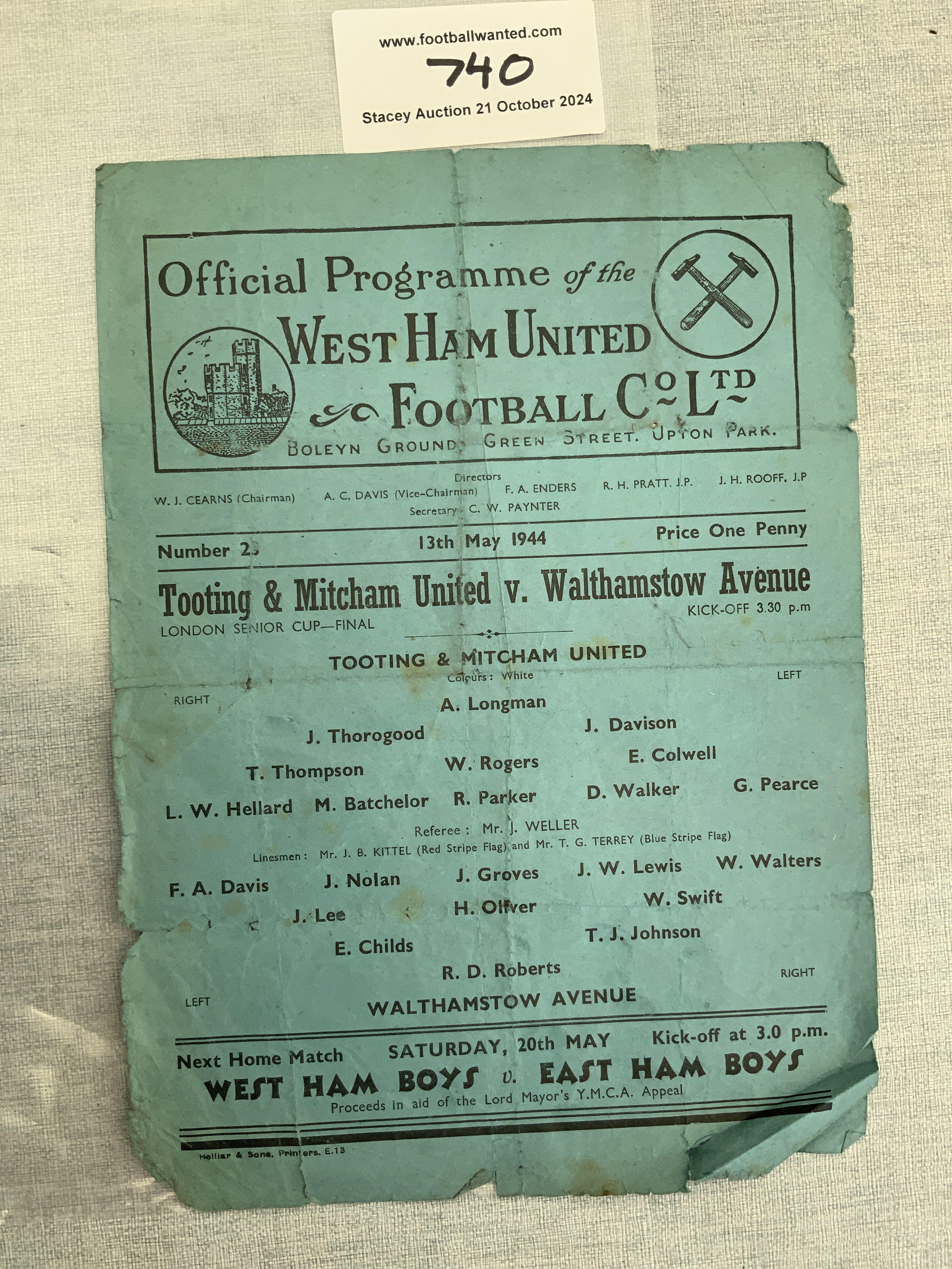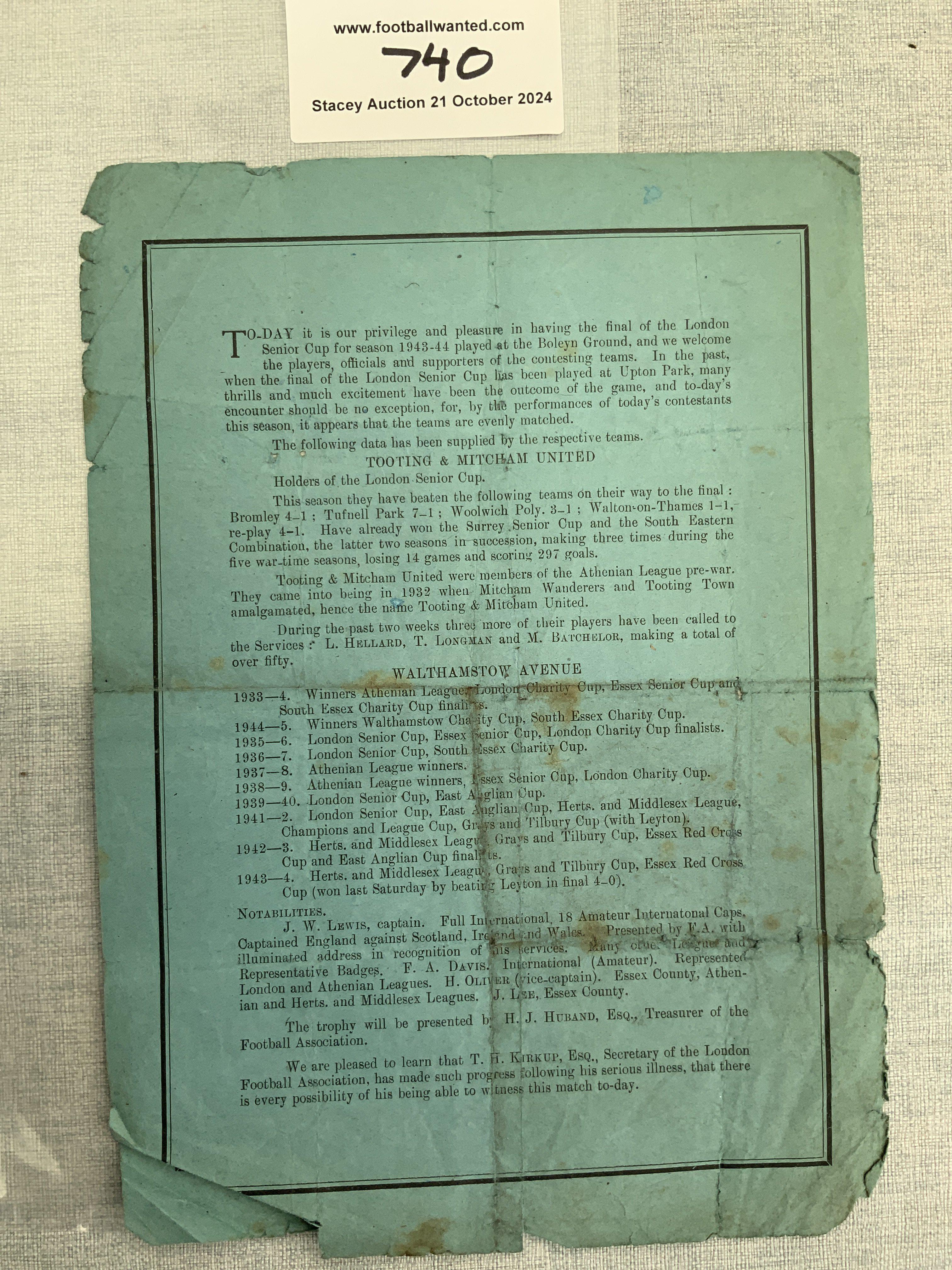 1944 London Senior Cup Final + West Ham Football Programme: Dated 13 5 1944 played at Upton Park between Tooting + Mitcham v Walthamstow. Tatty.