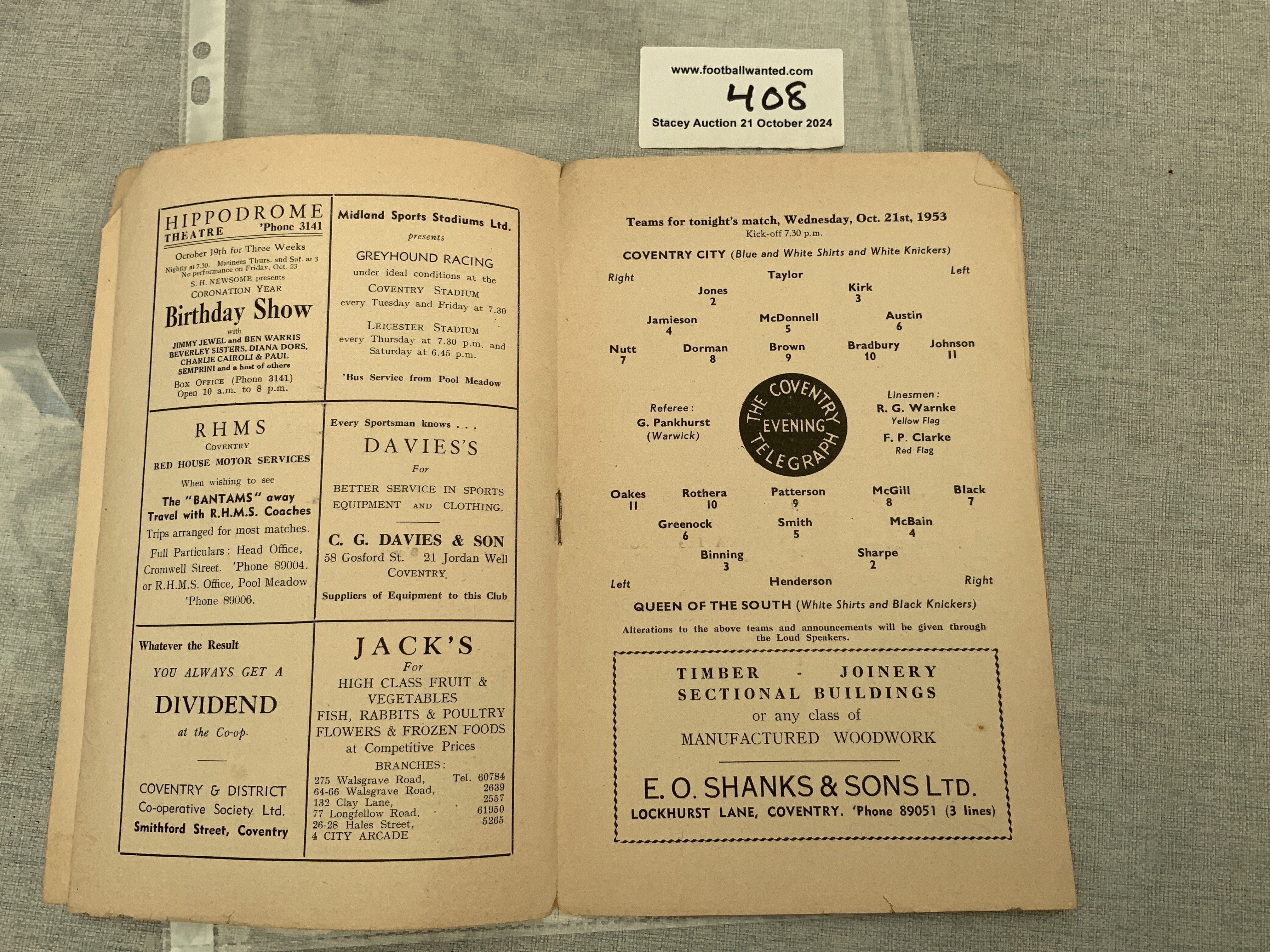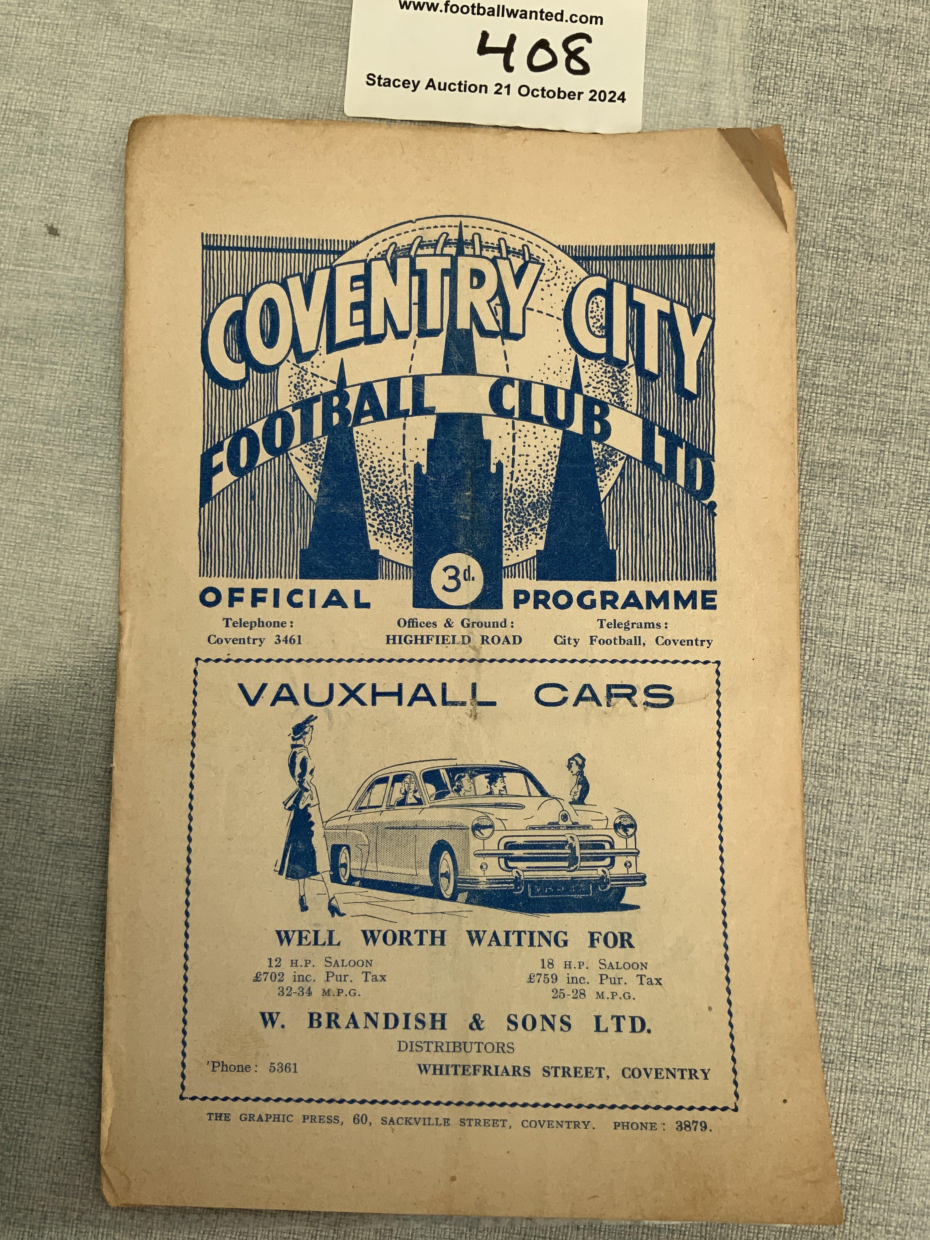 53/54 Coventry v Queen Of The South Football Programme: Friendly dated 21 10 1953. Spine splitting and fold but no team changes.
