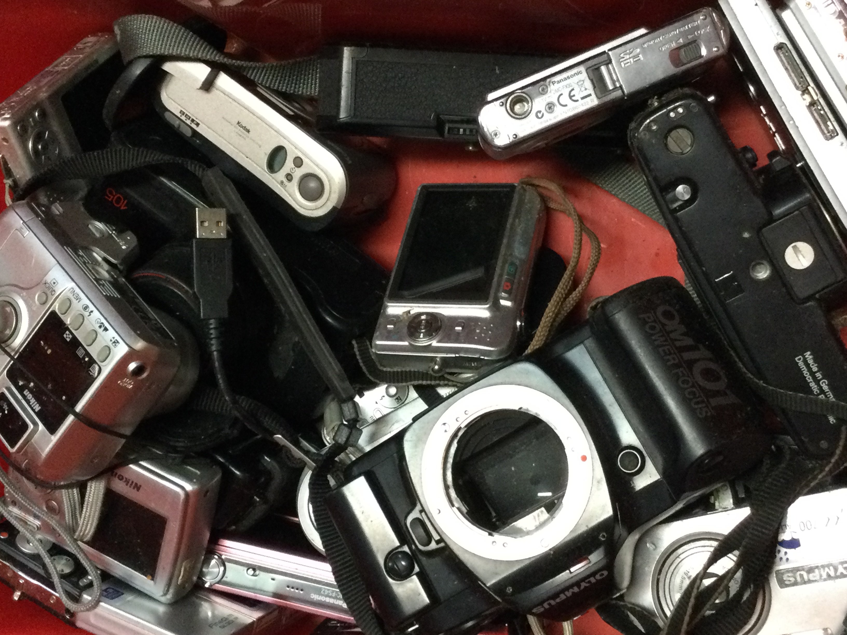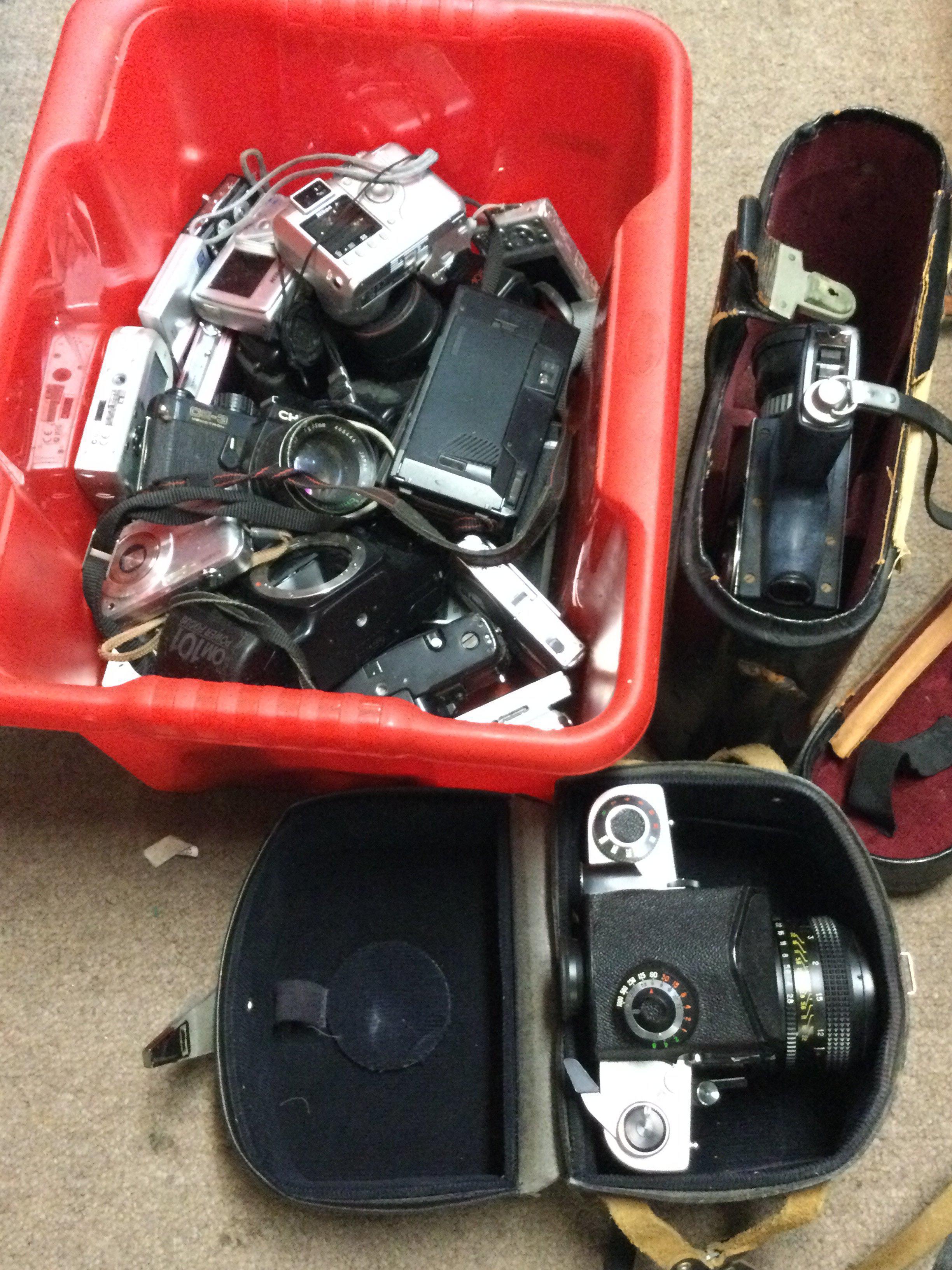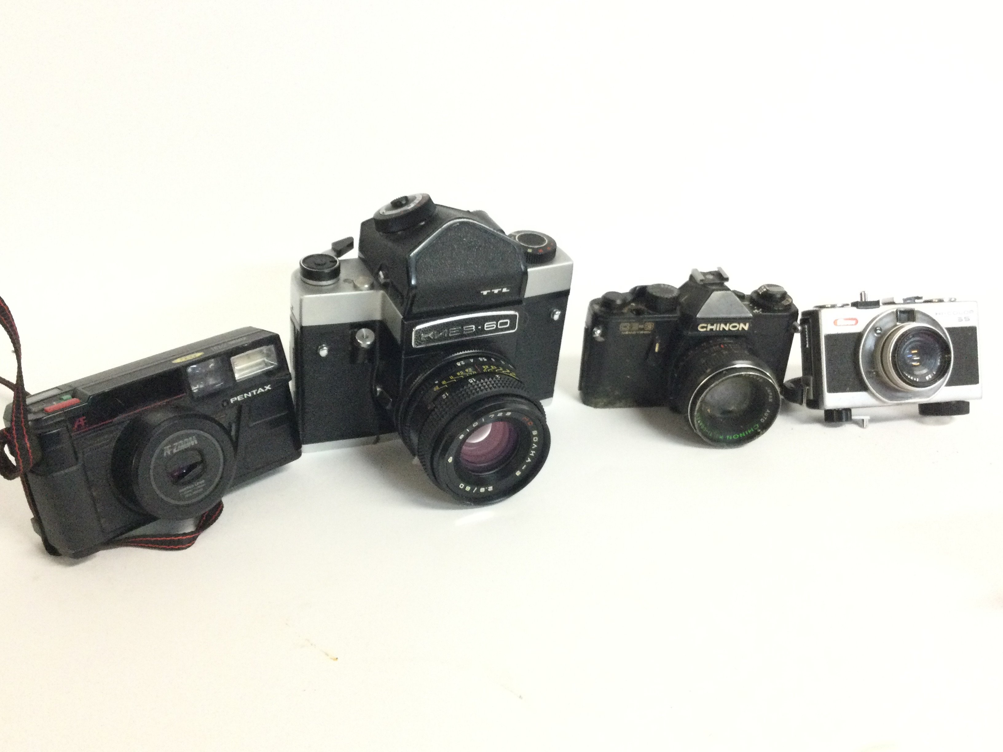 A collection of vintage cameras including Kneb-60, Chinon, Pentax and various modern digital cameras