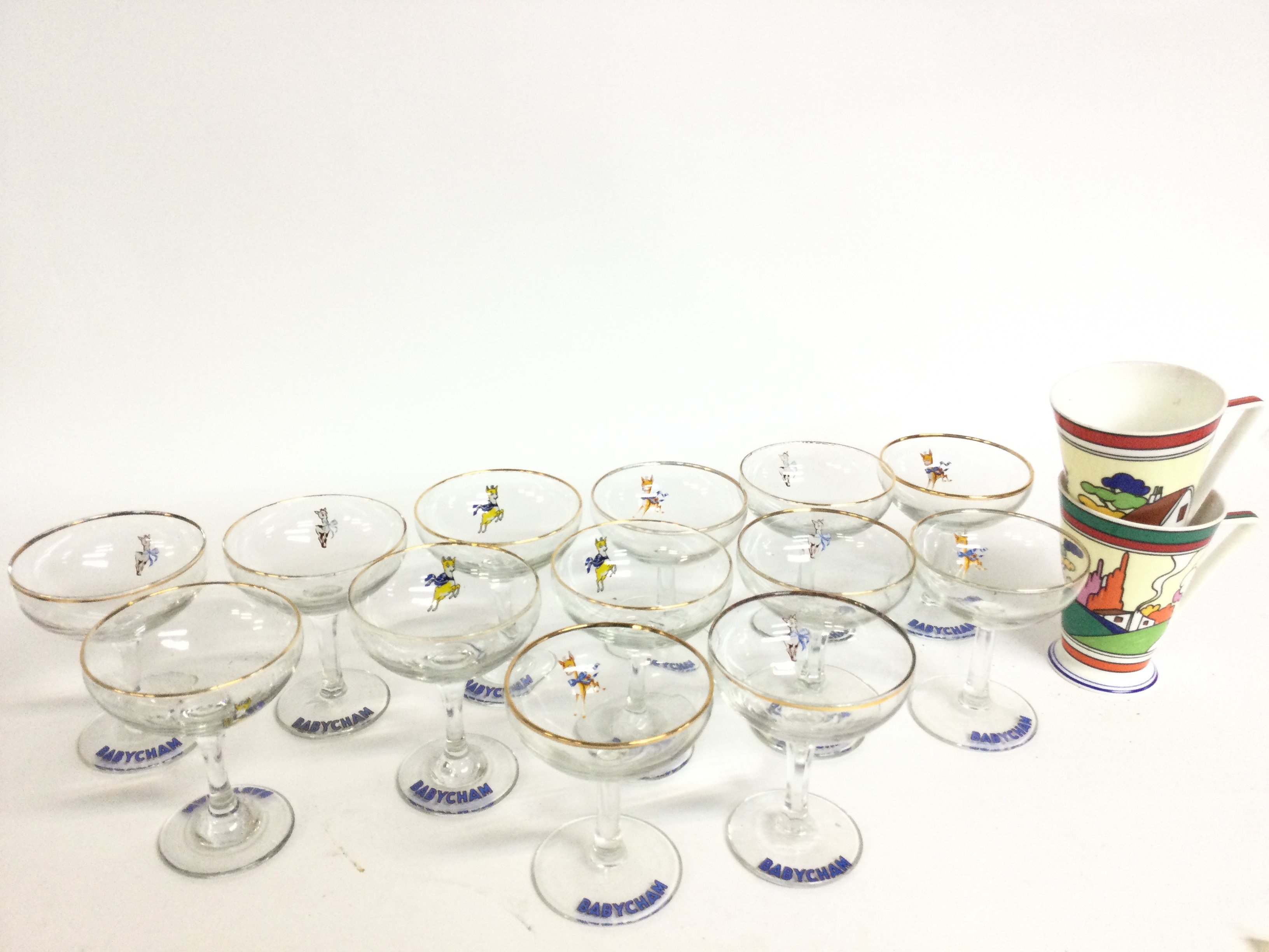Vintage Babycham glasses and Art Deco style wren home sweet home porcelain cups. This lot cannot be posted