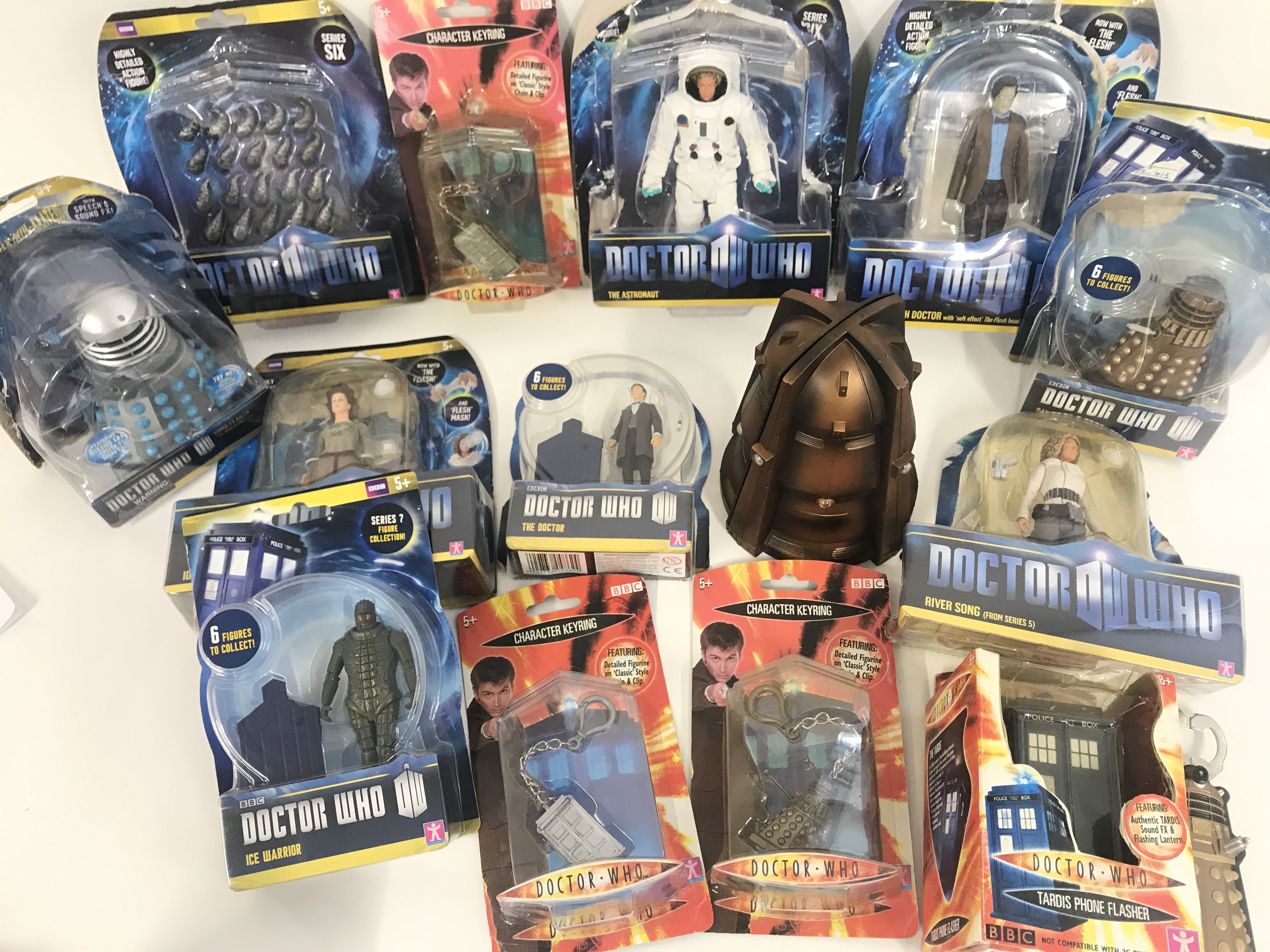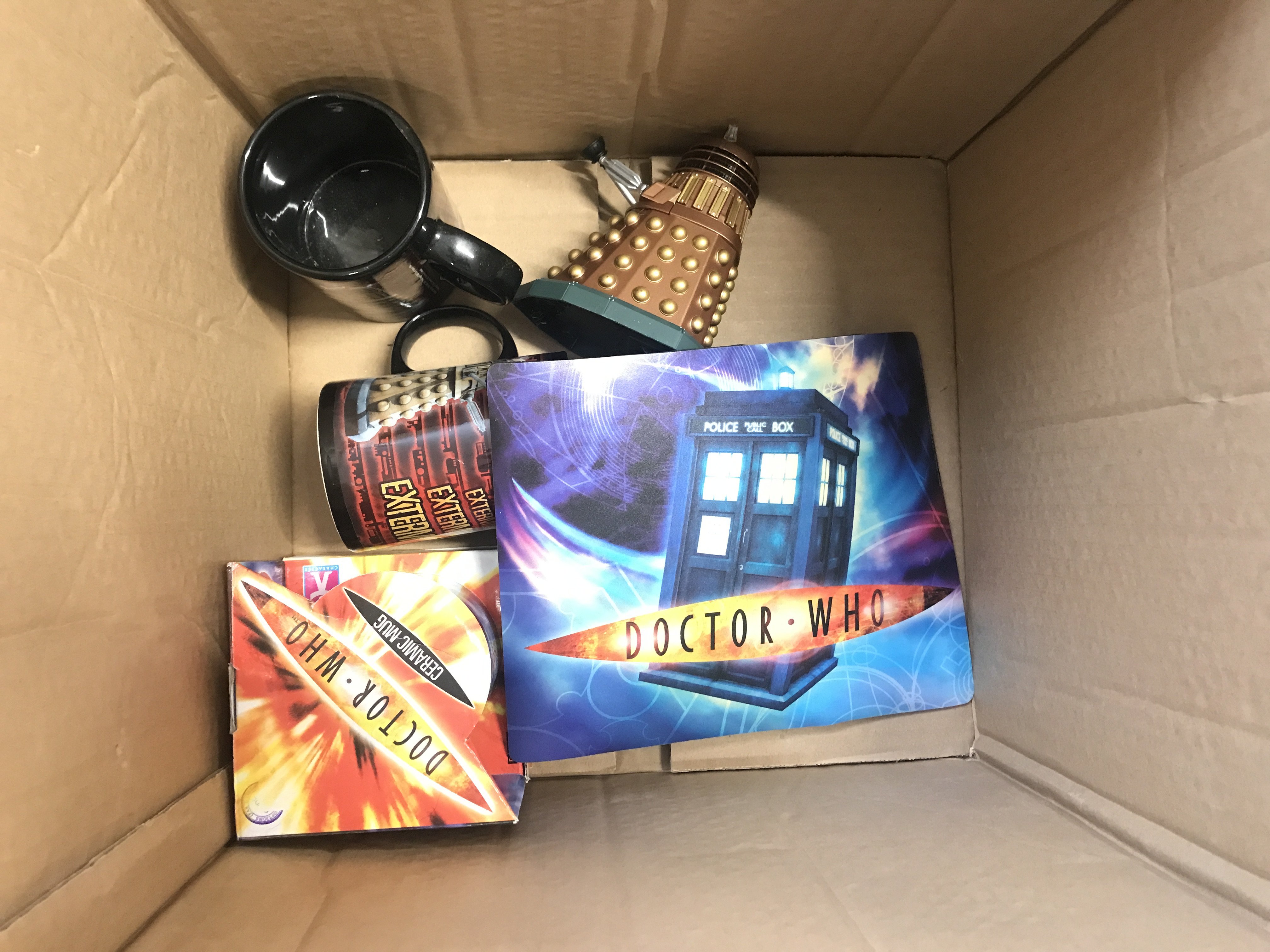 A Box Containing Doctor Who Figures and toys.