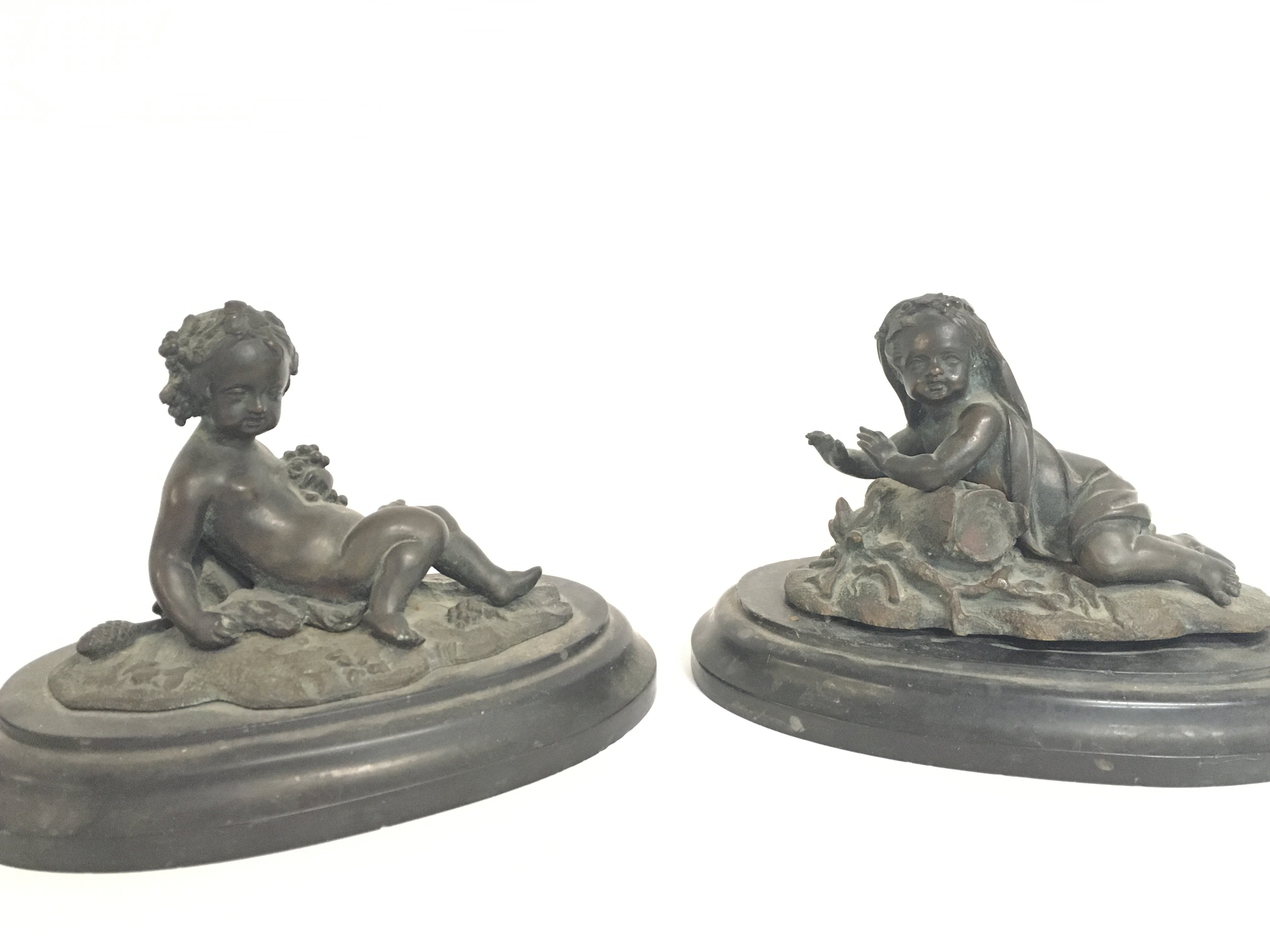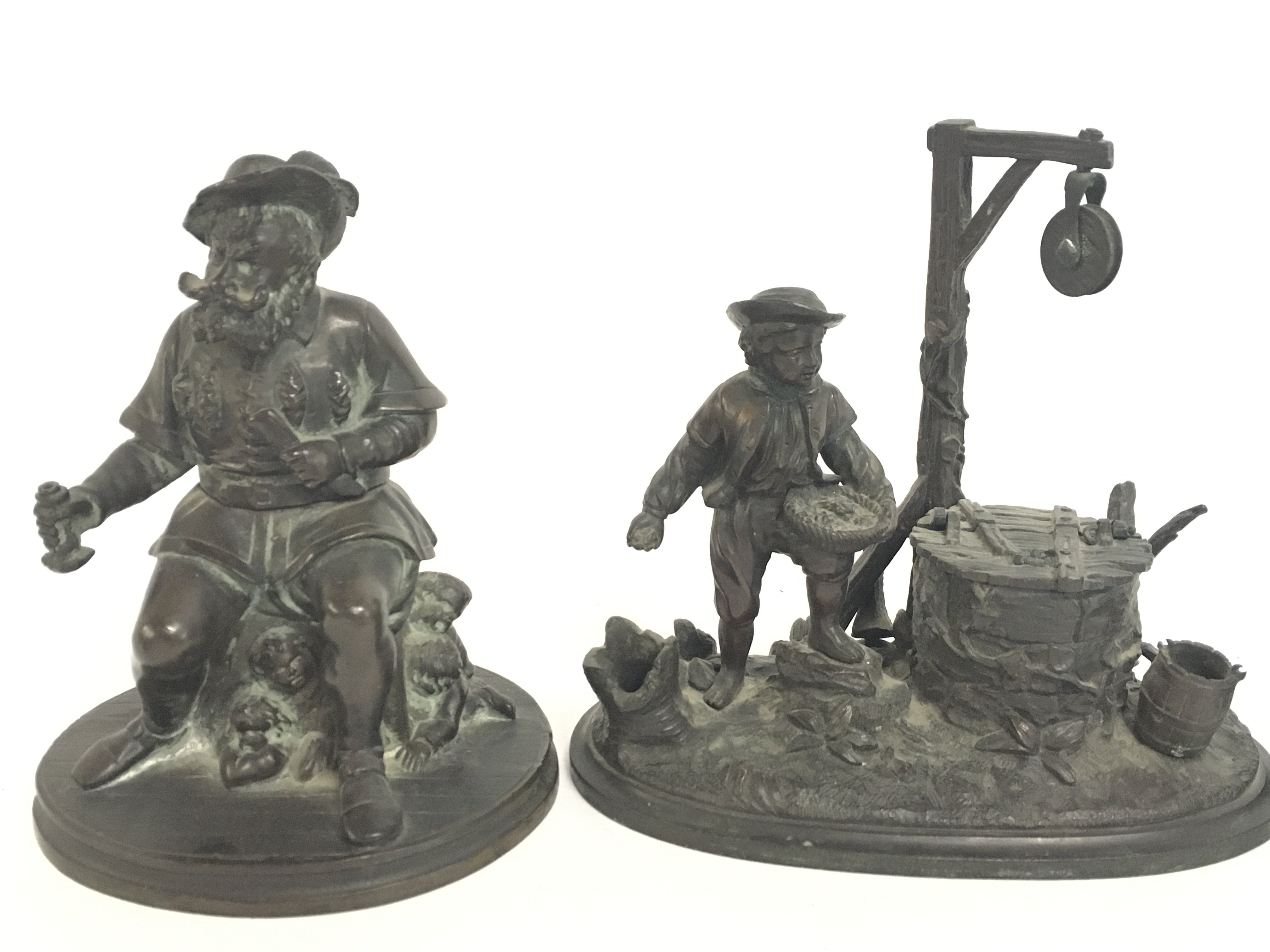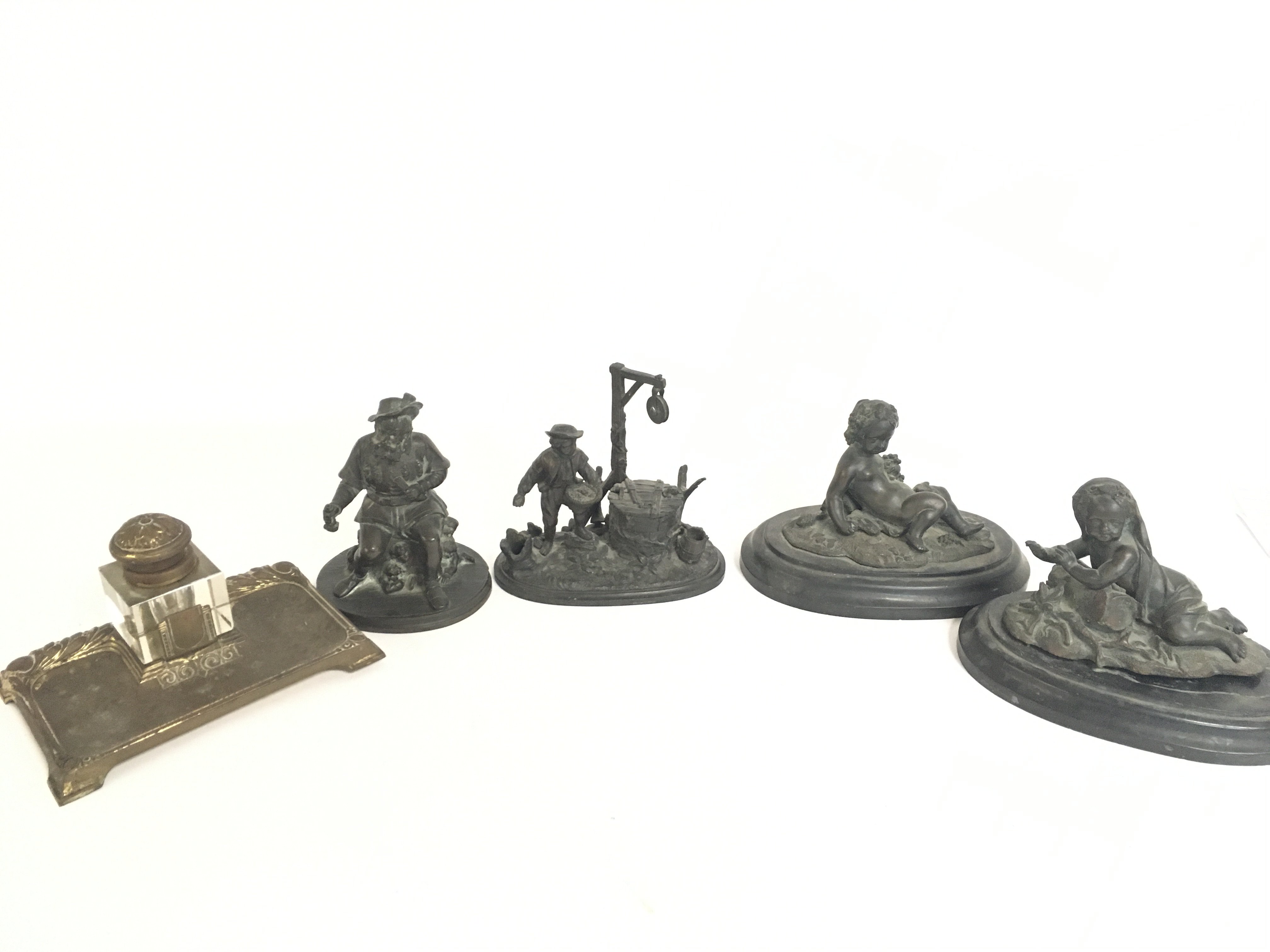 A collection of desk items including late 19th century bronze figures and a brass inkwell. This lot cannot be posted