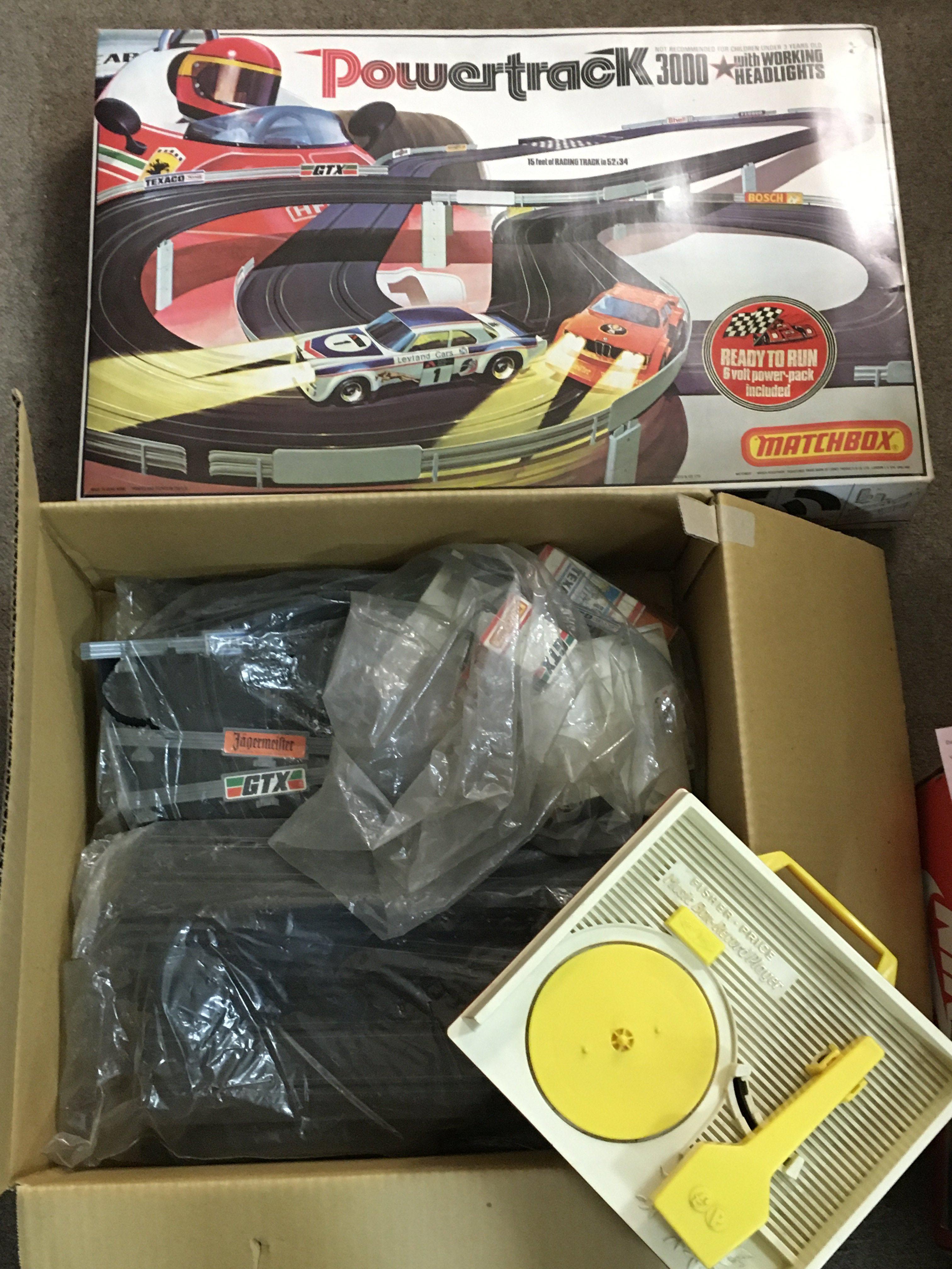 A boxed Matchbox power track 3000 & a Fisher Price Record player