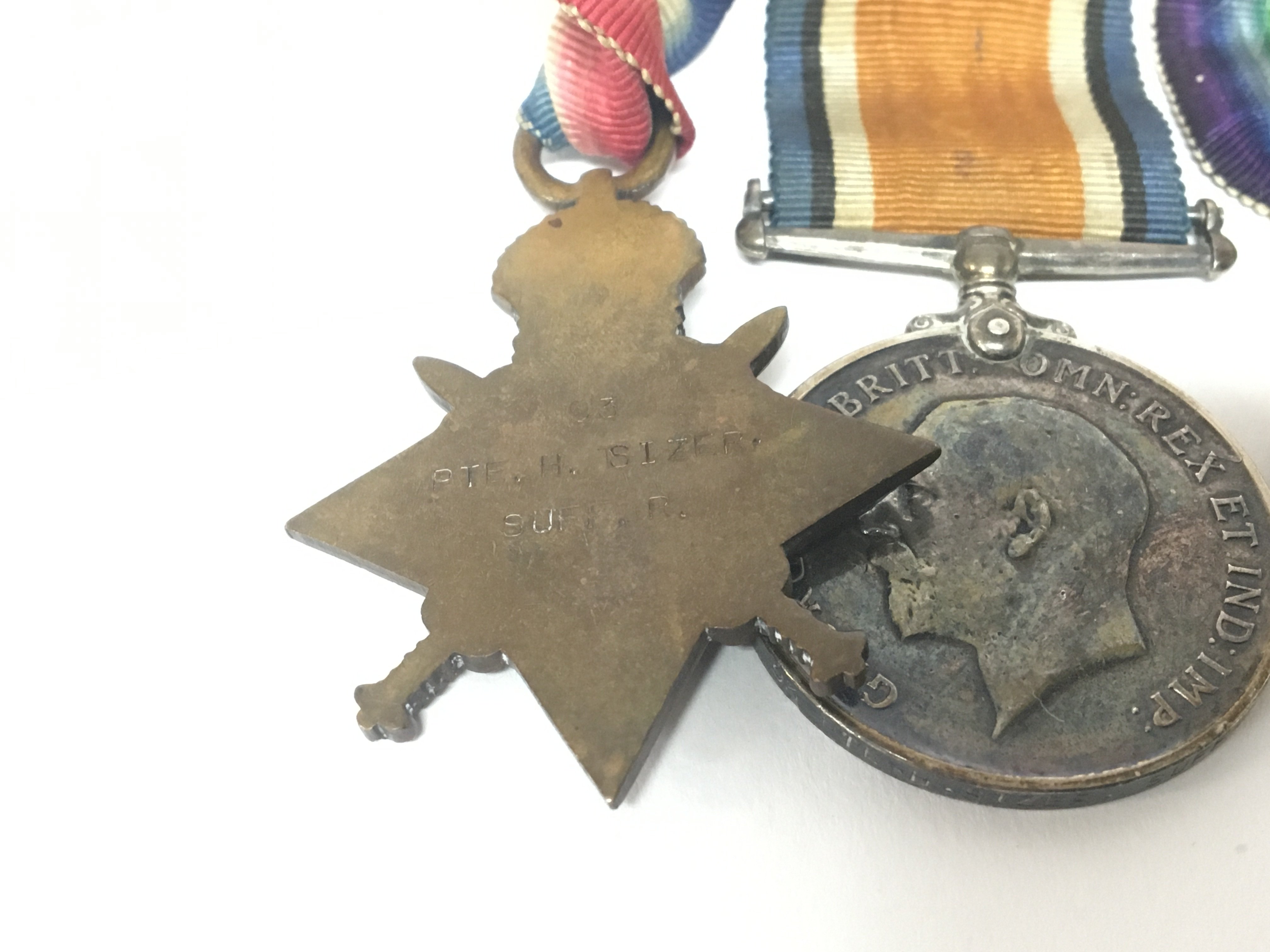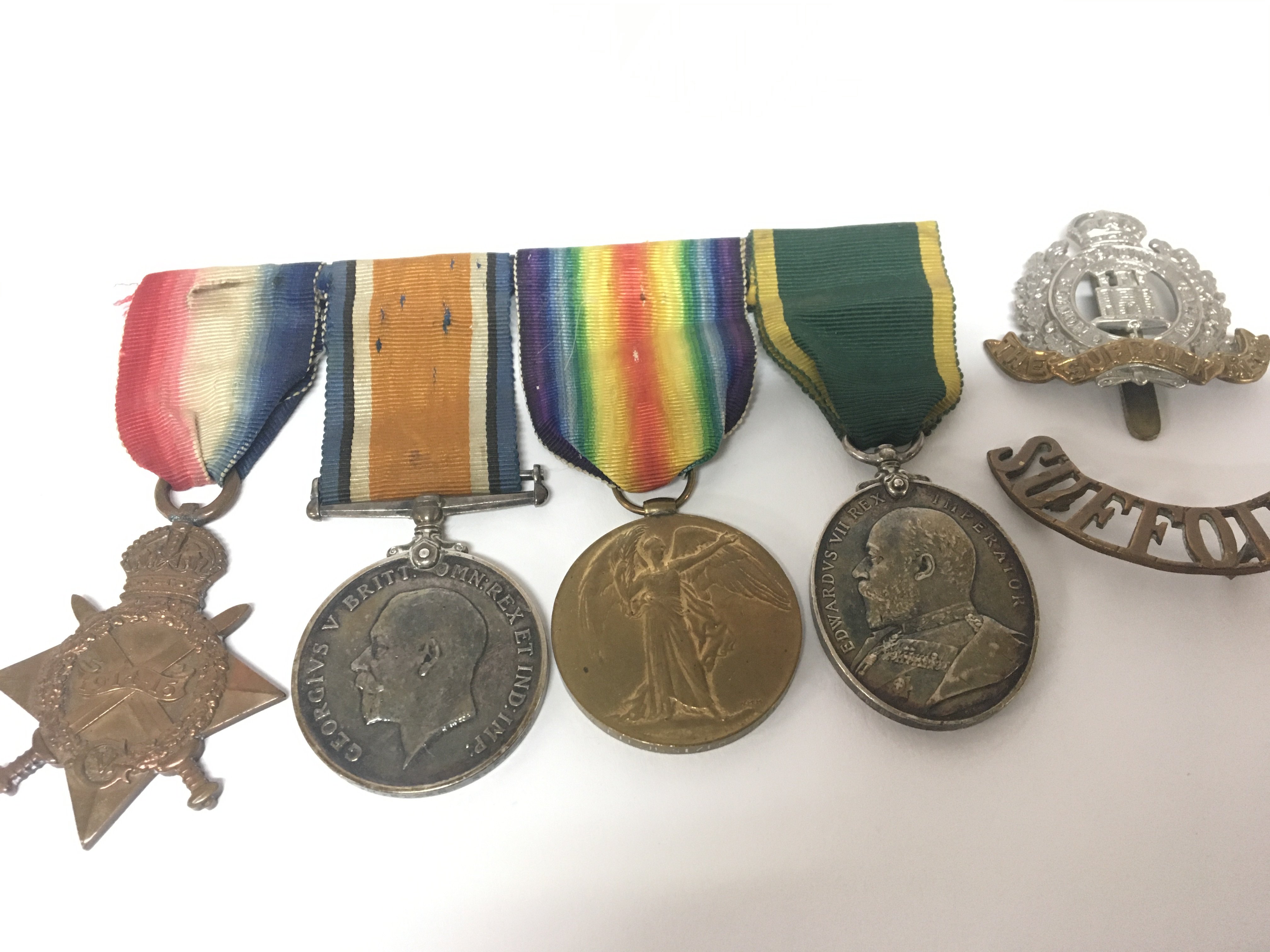 A Group of four First World War Medals awarded to 93. Pte.H Sizer Suffolk Regiment with cap badge and one shoulder badge the group of medals including Territorial Efficiency Medal