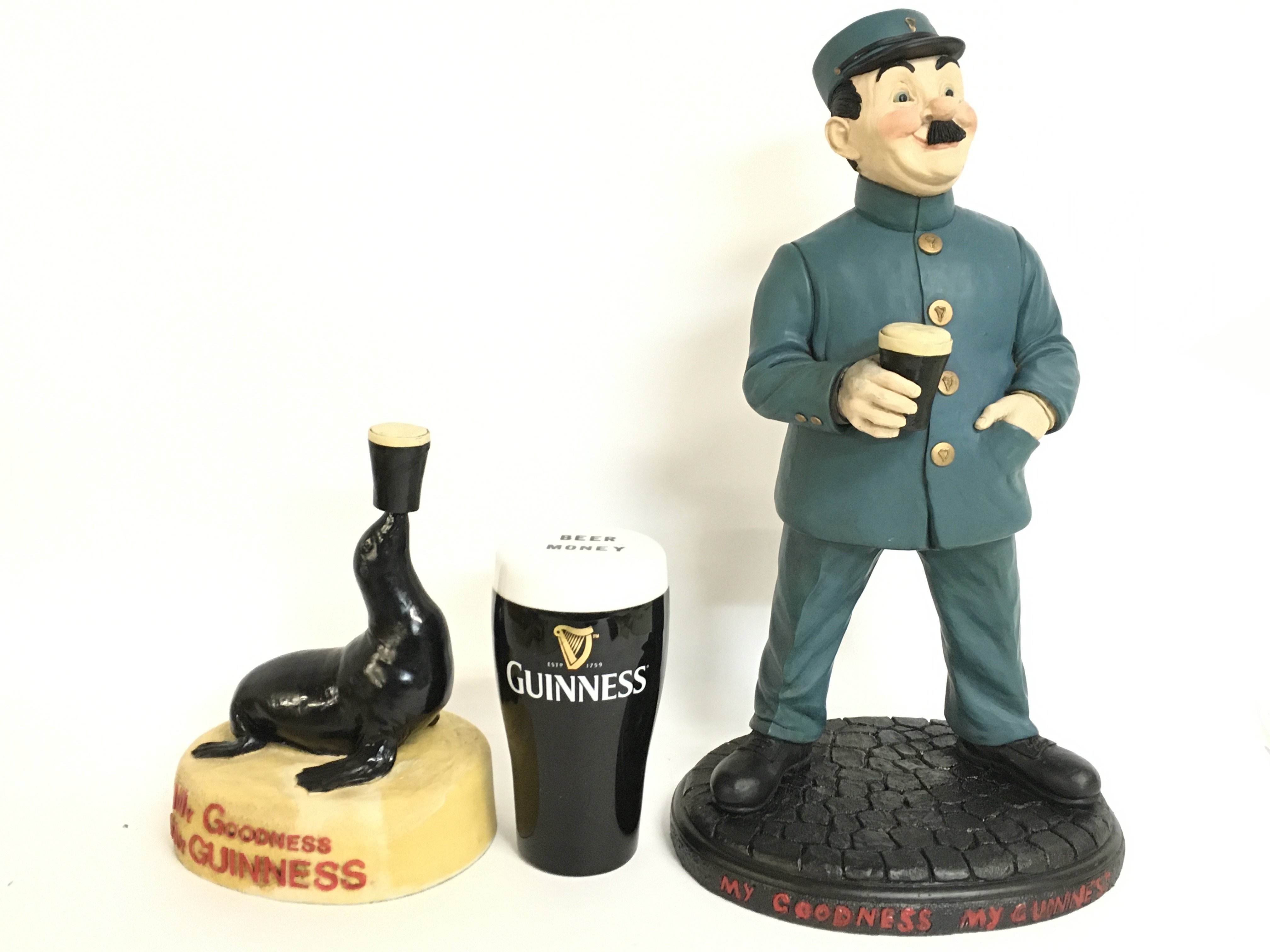 Three Guinness advertising items including a seal figure, Zoo Keeper and a money box (15 to 40cm tall). This lot cannot be posted