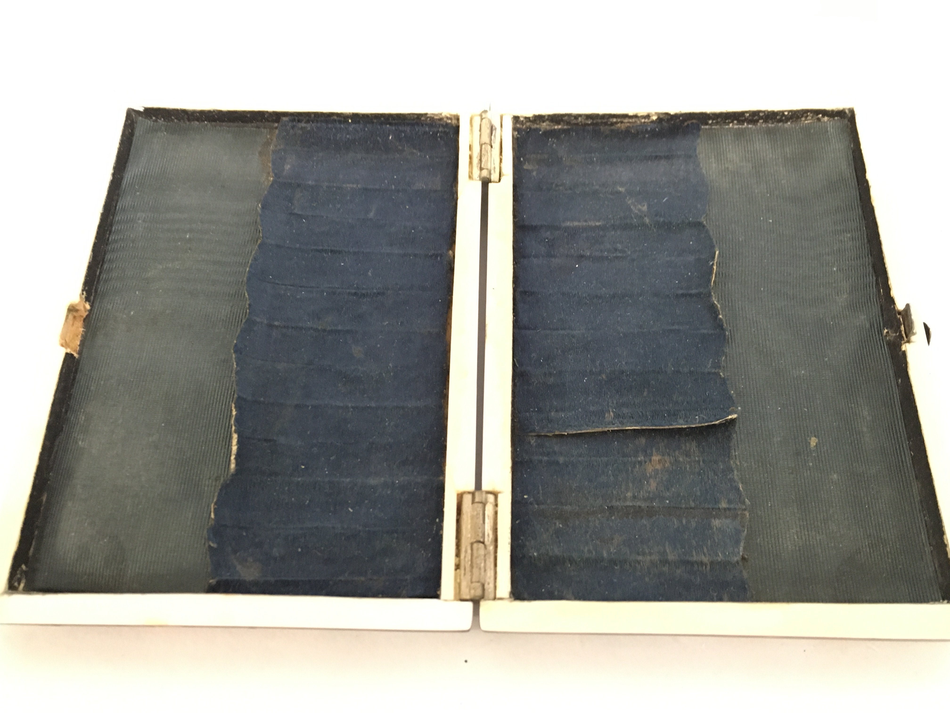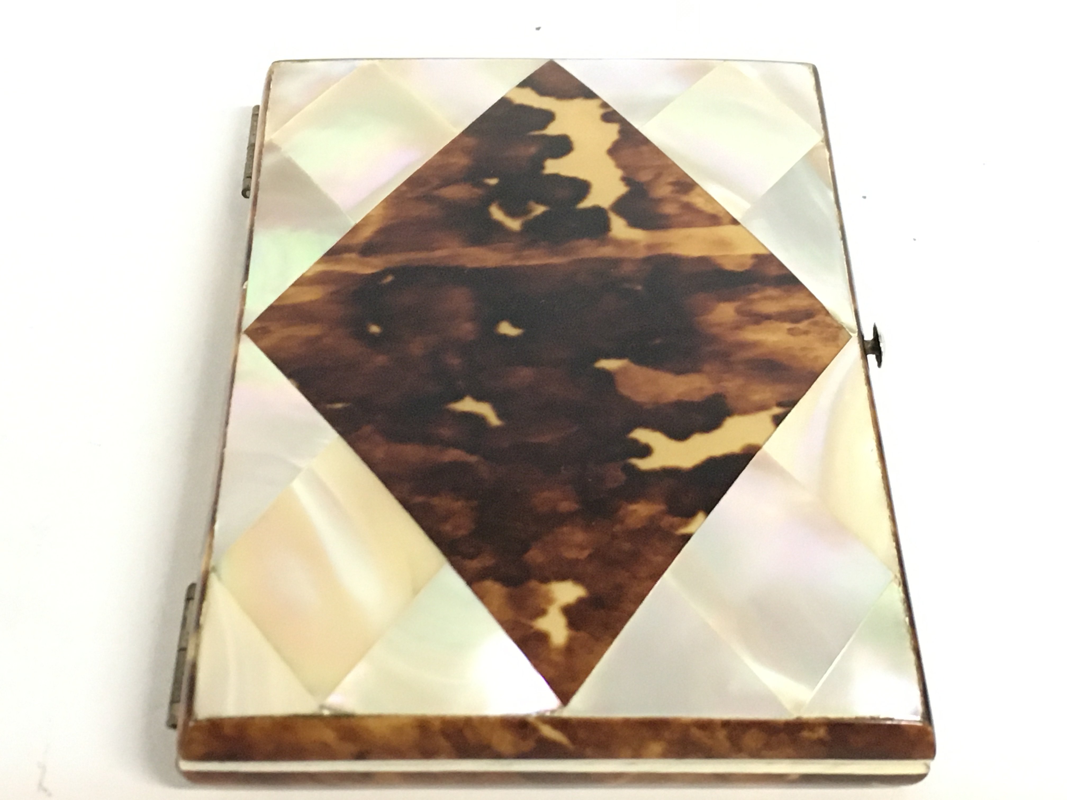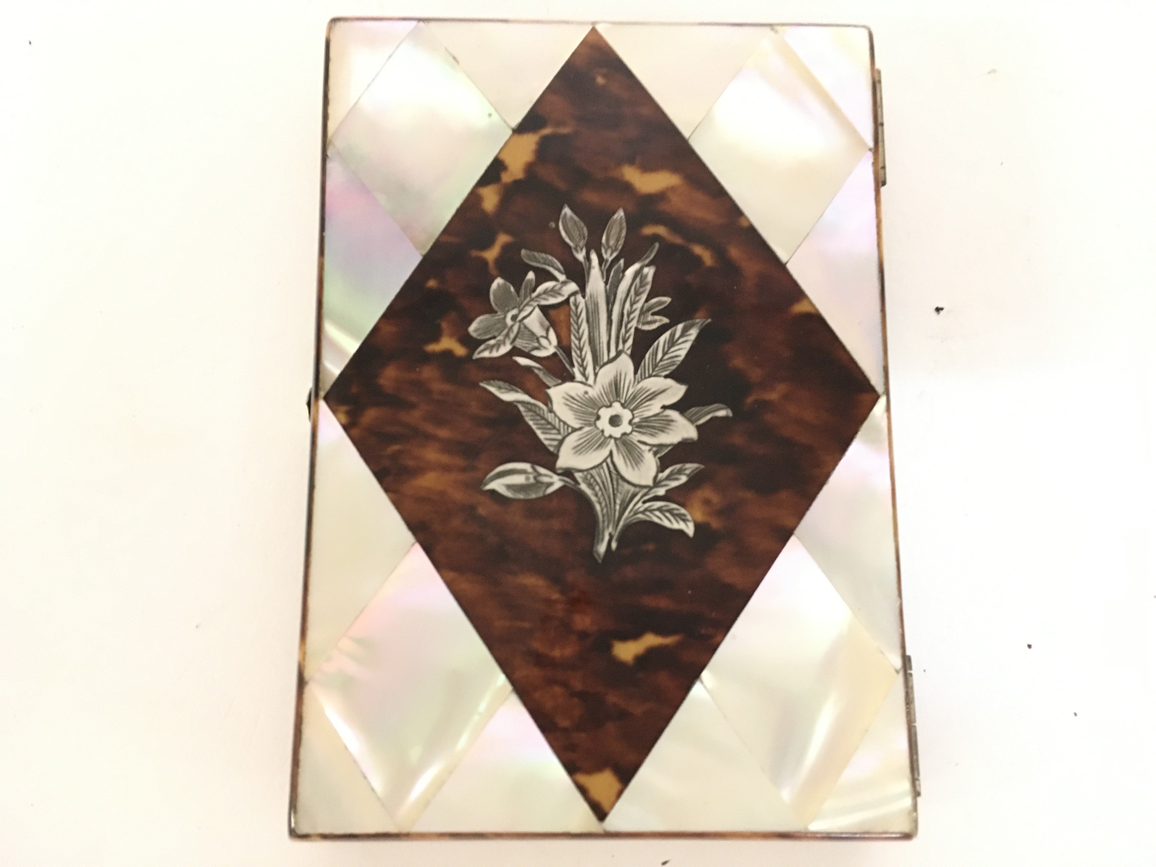 A Mother of Pearl cigarette case with inlaid silver floral design. Approx 8x10cm Postage category A