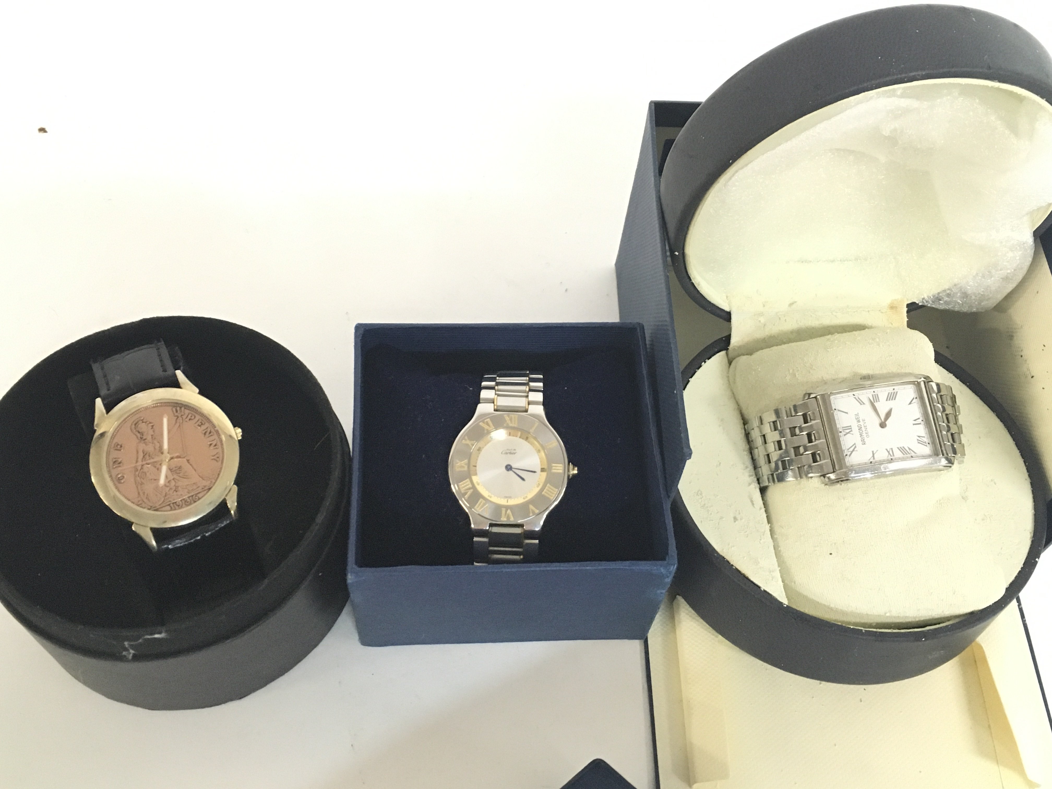 Dress watches including a Cartier Must de watch, Raymond Weil Geneve, Penny watch. Postage category B