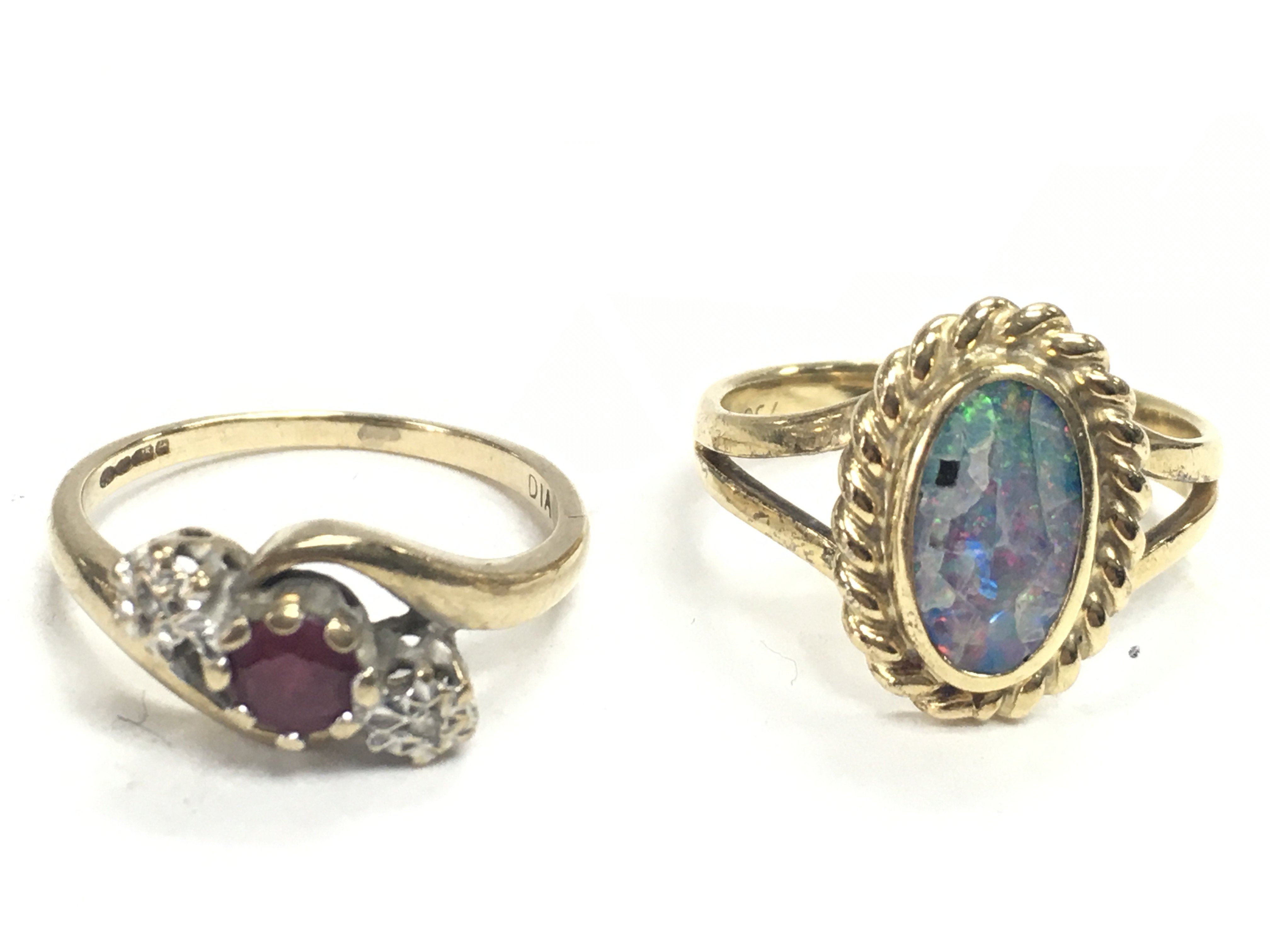 Ladies rings including an 18 carat gold ring set with an opal stone (3.6g ) & a 9 carat gold ring set with a ruby and diamond shards (2g). Postage category A