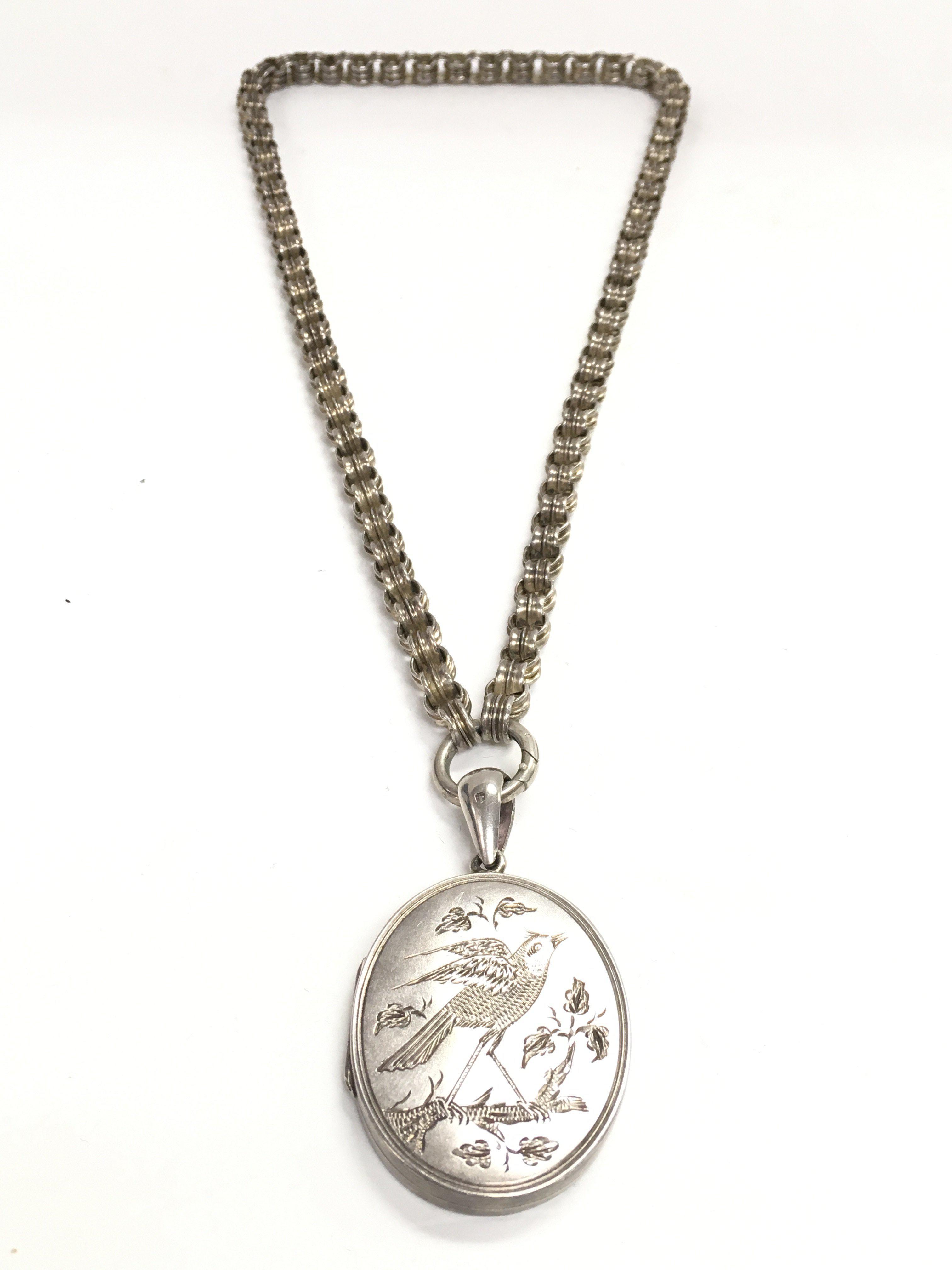 An early 20th century silver hallmarked song bird locket and chain. Postage category A