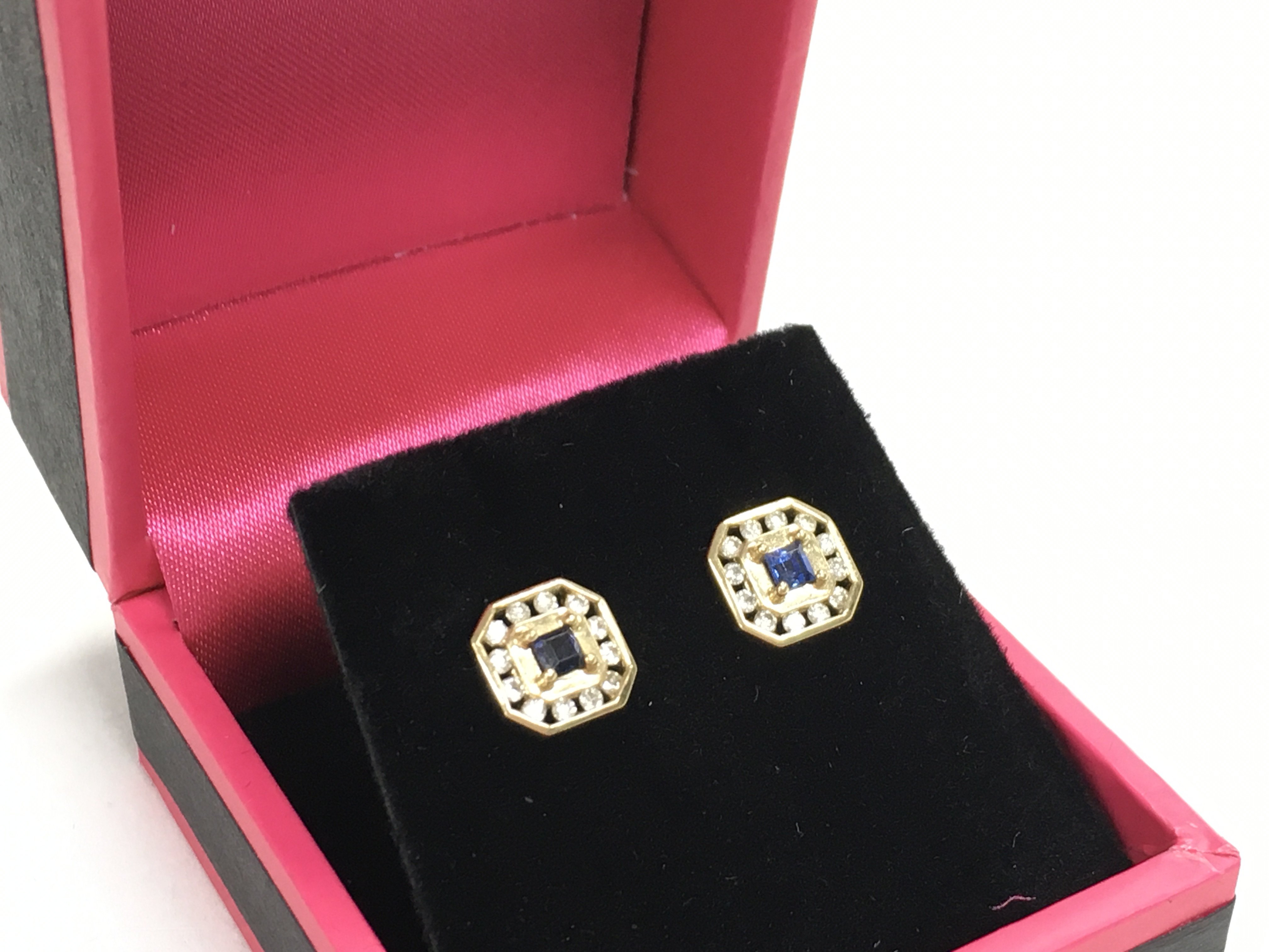 A pair of 9 carat earrings set with a central sapphire surrounded by diamond stones. 1.7g total weight Postage category A