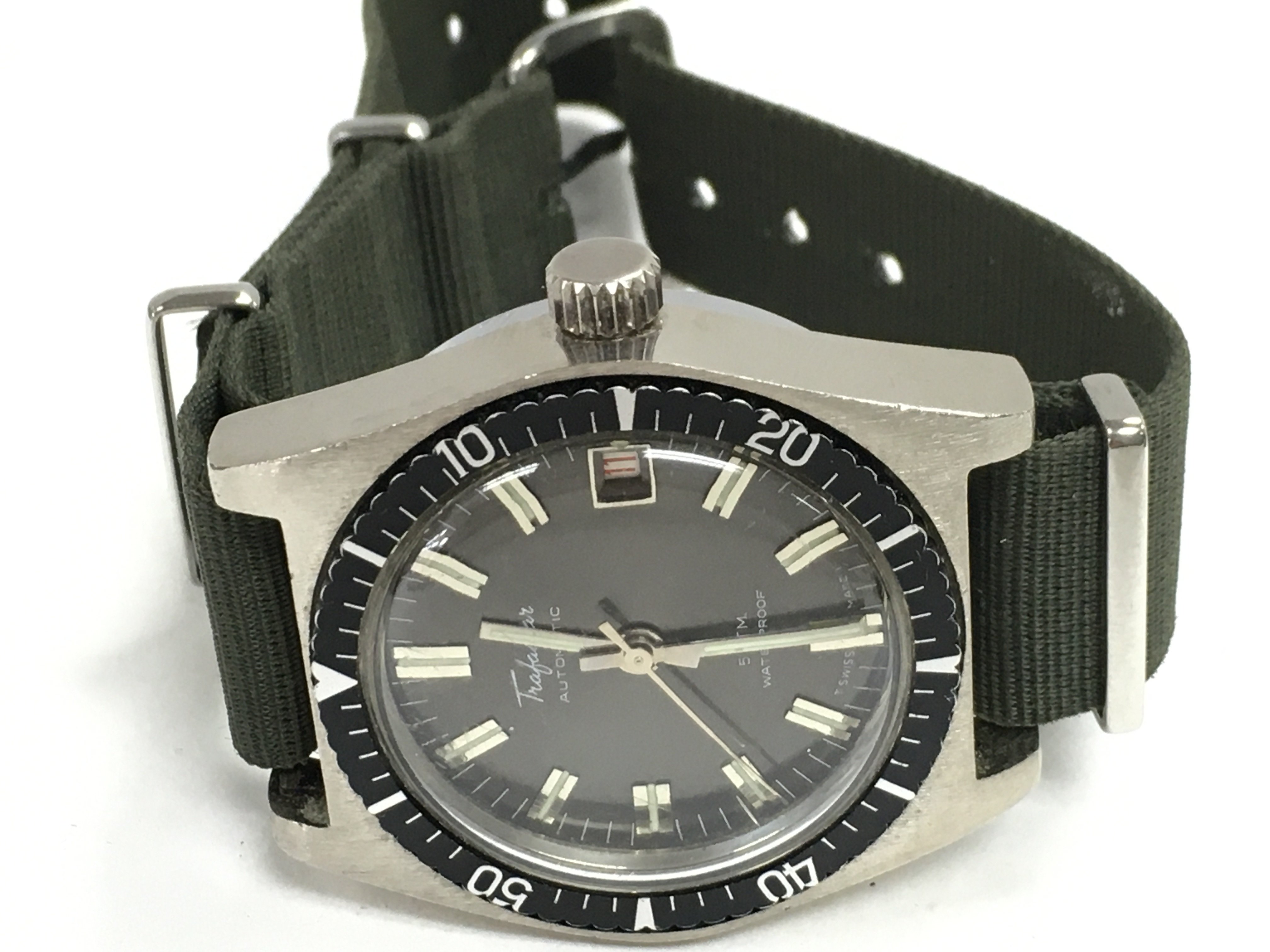 A Trafalgar 5 ATM date Gents automatic wristwatch with illuminous hands on a green nato strap, Circa 1970s. This lot cannot be posted