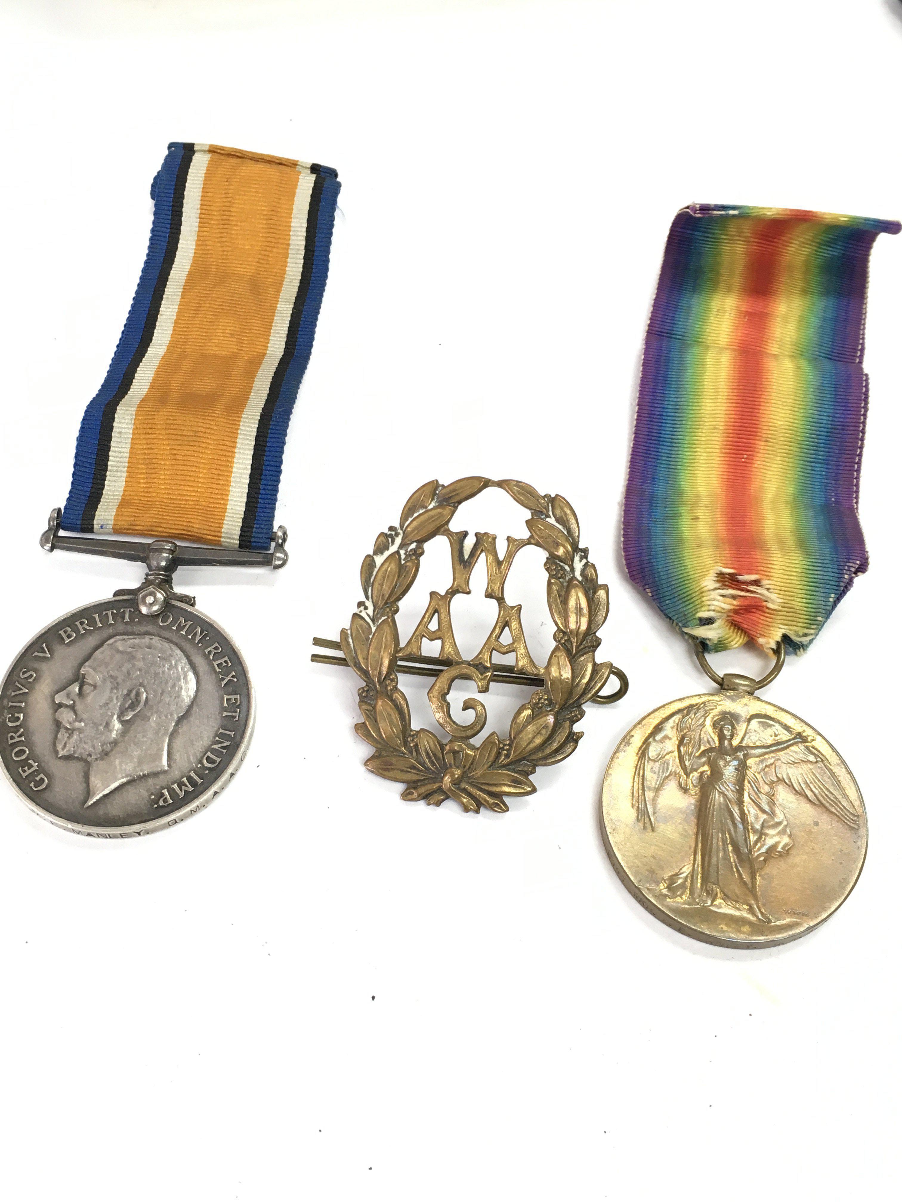 WW1 medals victory and defence presented to WKR.M.E MANLEY.Q.M.A.A.C & a Queen Mary Womens army auxiliary corps cap badge. Postage category a