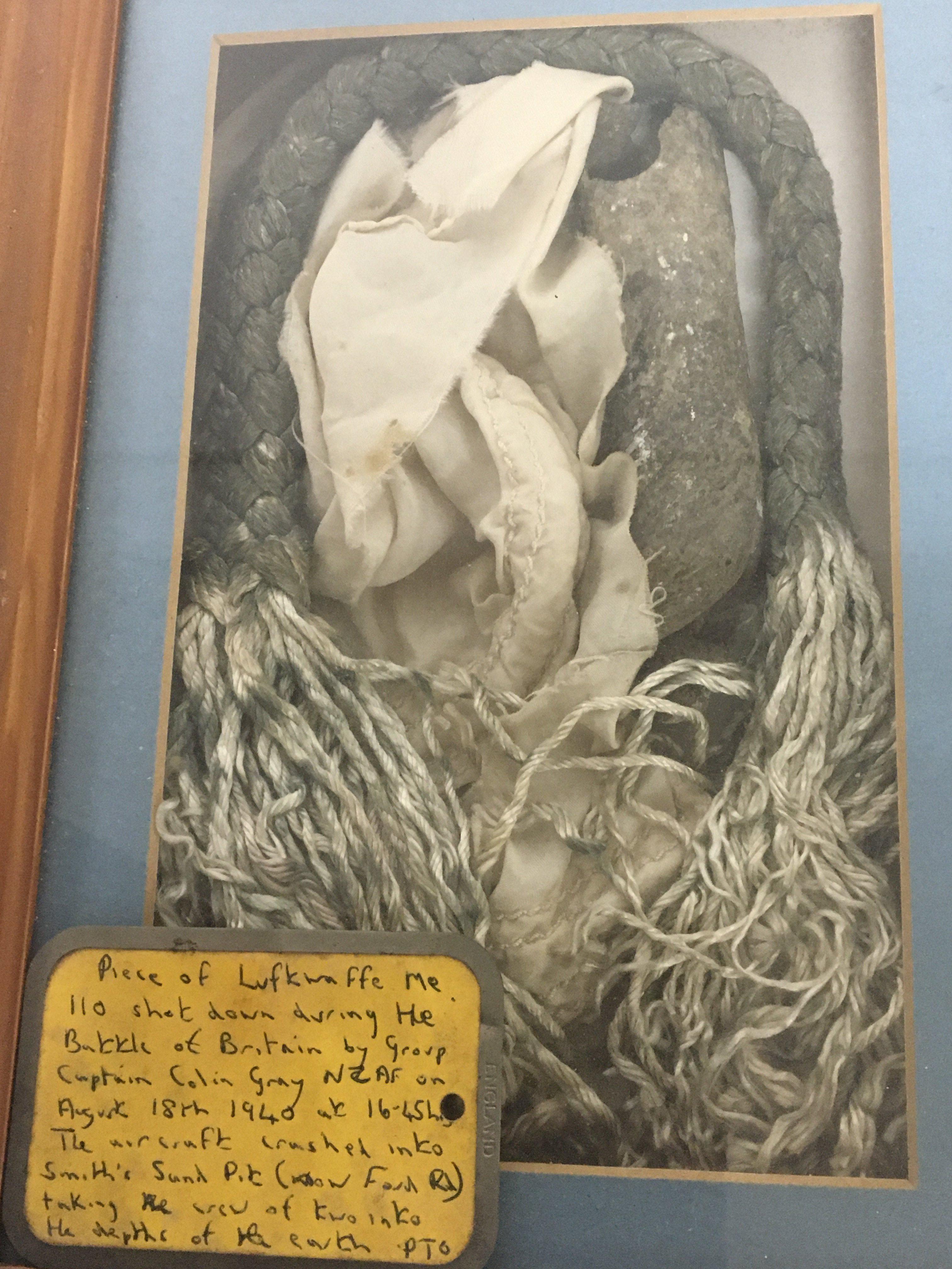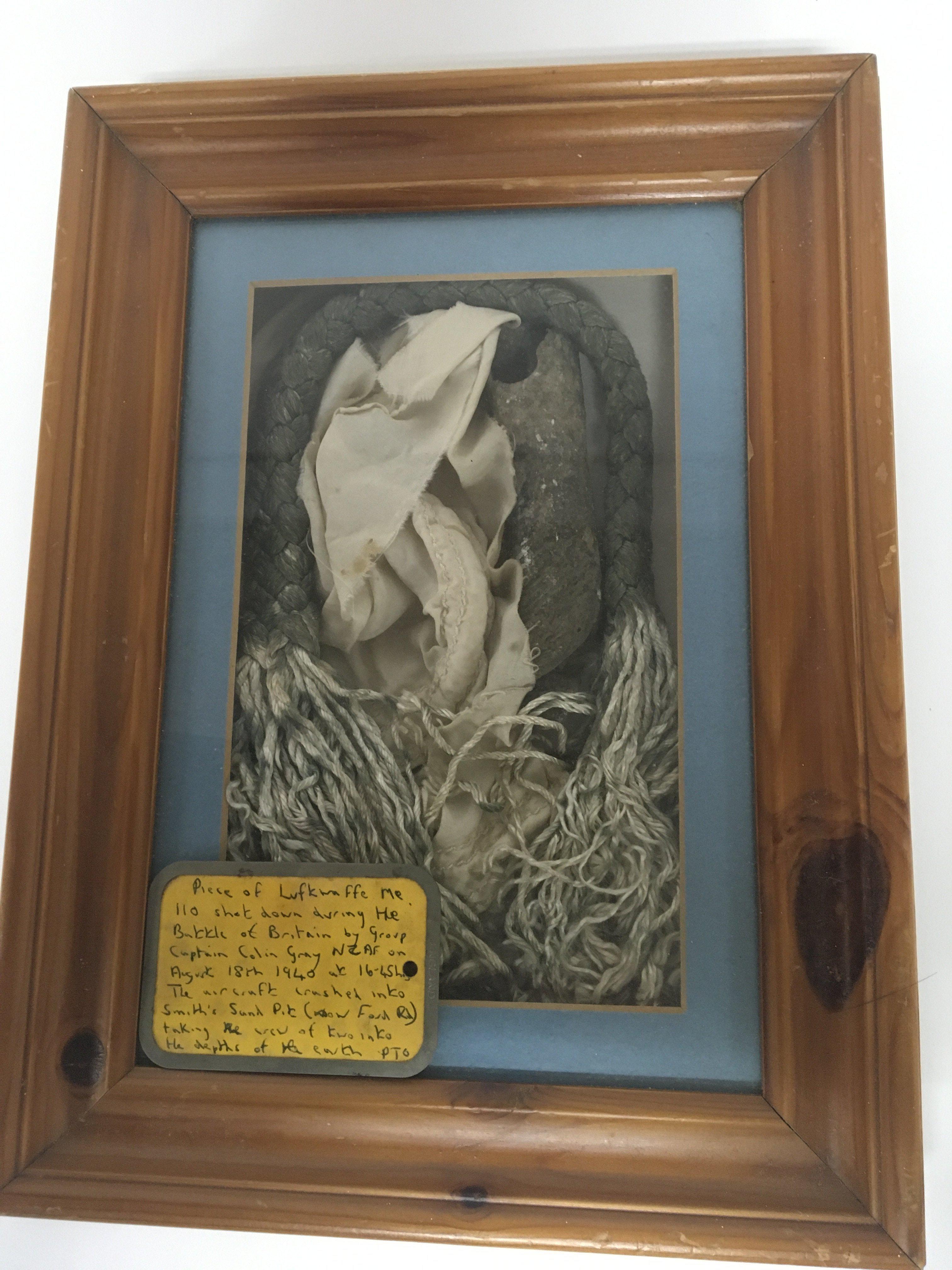 A framed World War ll fragment believed to be from a German Aircraft shot down on August 18th 1940. With attached written inscription.