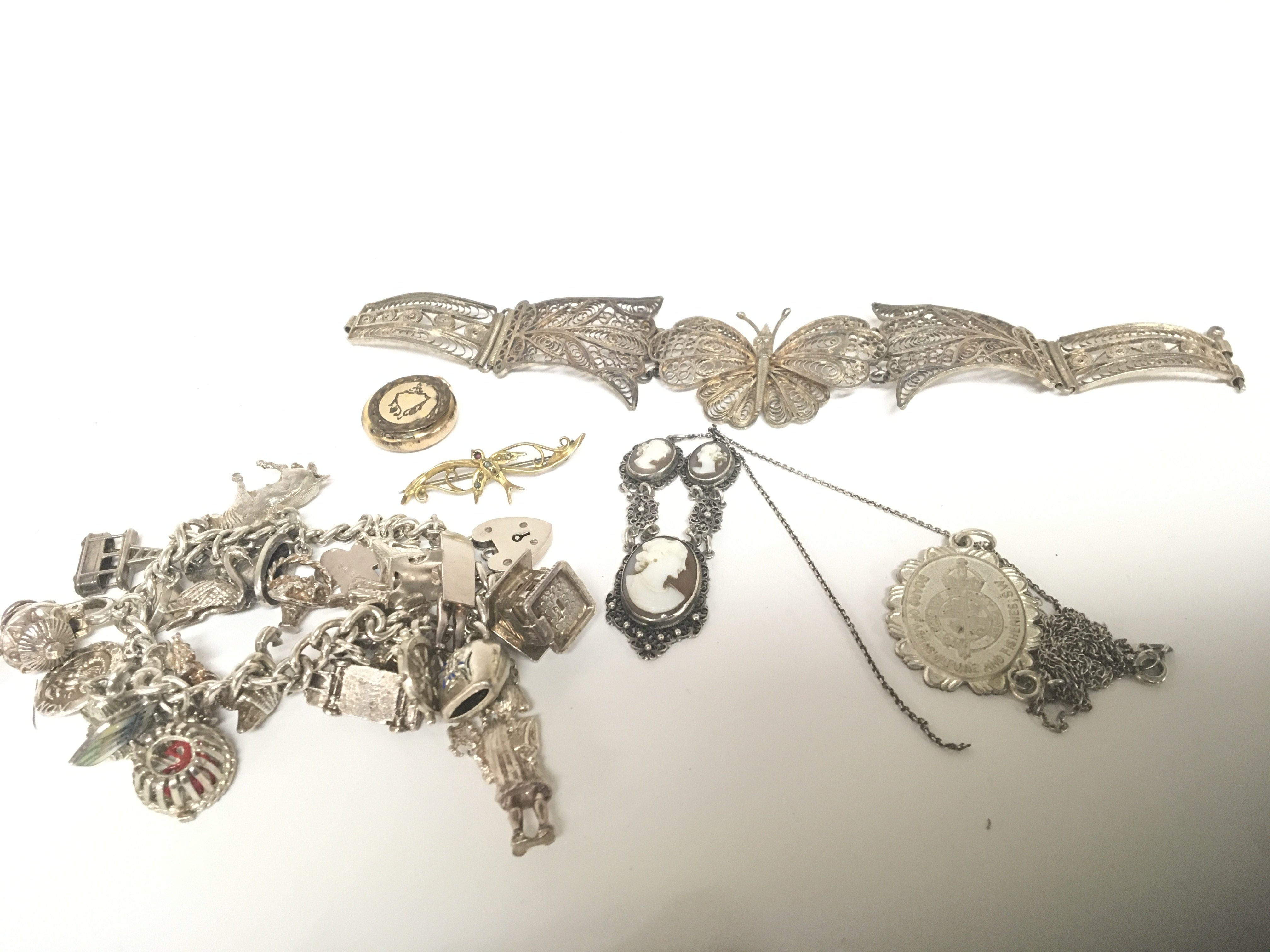 A Silver charm bracelet a 9carat gold brooch weight 1.3g other white metal and silver jewellery and an oval locket.