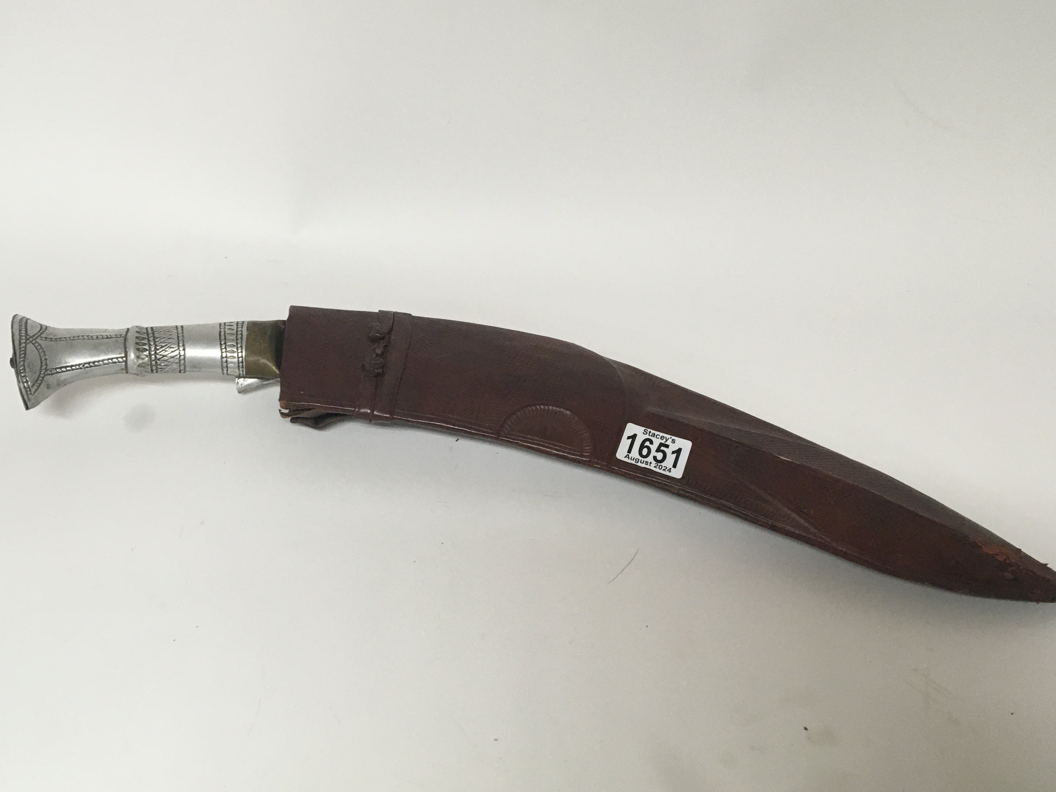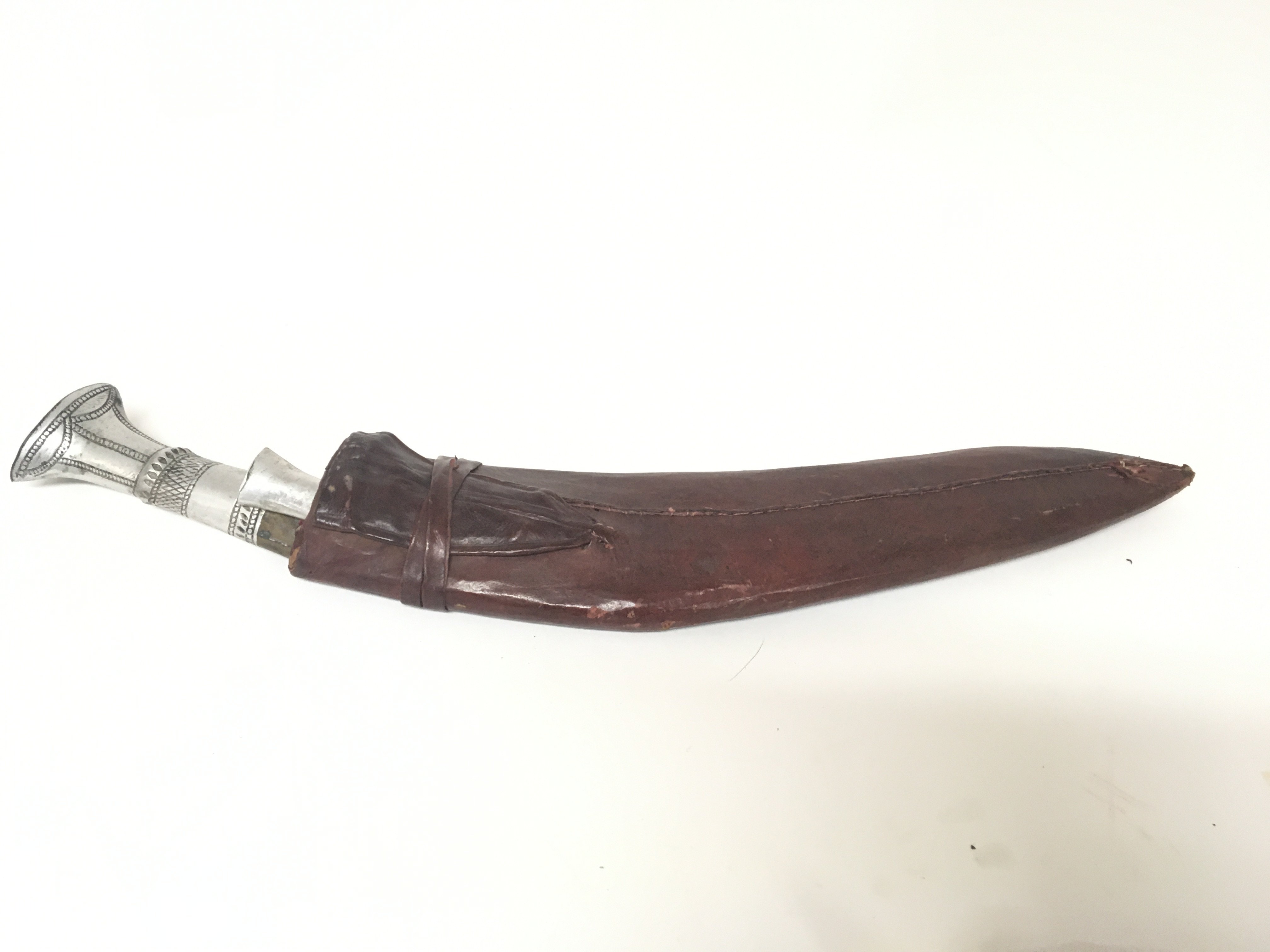 A large old Kukri Knife in a patterned leather scabbard with a silvered handle and small side knifes.length 60cm