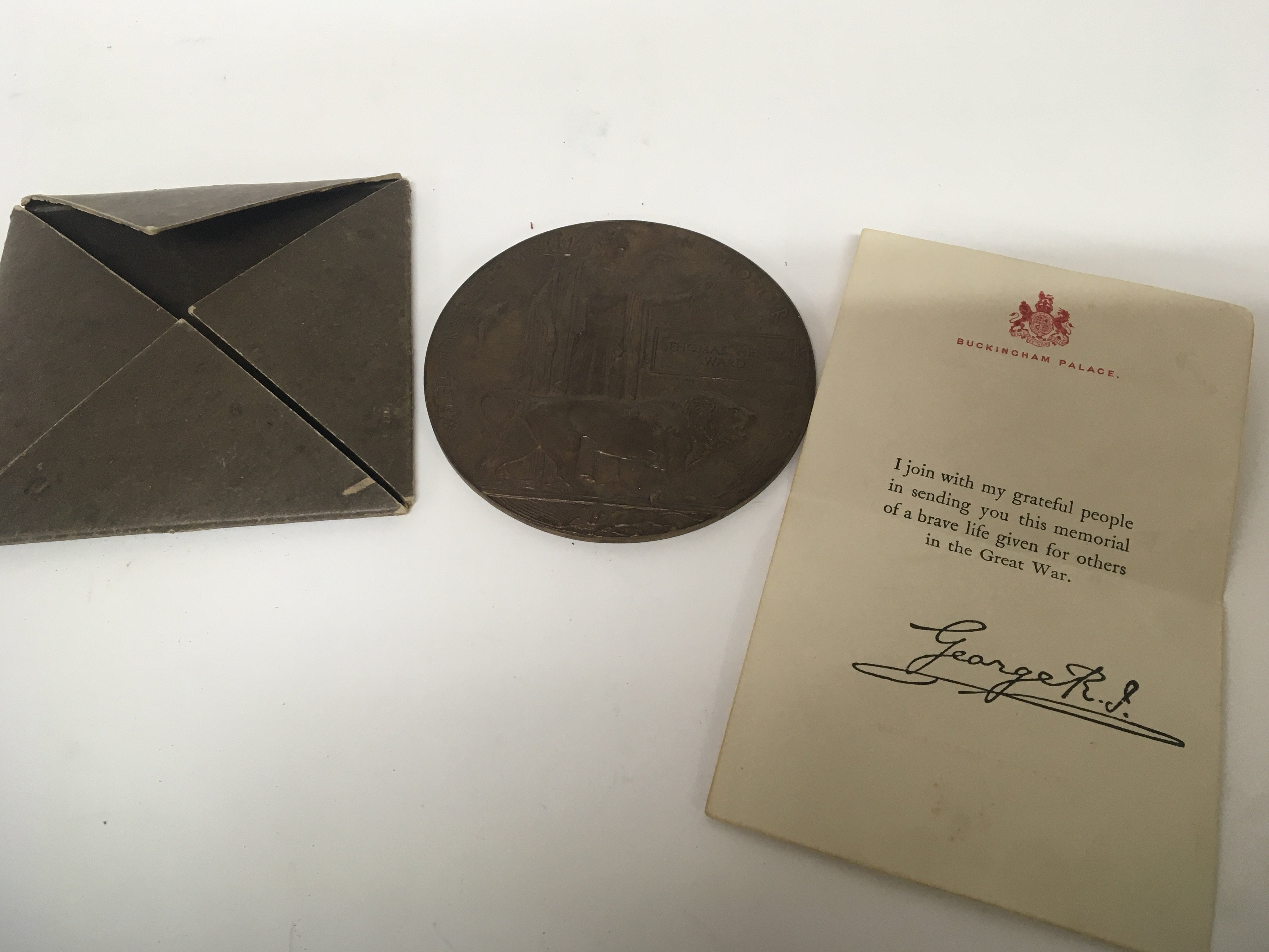 A First World War Memorial Plaque retrospectively awarded to the family of Thomas Henry Ward Killed in action with accompanying letter from the King. And outer cover.