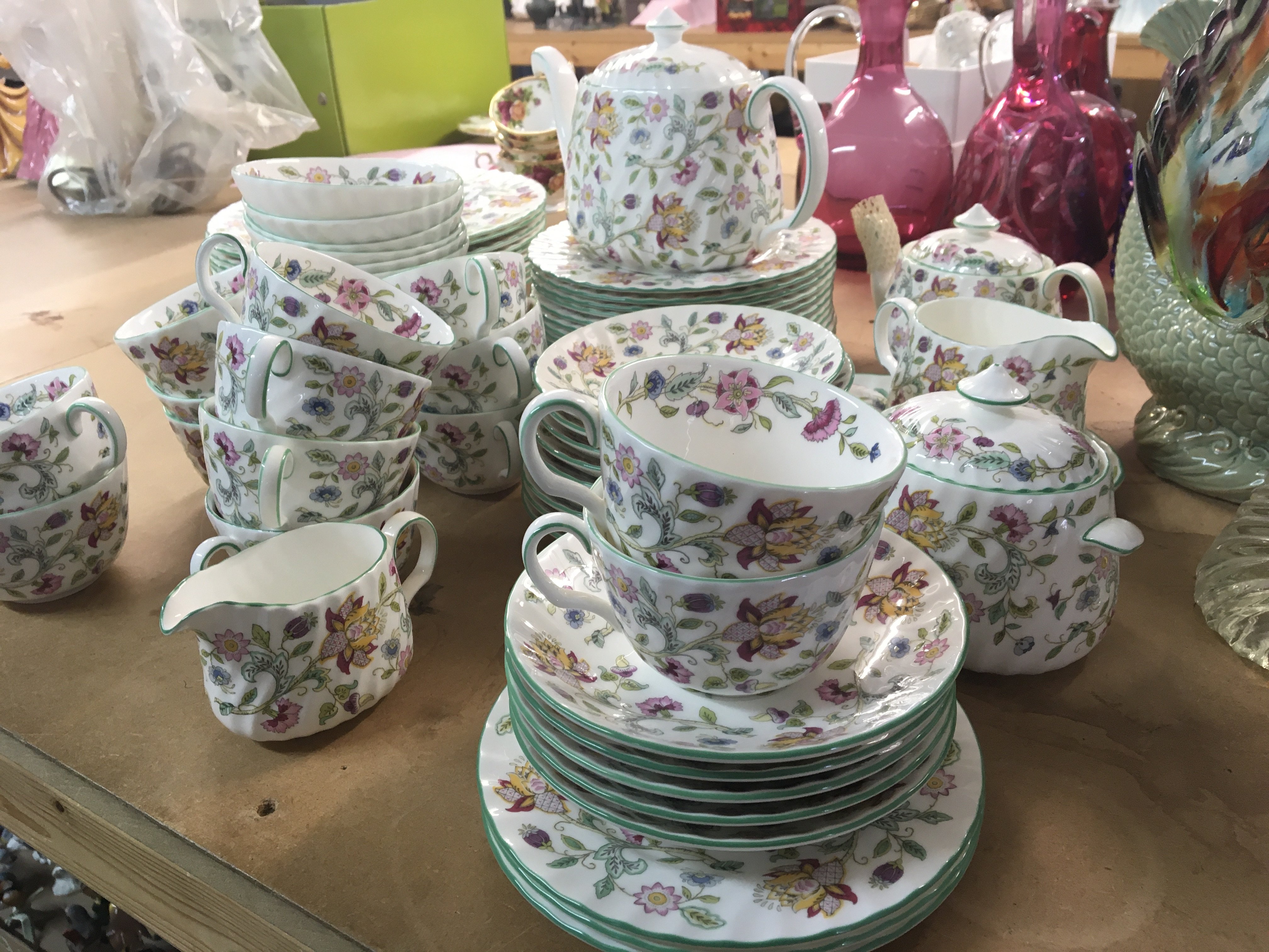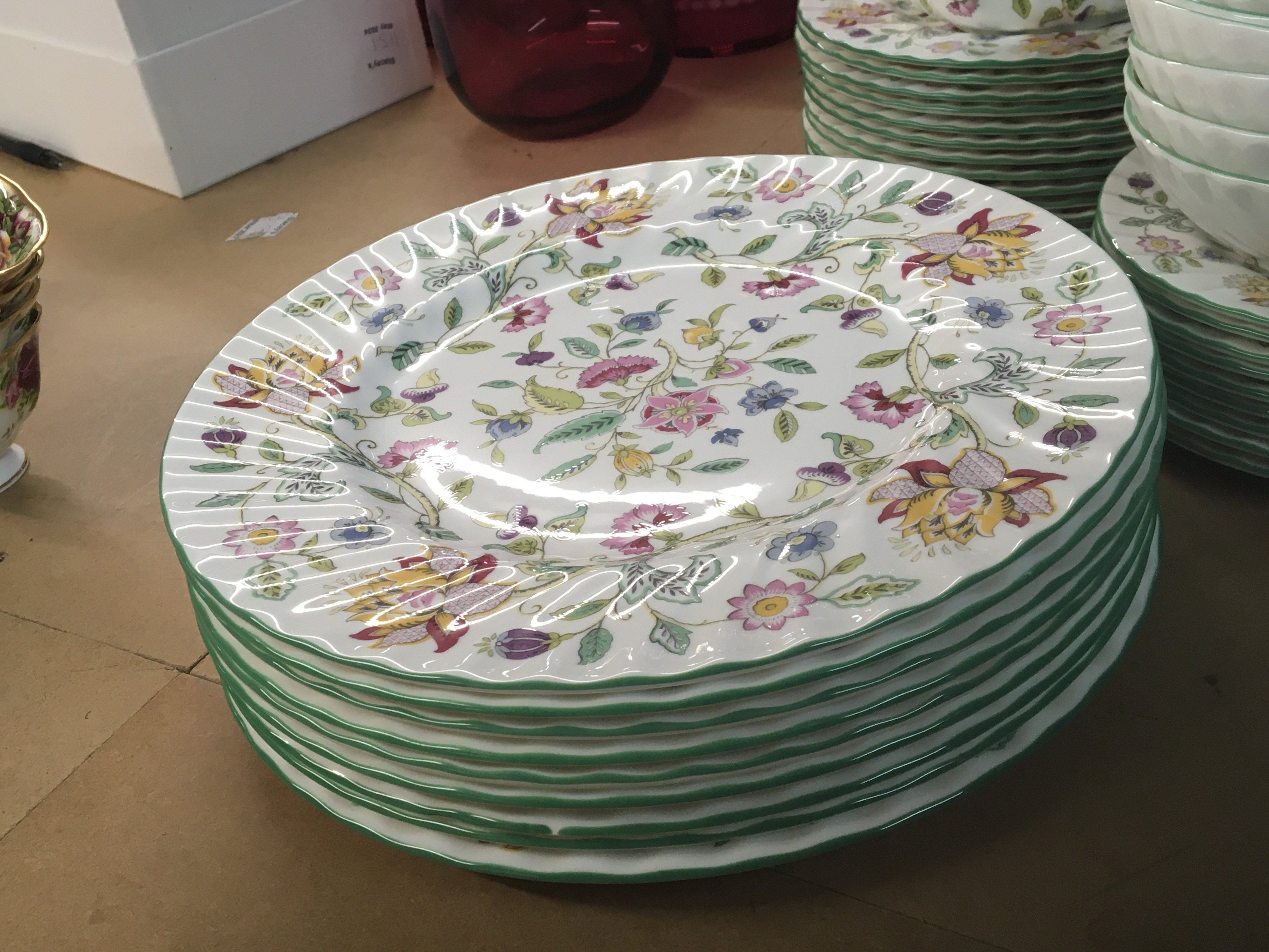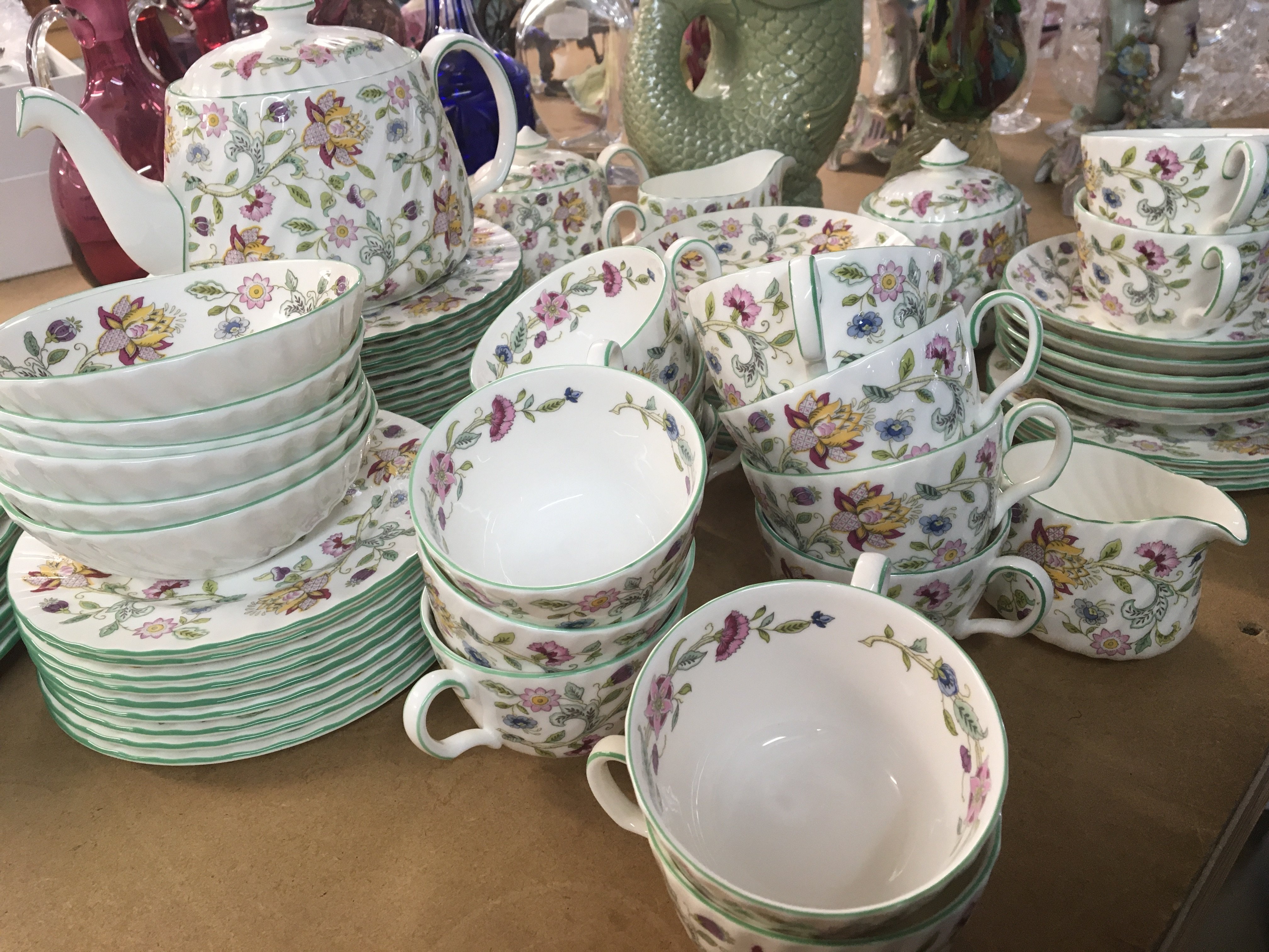 A Minton porcelain dinner and tea service Haddon Hall pattern with flowers on a white ground some second quality, no obvious damage nine dinner plates side plates fourteen cups fourteen saucers tea pot and more.