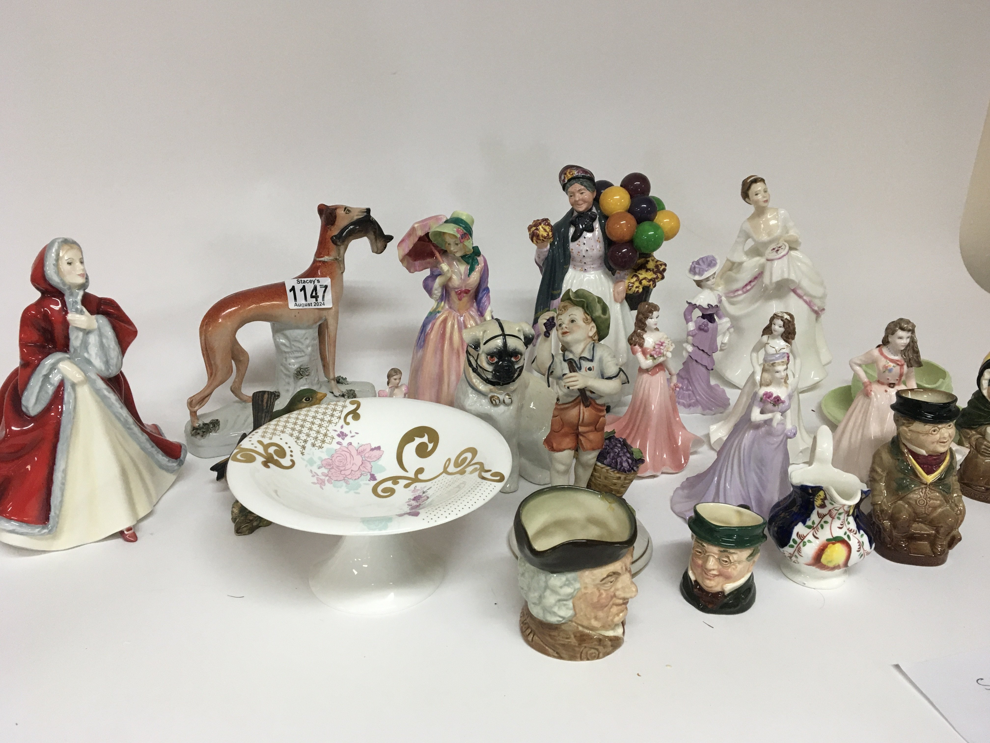 A collection of Royal Doulton lady figures Caricature jugs and other ceramics.